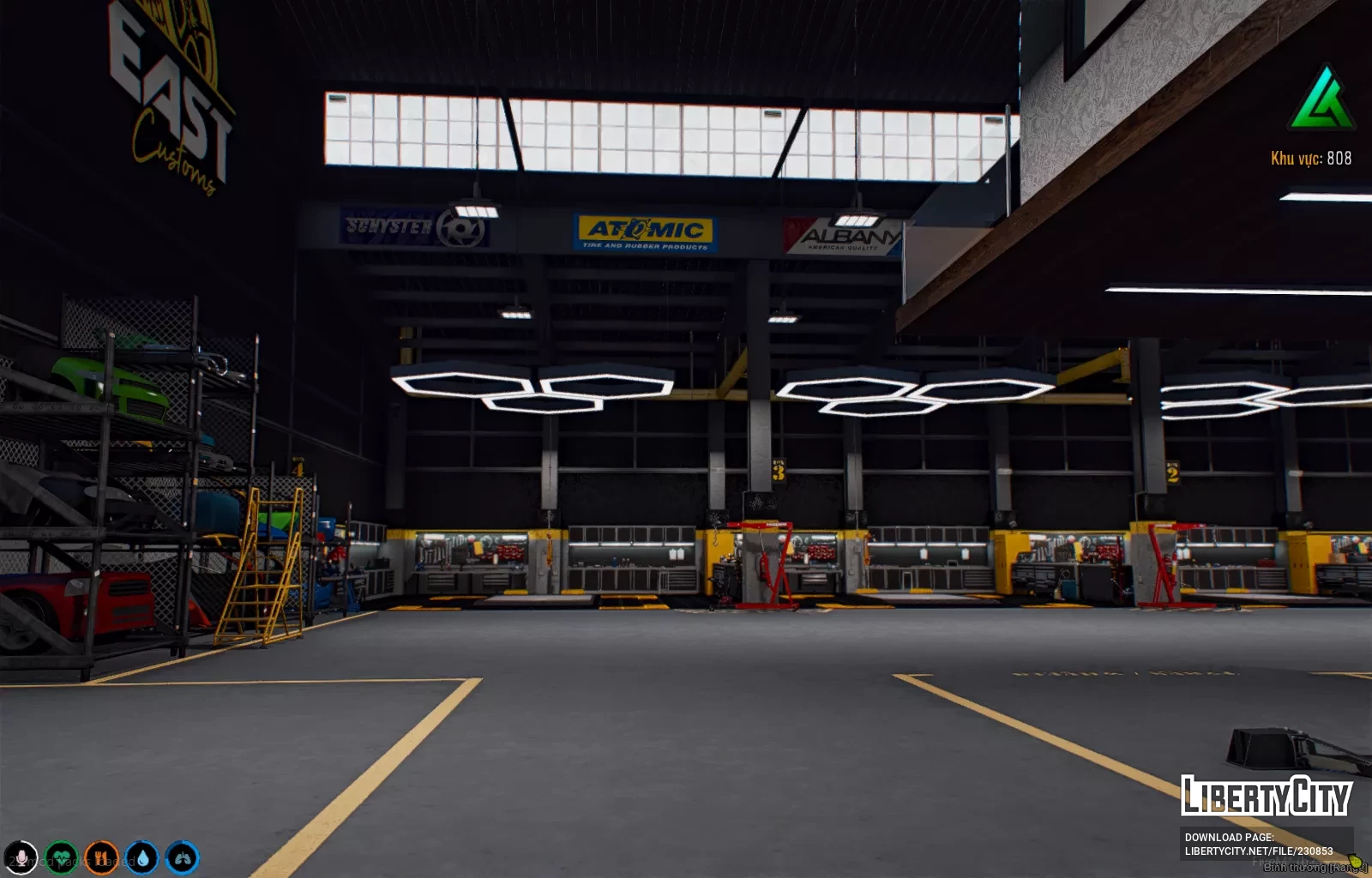 Здание гаража выполнено из красного кирпича и имеет индустриальный стиль. Фасад украшают высокие арочные ворота с черными металлическими роллетами, которые занимают большую часть стены. Над воротами установлены промышленные светильники. Перед входом находится небольшая вывеска с логотипом автосервиса. Территория гаража огорожена невысокой кирпичной стеной, а перед зданием расположен просторный асфальтированный двор с навесом для автомобилей. Вокруг видны другие промышленные постройки и элементы городской инфраструктуры, что подчеркивает рабочую атмосферу этого места.