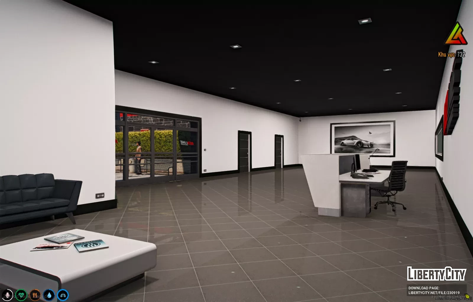 Входная зона и подъезд к сервису вымощены асфальтом, территория ограждена невысокой кирпичной стеной. На территории есть парковочные места и отдельная зона для въезда автомобилей. Вокруг здания растут аккуратно подстриженные кусты и зелёные насаждения.