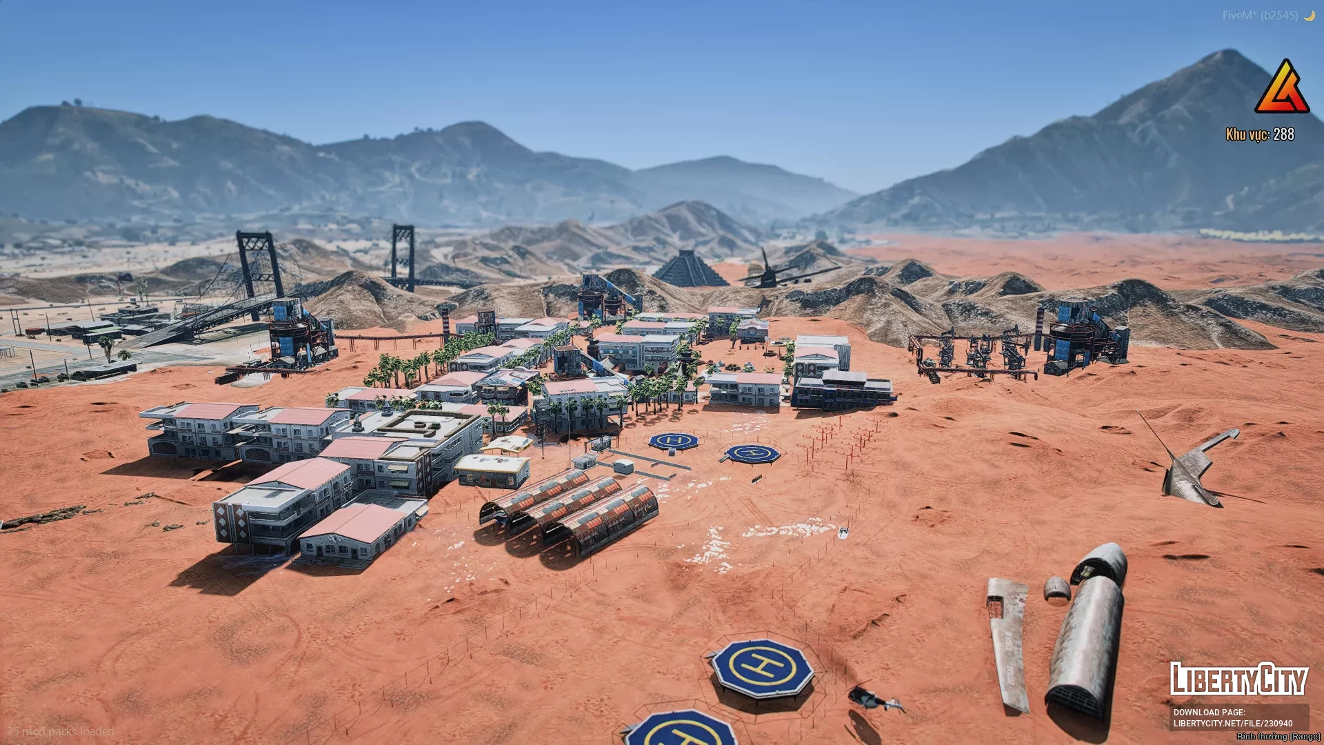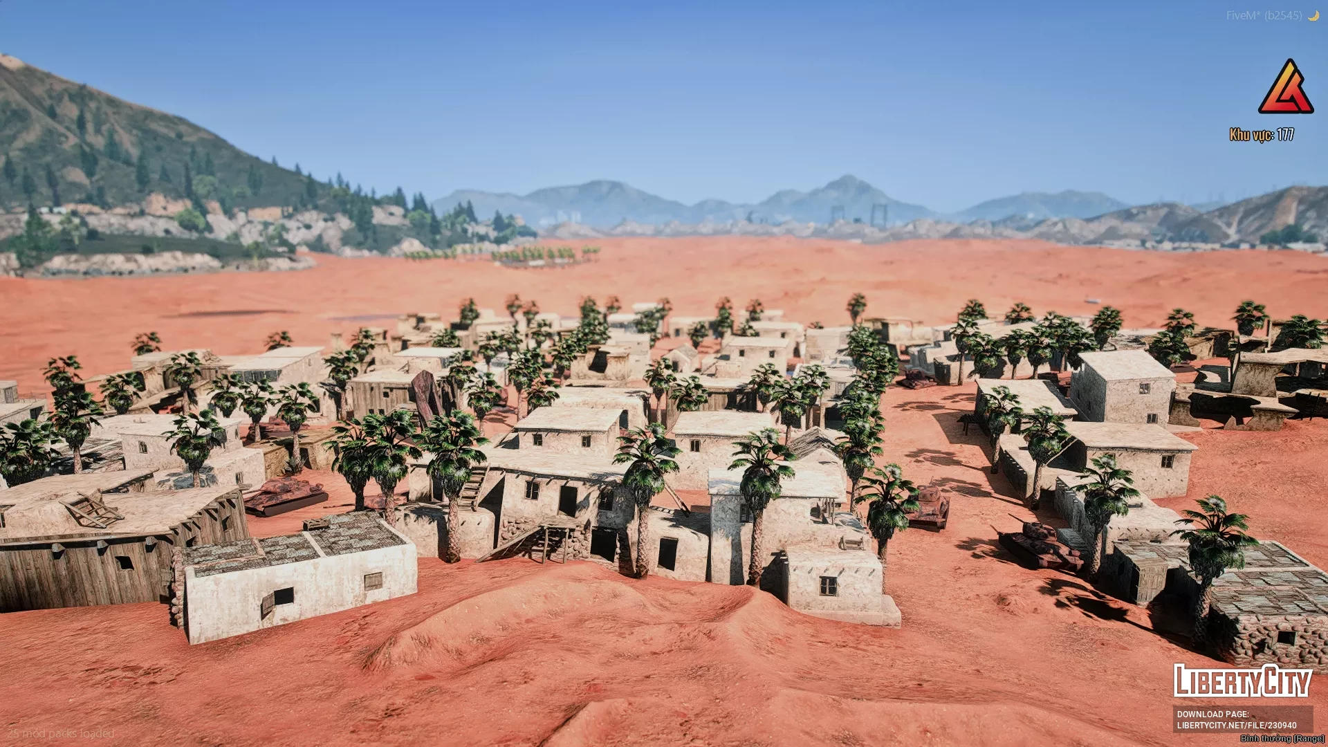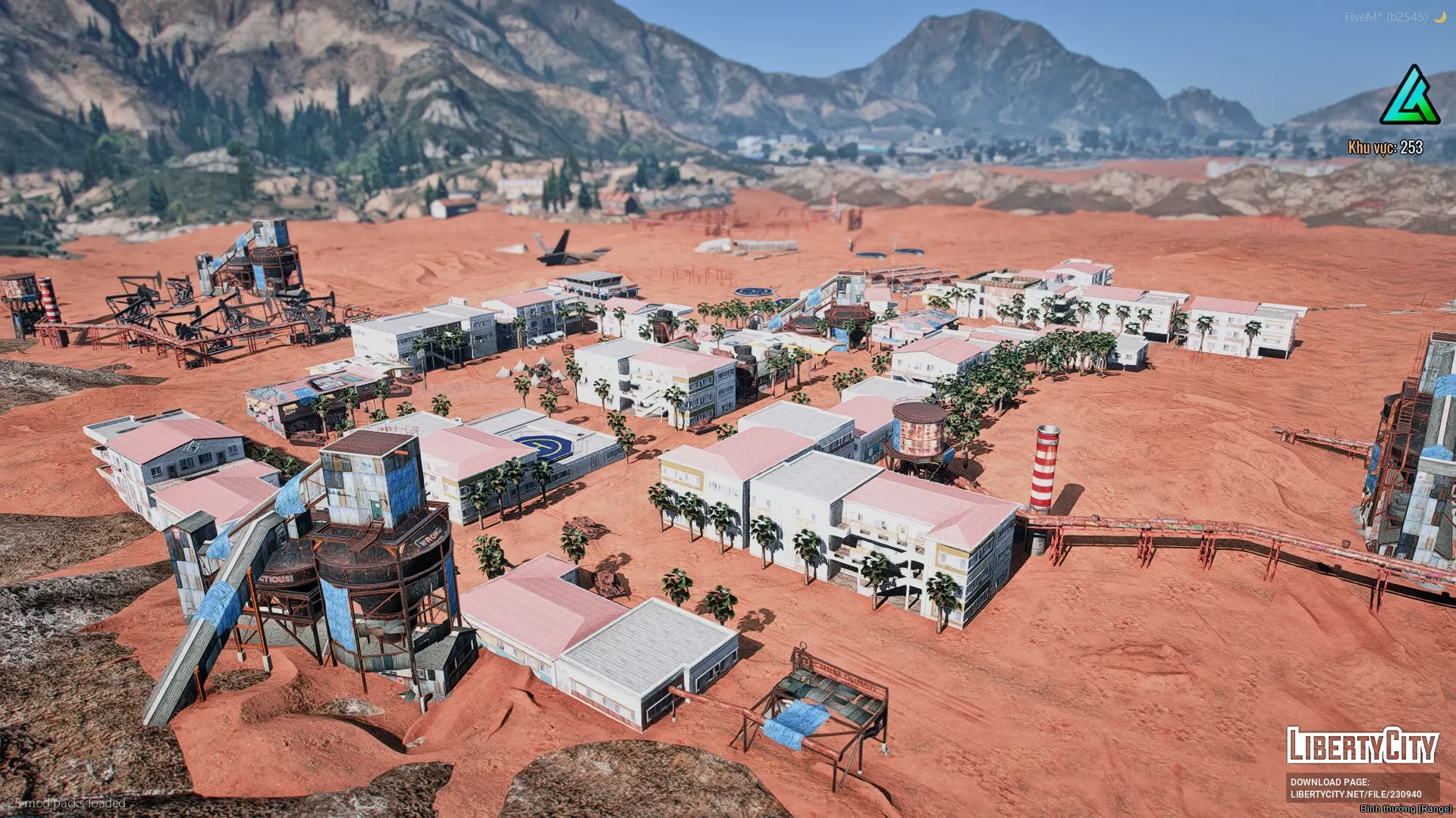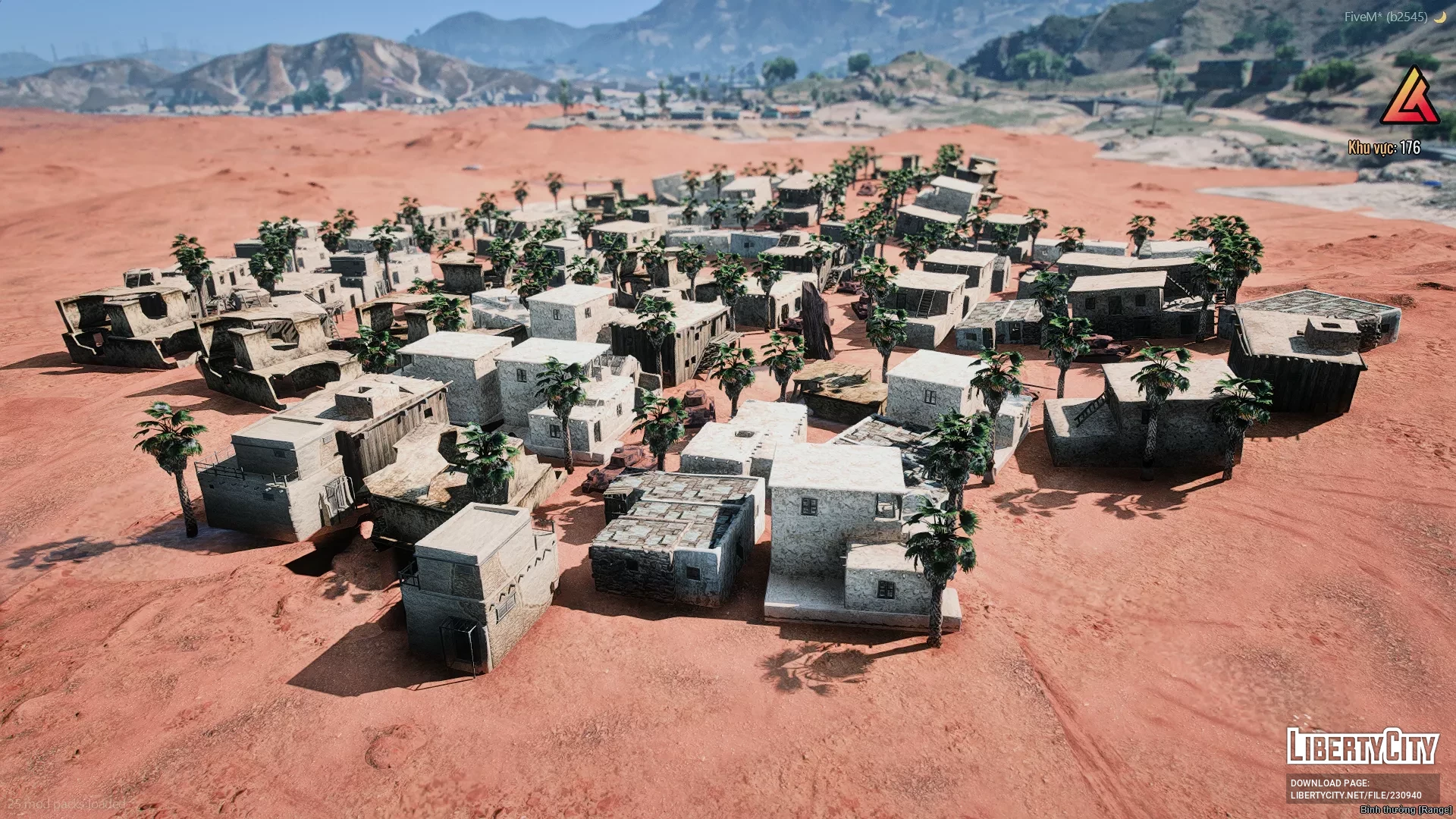 На изображении представлен крупный участок пустынной местности с характерным красноватым песком, напоминающим марсианский или ближневосточный пейзаж. В центре кадра расположен небольшой поселок, состоящий из светлых, прямоугольных зданий, окружённых пальмами. Дома плотно сгруппированы, что создаёт ощущение компактного жилого кластера посреди пустыни. В левой части изображения виднеется отдельная площадка с пальмами и, возможно, водоёмом или фонтаном. На заднем плане возвышаются горы и холмы, а также заметны другие поселения, что добавляет глубины и реализма сцене.