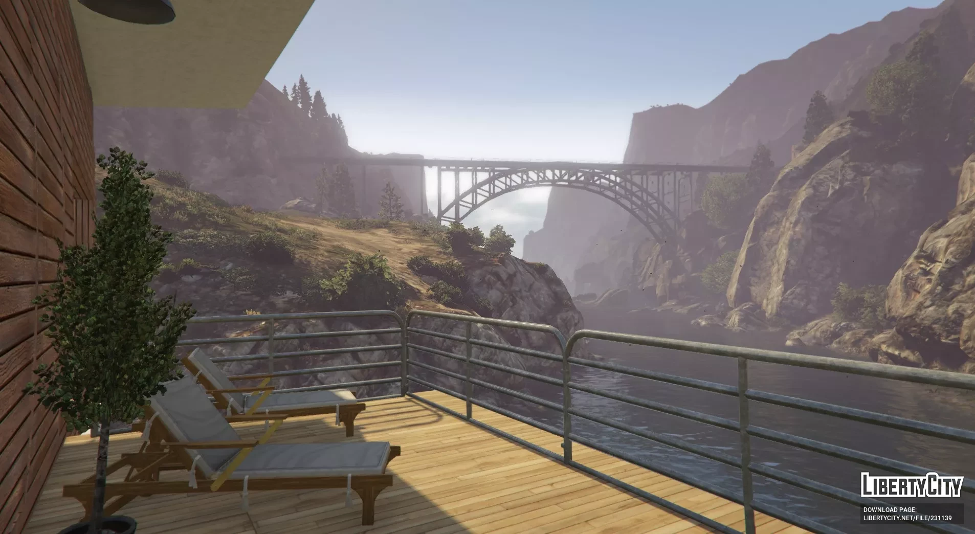 Стильный небольшой домик расположен в сельской местности у реки. Дом имеет два этажа, просторную открытую лоджию с видом на мост через реку, большие окна и небольшой сад. Также на территории есть собственная пристань для лодок и большая круговая парковка.