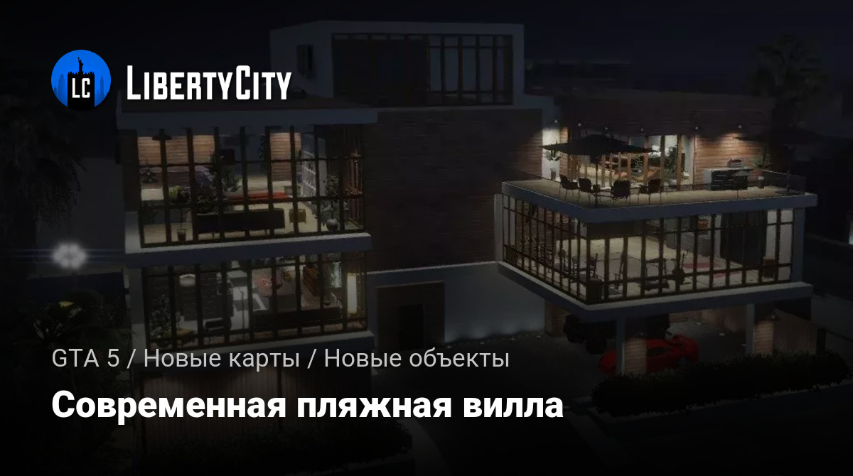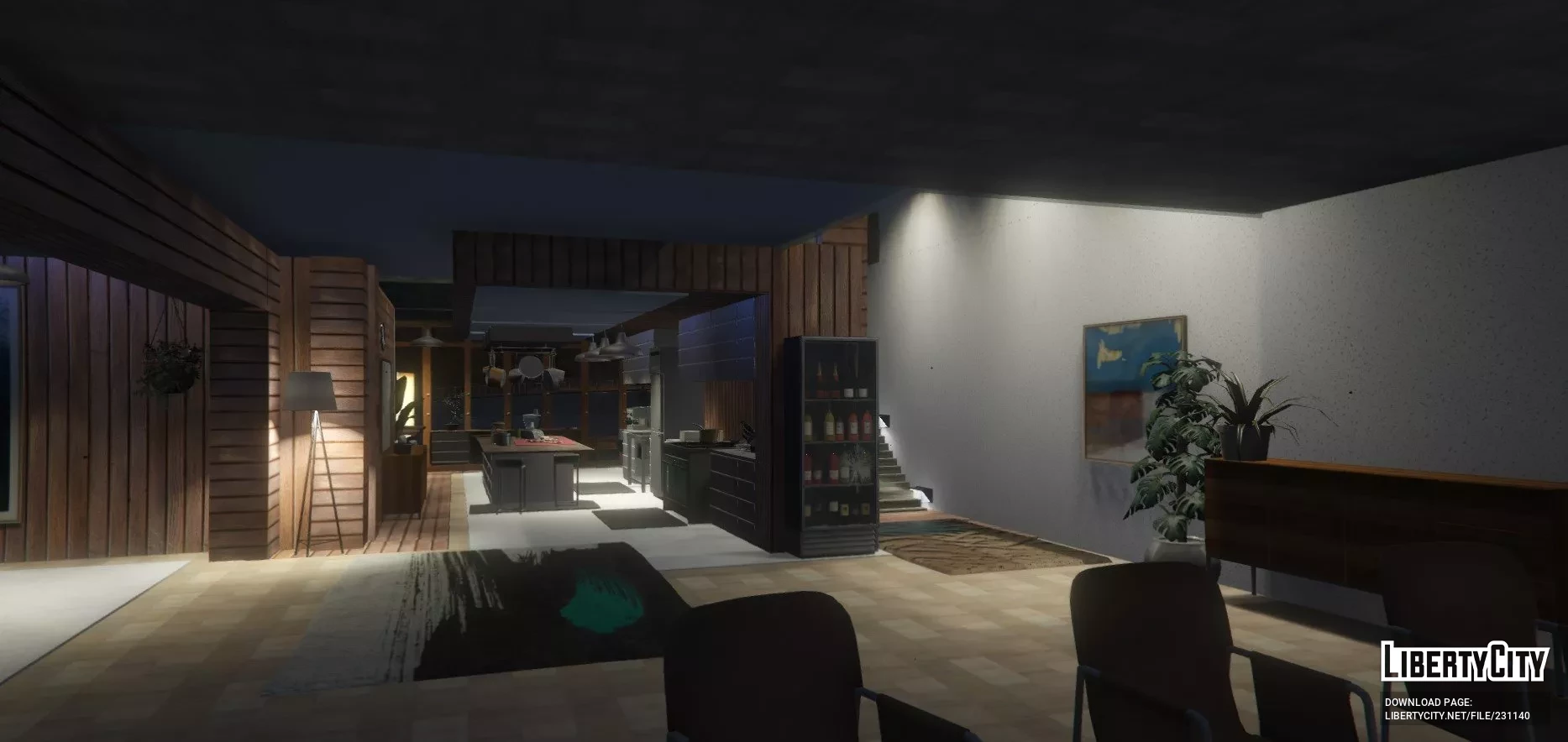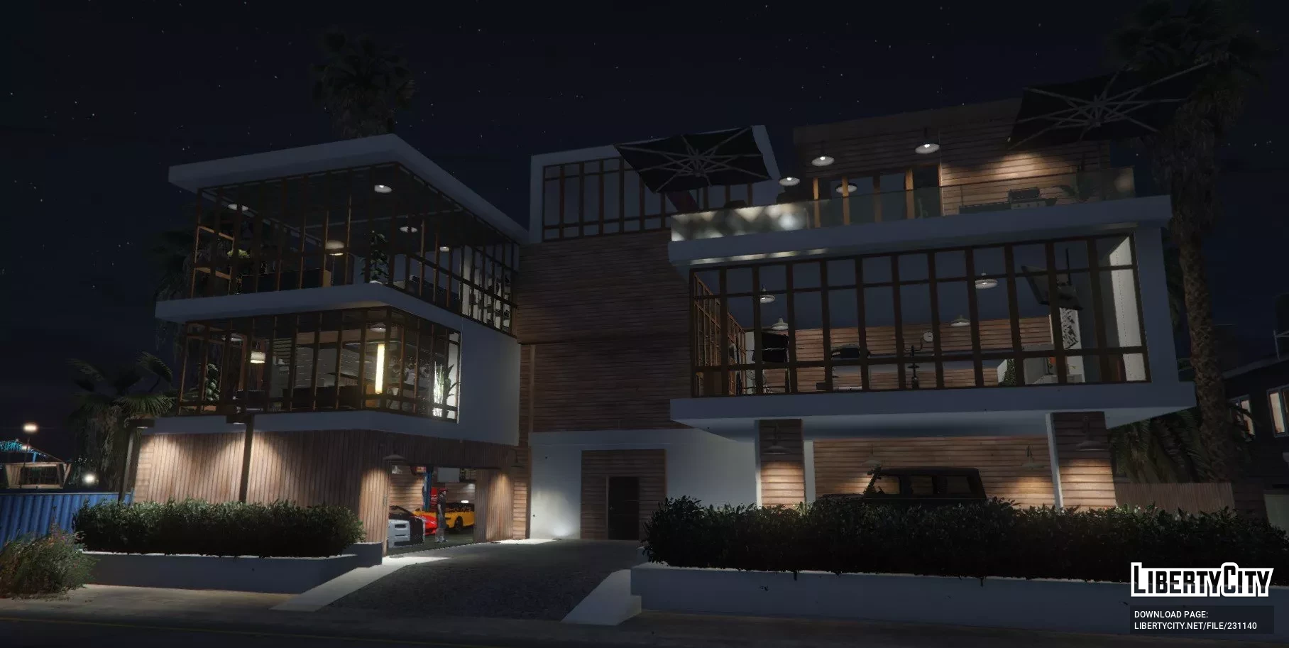 Вилла на пляже с большим количеством реквизита. В доме множество отдельных комнат и выходов, панорамные окна. Каждая комната полностью обставлена и заполнена мебелью. Вилла компактная, но включает все необходимые зоны для отдыха, парковки и летние площадки. Ночью реализовано стильное освещение.