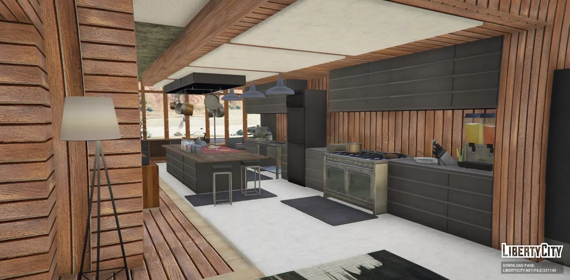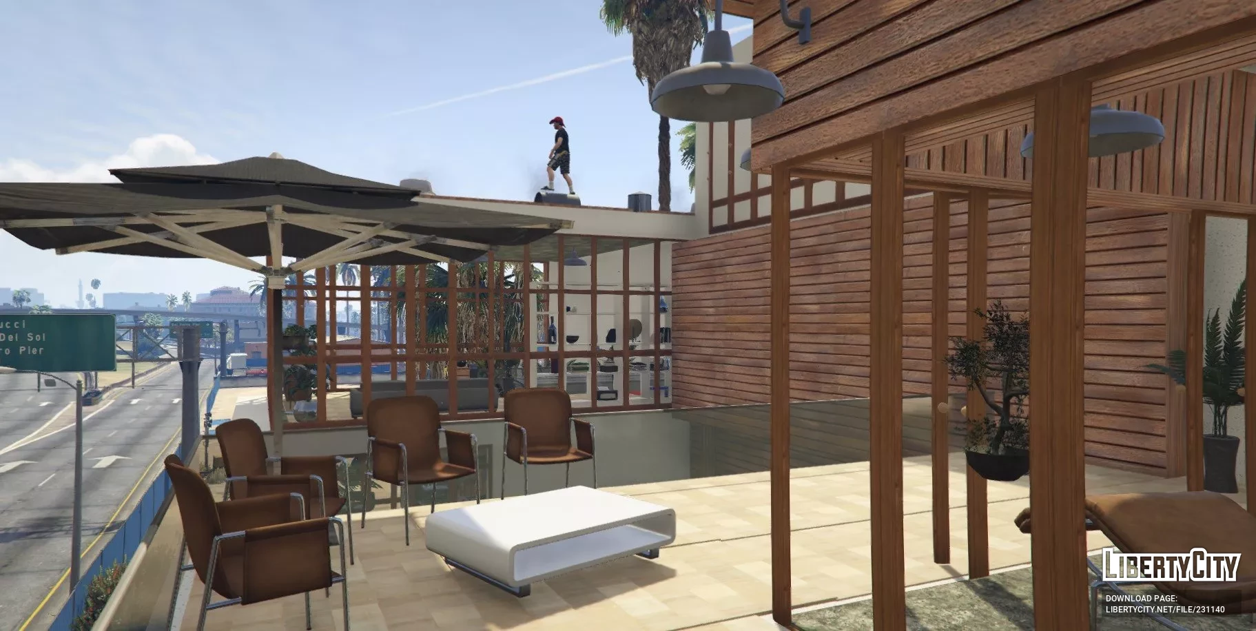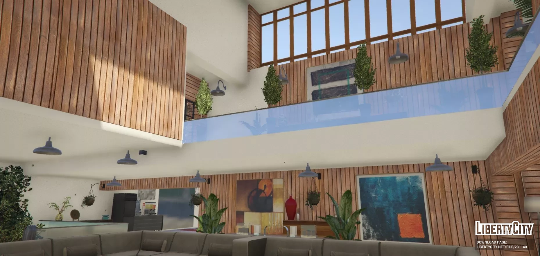 Вилла на пляже с большим количеством реквизита. В доме множество отдельных комнат и выходов, панорамные окна. Каждая комната полностью обставлена и заполнена мебелью. Вилла компактная, но включает все необходимые зоны для отдыха, парковки и летние площадки. Ночью реализовано стильное освещение.