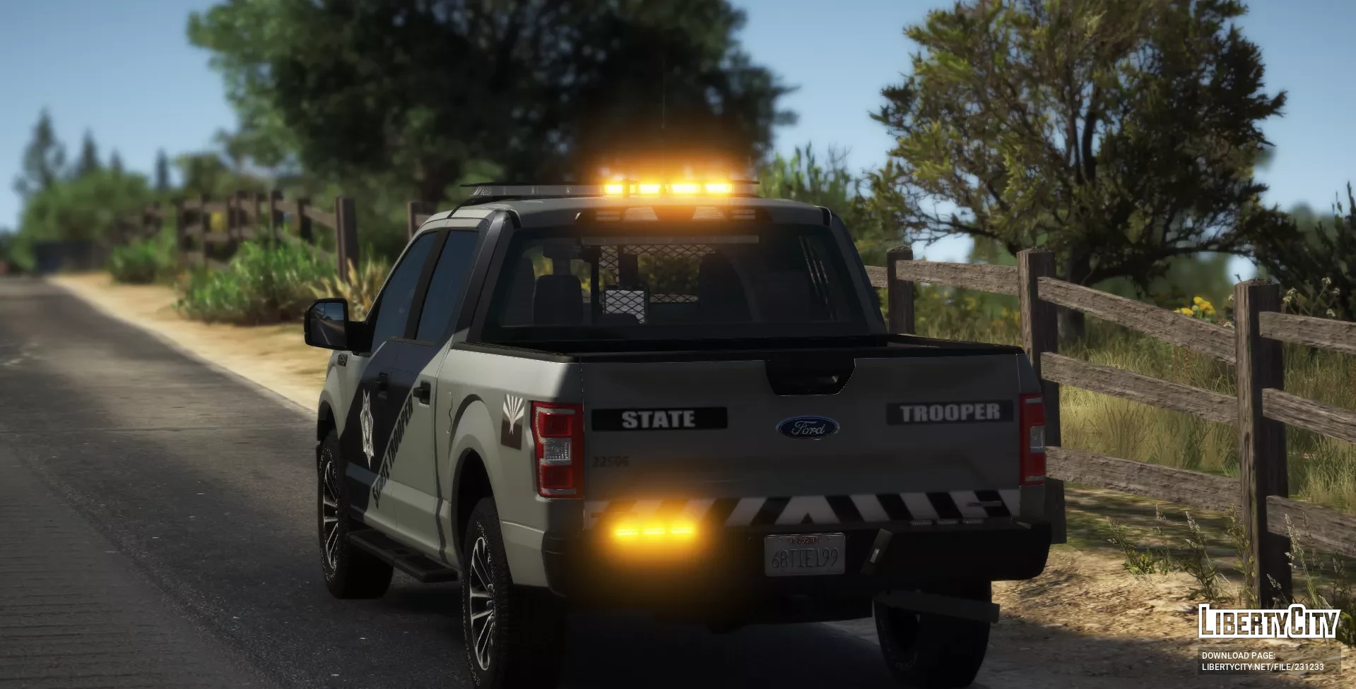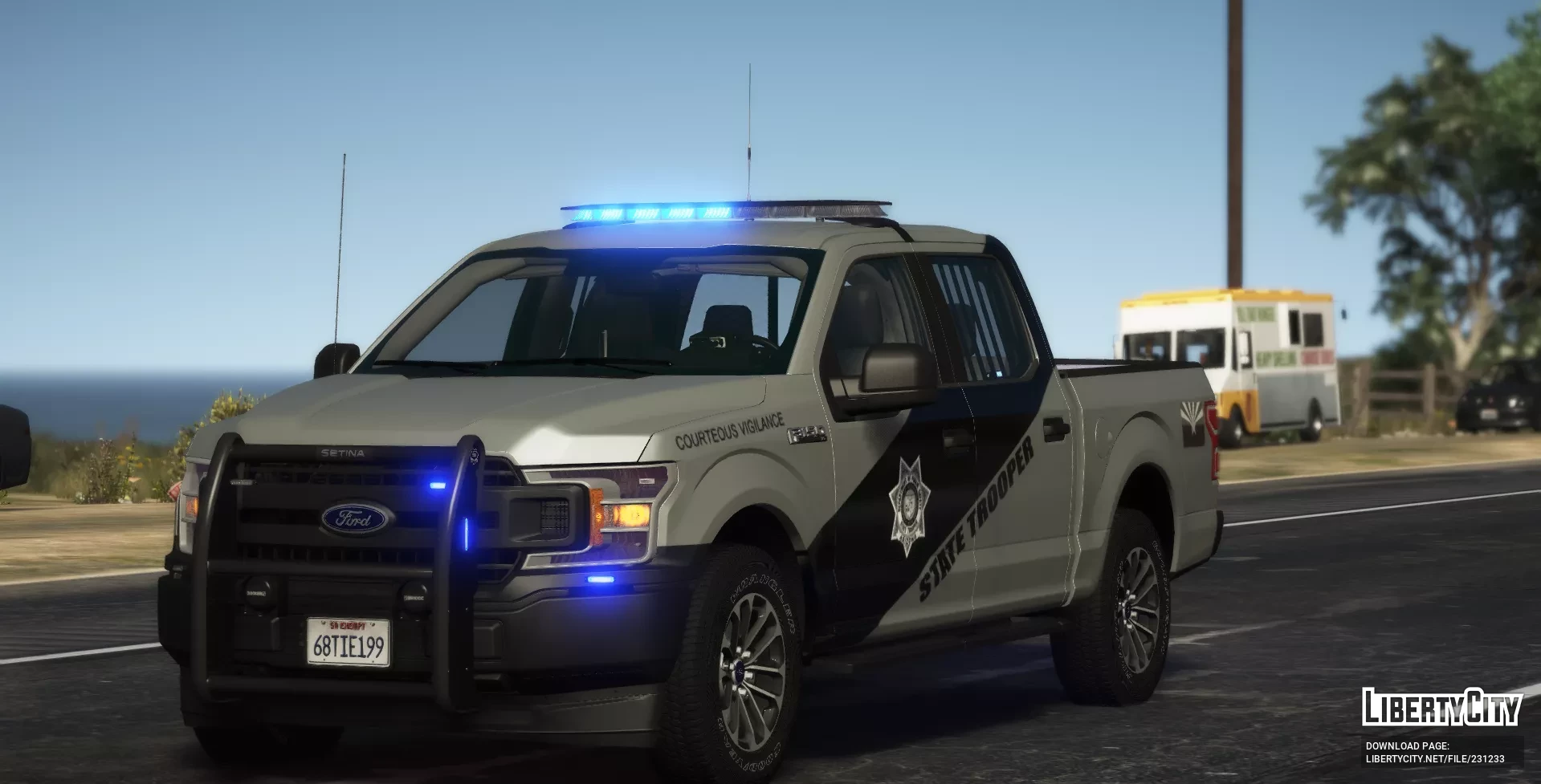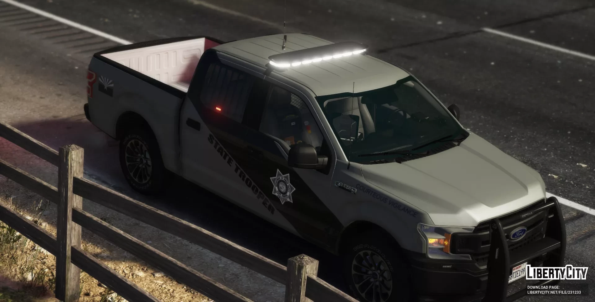 - Кузов окрашен в светло-серый цвет с чёрными диагональными элементами и большими надписями "STATE TROOPER", что подчёркивает принадлежность к дорожной полиции.