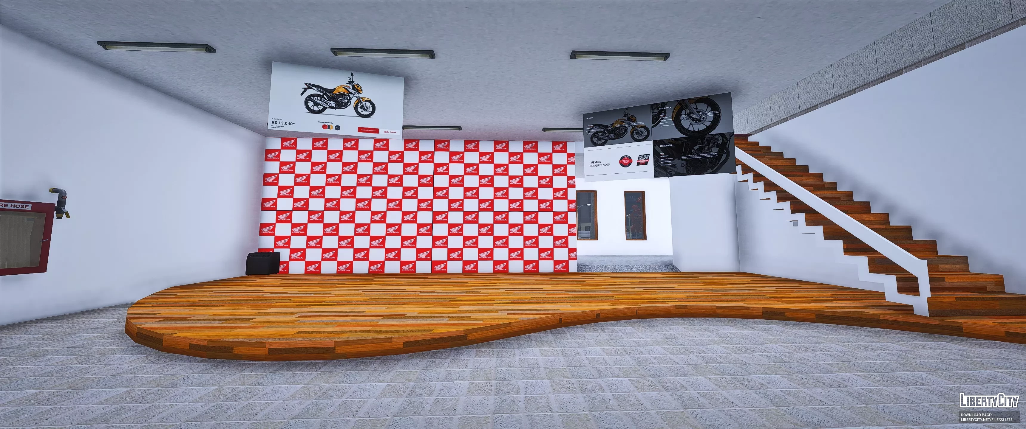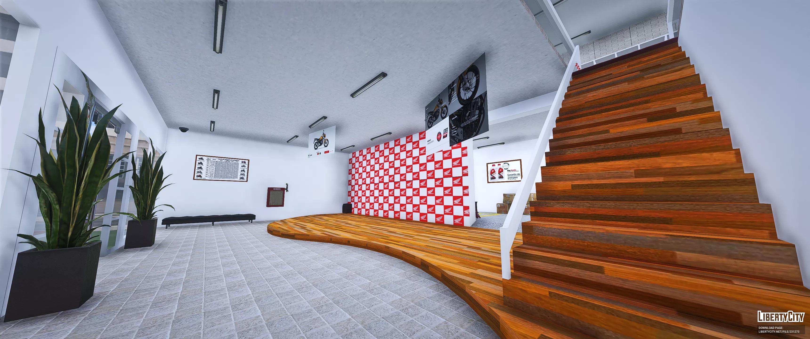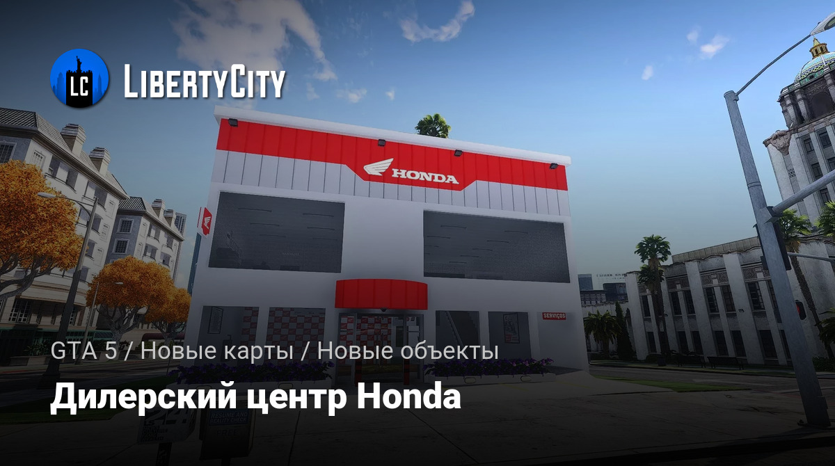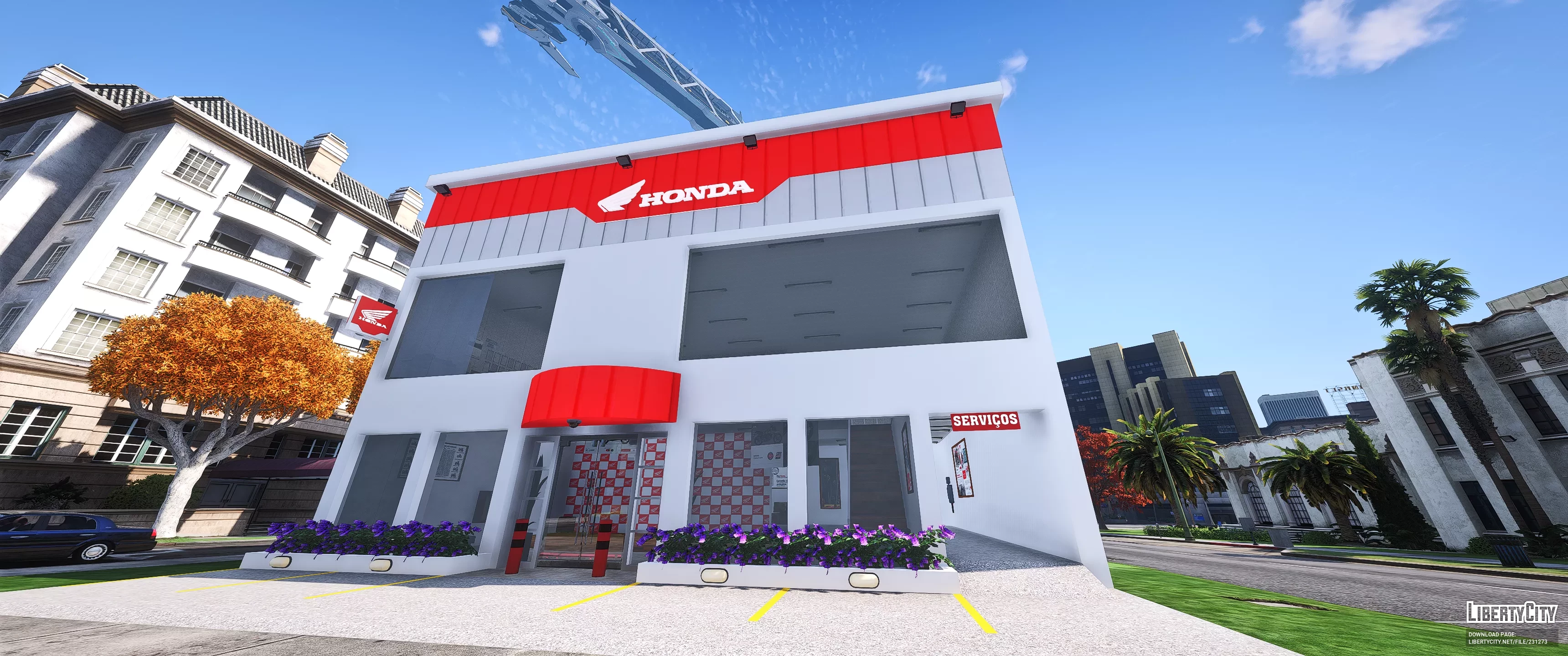 Здание автосалона выполнено в современном стиле и окрашено в белый цвет с яркими красными акцентами. На фасаде второго этажа размещён крупный логотип Honda на красной панели, что делает здание легко узнаваемым. Входная группа выделена красным козырьком, а по обе стороны от входа установлены стеклянные двери и большие витринные окна, через которые виден интерьер салона. По периметру здания высажены декоративные цветы в клумбах, что добавляет уюта и привлекательности. Здание расположено на углу улицы, окружено зелёными газонами и аккуратными тротуарами. Вокруг растут деревья с яркой листвой, а рядом находятся другие здания в классическом стиле.