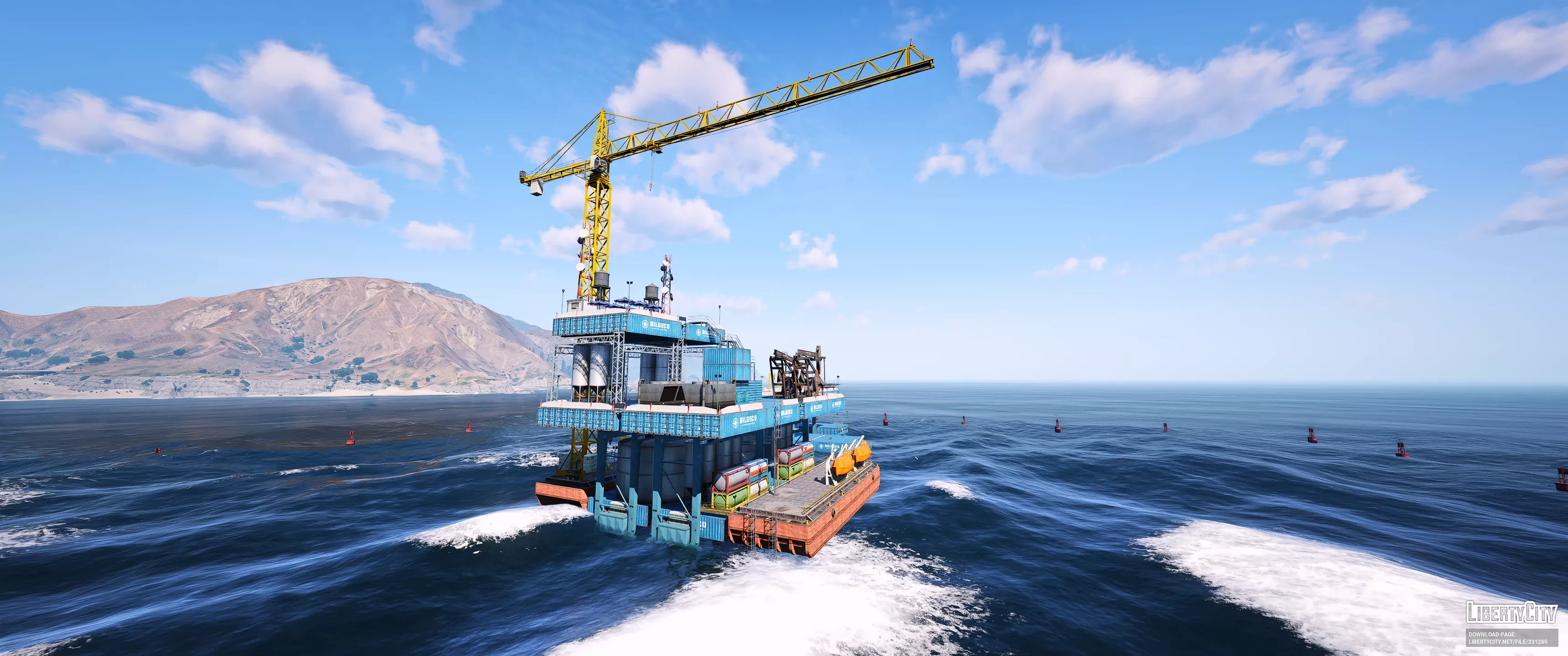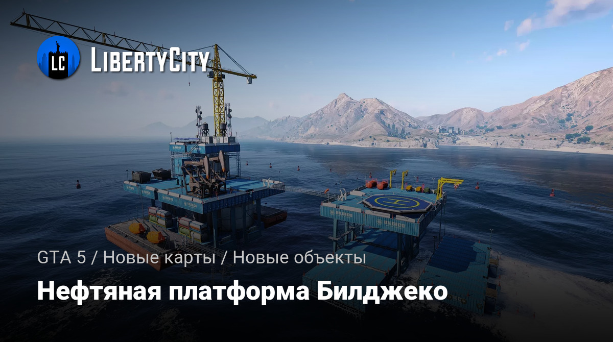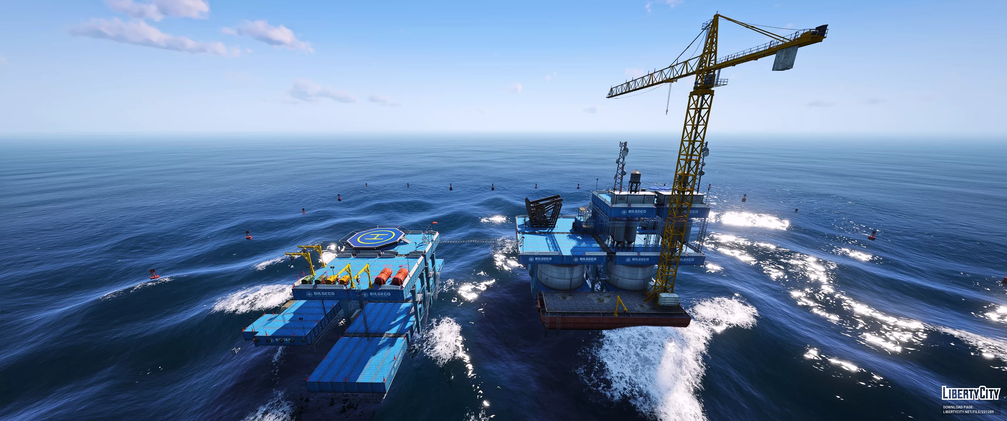 Нефтяная платформа Bilgeco представляет собой крупную морскую конструкцию, выполненную преимущественно в синих и синих-голубых тонах. Платформа состоит из нескольких уровней и секций, соединённых переходами. На одном из уровней расположен большой вертолётная площадка с жёлтой разметкой в виде буквы "H". На платформе установлены различные контейнеры, промышленные резервуары и оборудование, вокруг которых размещены ограждения и лестницы. С одной стороны возвышается массивный жёлтый кран, предназначенный для подъёма грузов. Платформа окружена ограждающими буями, а вдалеке виднеется береговая линия с горами.
