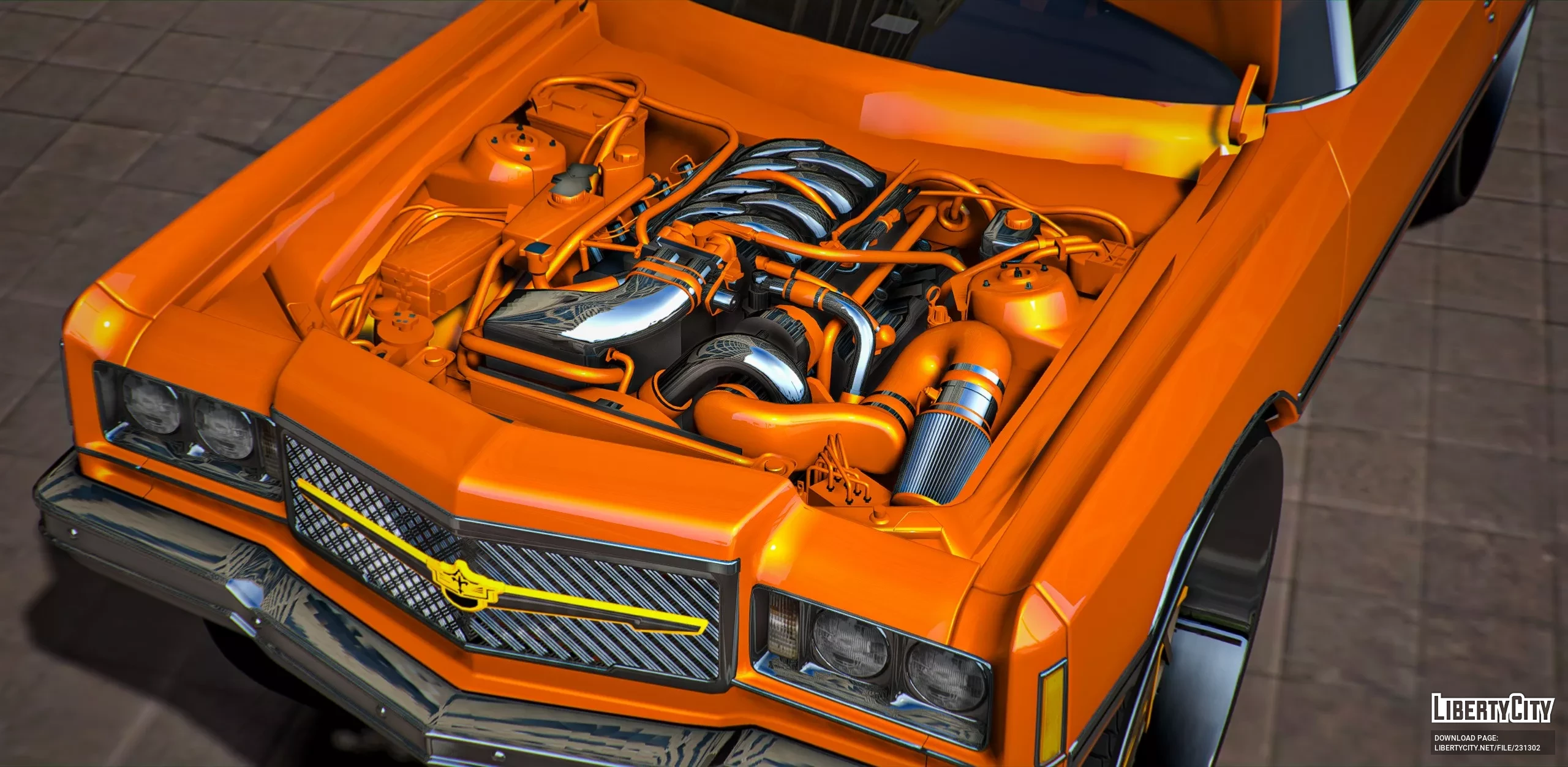 1974 Chevy Caprice Nutta Donk выделяется своим ярким и эффектным внешним видом. Кузов автомобиля окрашен в насыщенный оранжевый цвет с глянцевым блеском, что сразу привлекает внимание. Огромные хромированные диски с желтыми спицами придают машине узнаваемый стиль Donk и подчёркивают её индивидуальность. Передняя часть украшена массивной хромированной решеткой радиатора с жёлтыми акцентами и четырьмя круглыми фарами. Хромированные бамперы и молдинги по бокам добавляют классический американский шик. Крыша выполнена в том же оранжевом цвете, гармонируя с общим стилем автомобиля. Этот Caprice выглядит дерзко и современно, идеально подходя для уличных шоу и привлечения внимания на дорогах.