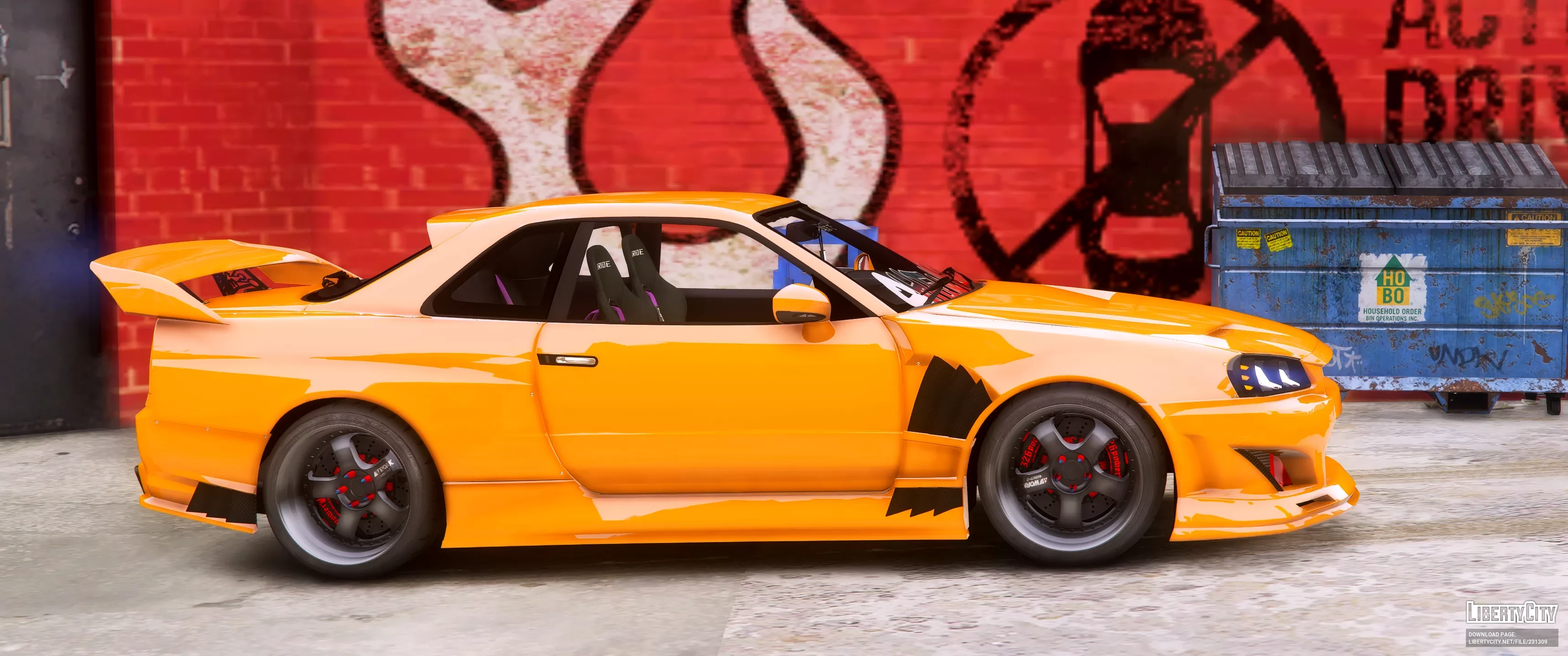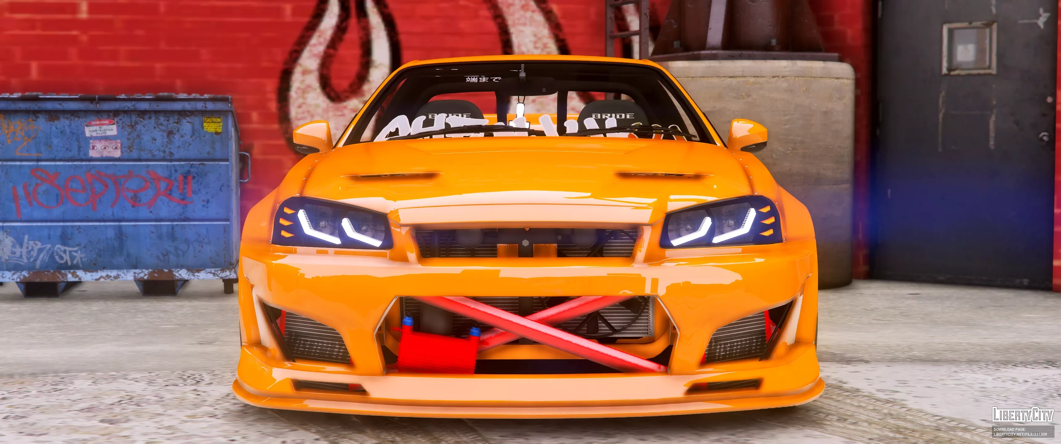Nissan Skyline SHO34 на изображении выглядит как агрессивный и стильный дрифт-кар. Внешний вид автомобиля выделяется ярко-оранжевым цветом кузова, который сразу бросается в глаза. Передняя часть оснащена массивным аэродинамическим обвесом, широким передним бампером с большими воздухозаборниками и заметной красной распоркой, что придаёт машине гоночный характер.