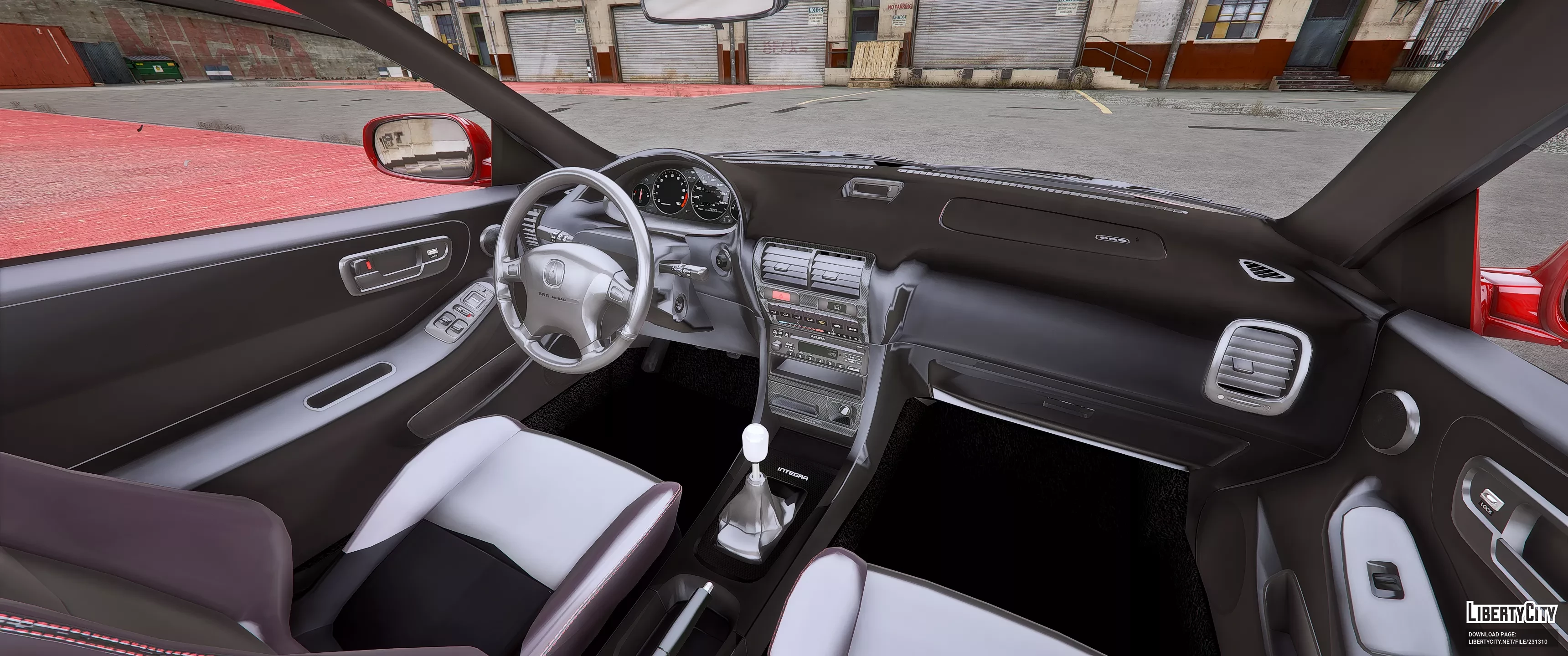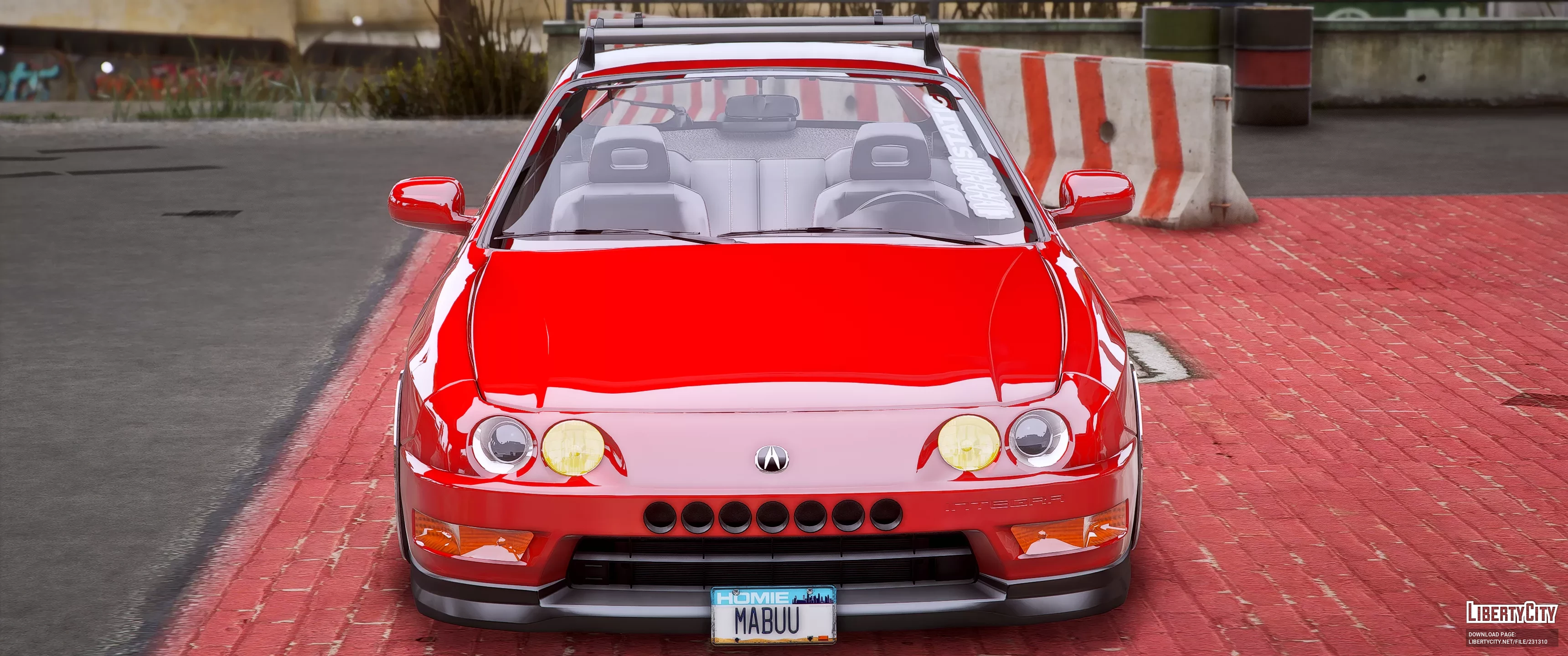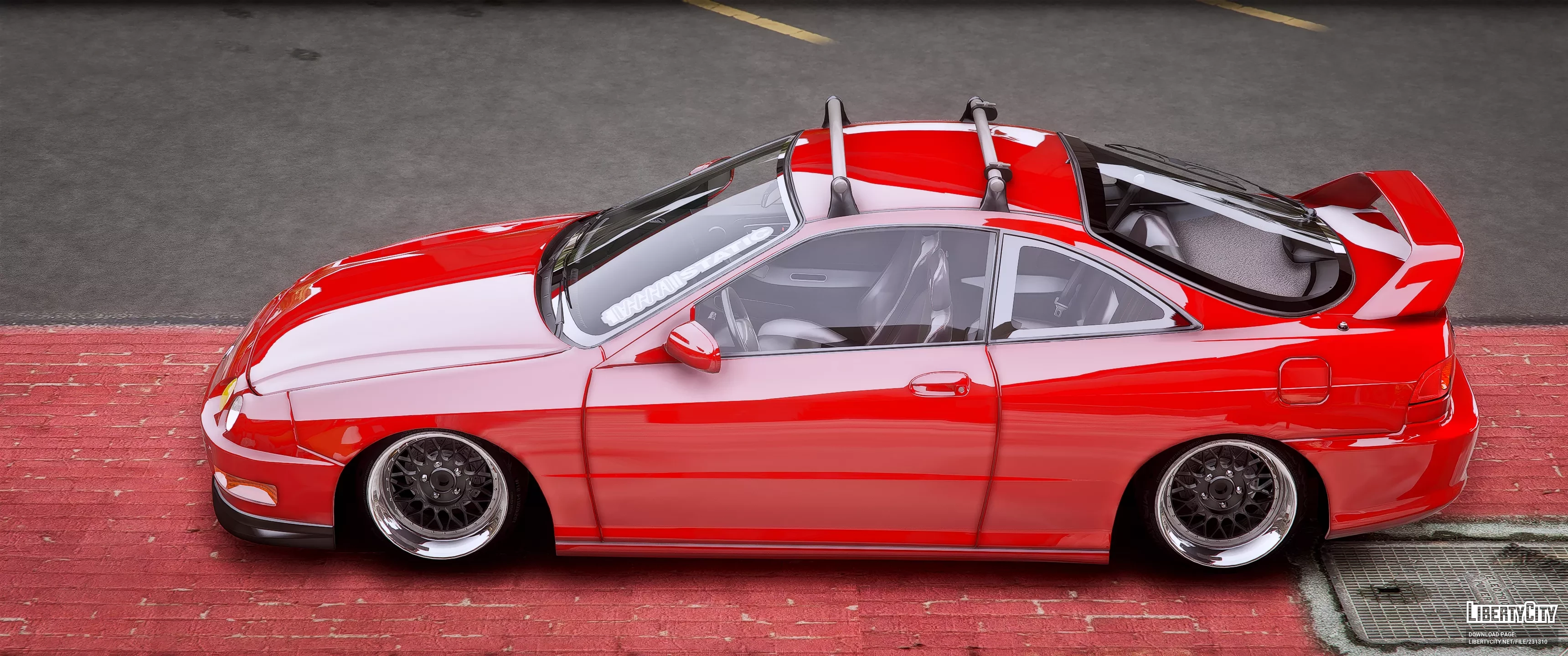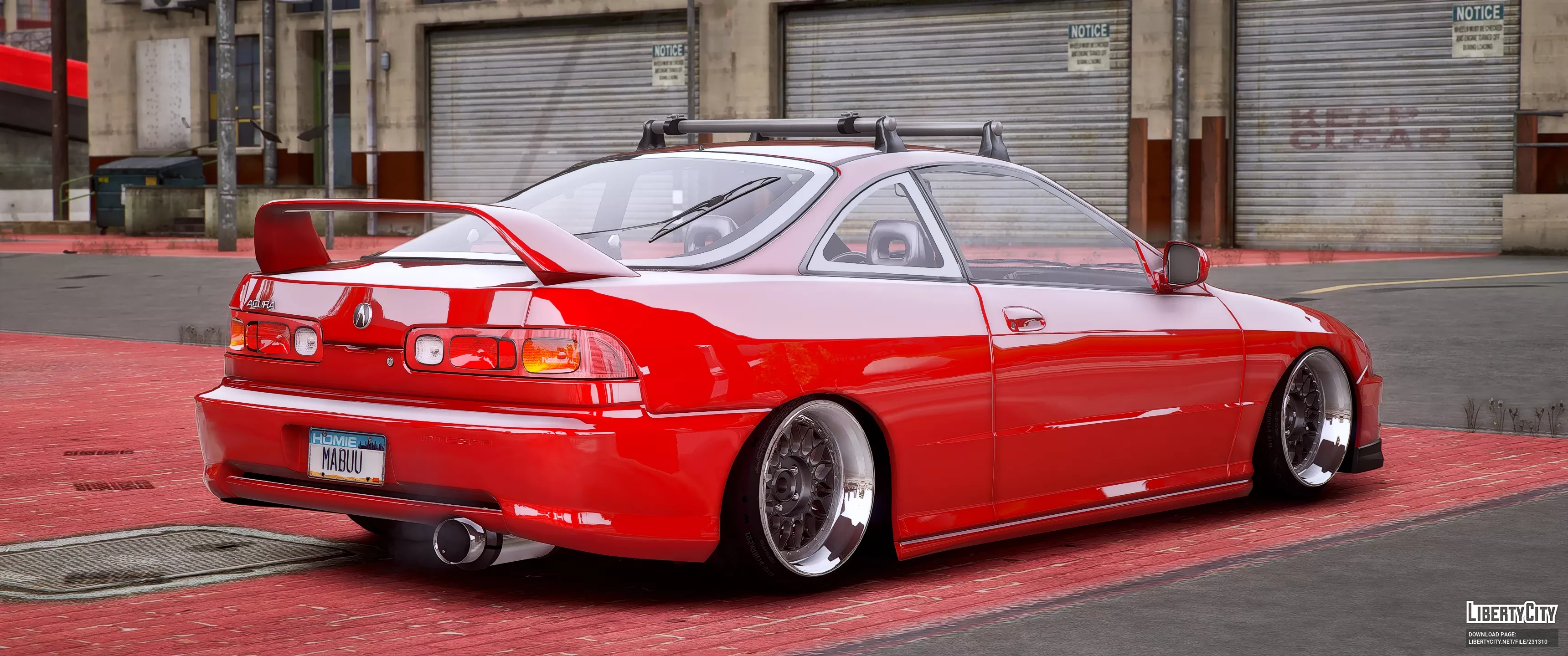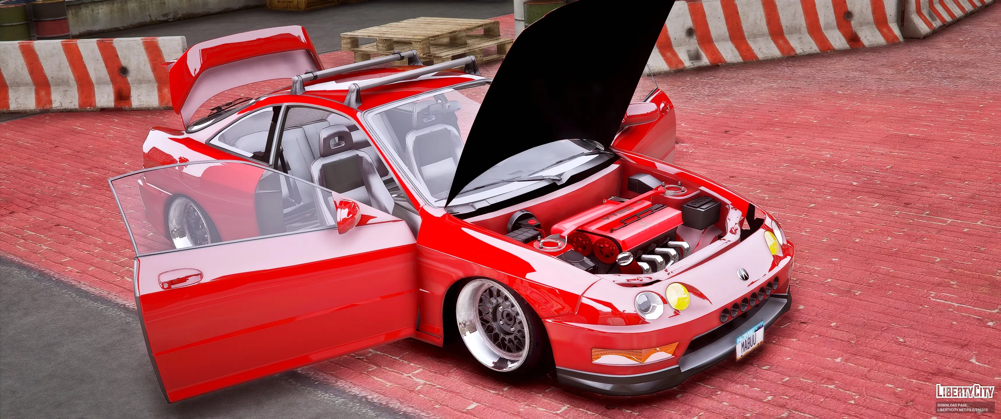 Acura Integra в стиле JDM выглядит очень агрессивно и привлекательно. На машине установлены широкие полированные диски с низкопрофильной резиной, что подчёркивает её гоночный характер. Передний бампер оснащён сплиттером, а на капоте и по бокам видны аккуратные аэродинамические элементы.
