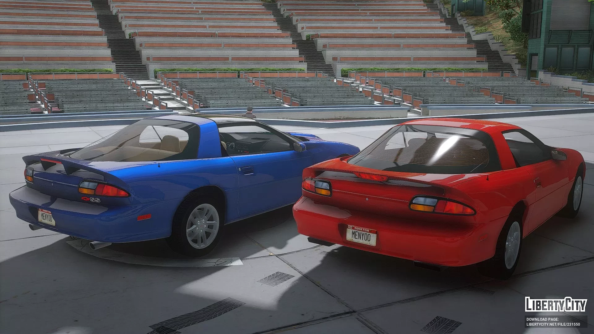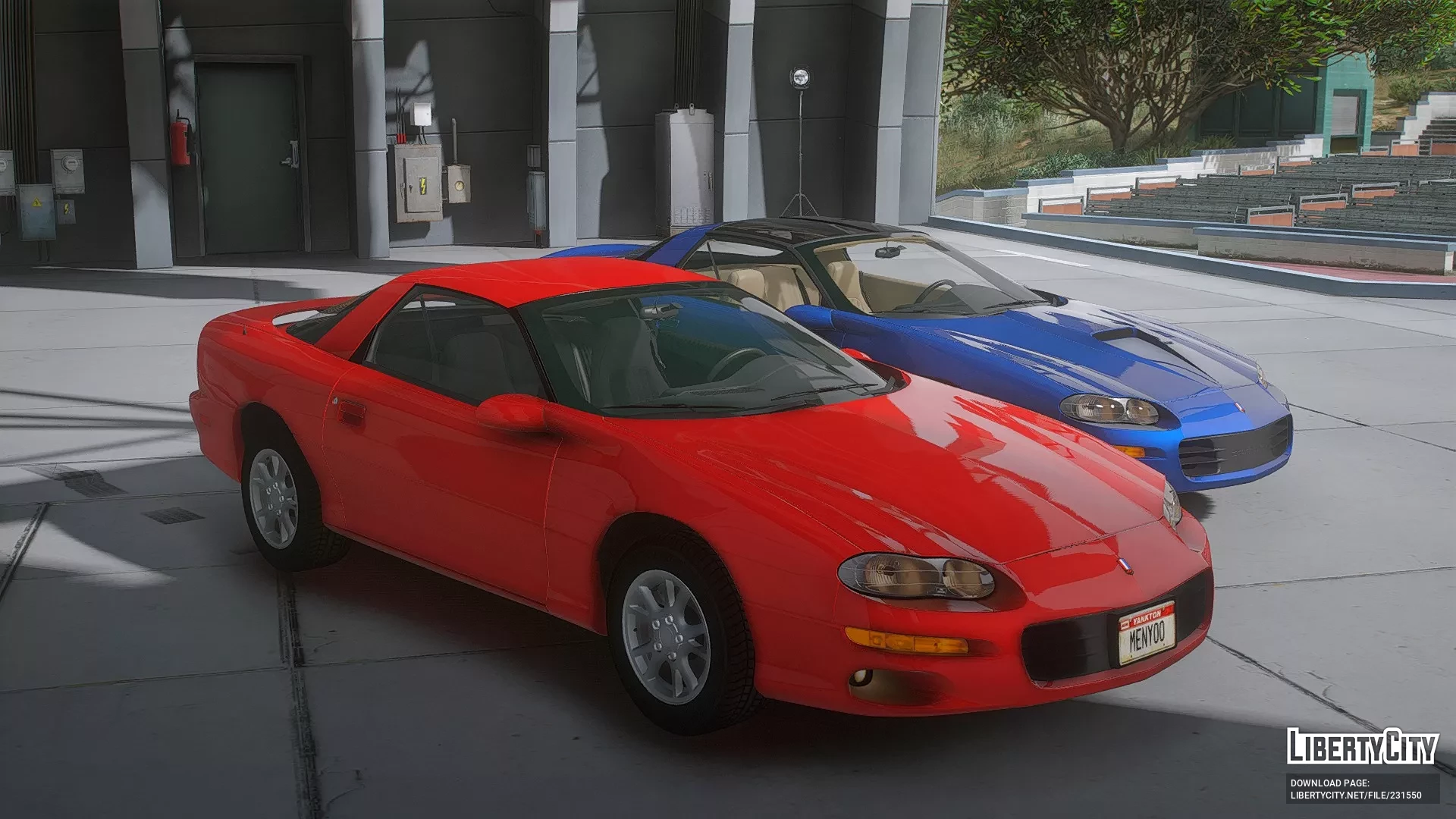 2002 Chevrolet Camaro SS для GTA 5. Передняя часть: Характерный вытянутый капот с интегрированным воздухозаборником подчёркивает спортивный характер автомобиля. Фары выполнены в овальной форме и разделены на две секции, что придаёт облику агре...