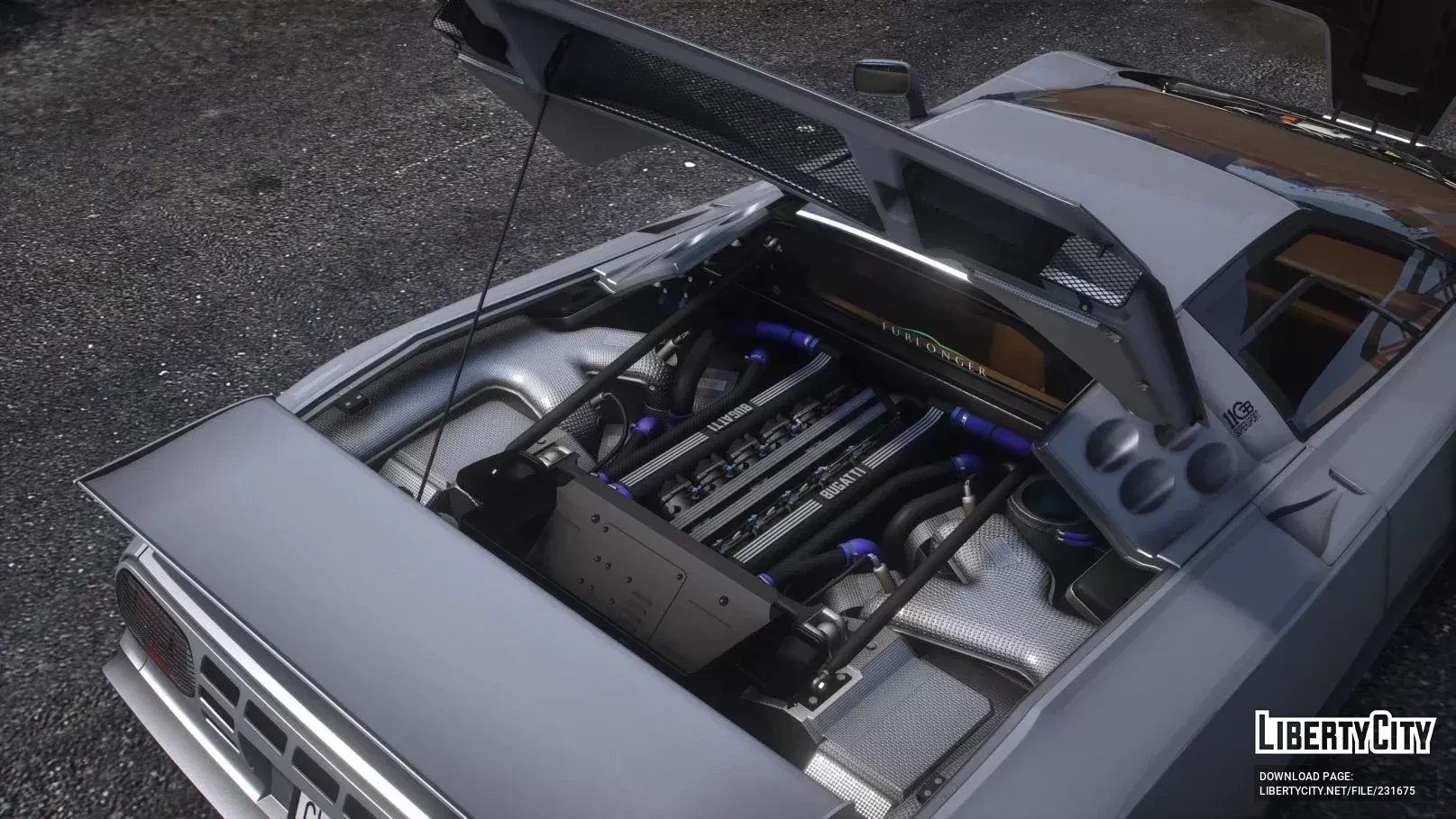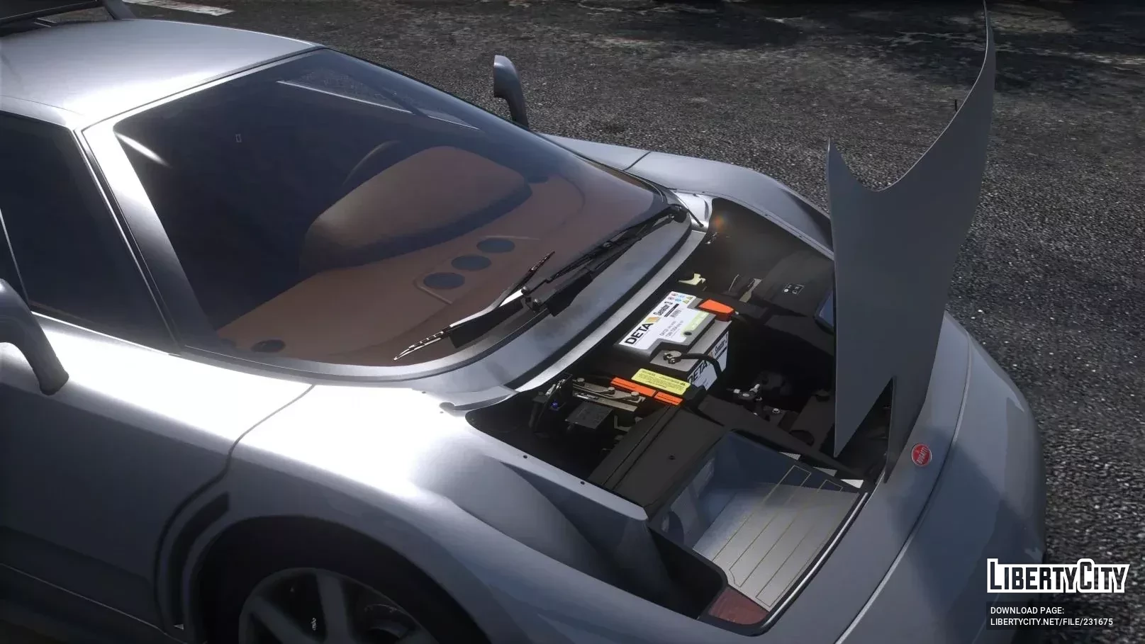 - Капот с характерными вентиляционными прорезями и скрытыми фарами подчёркивает ретро-стиль и технологичность суперкара 90-х.