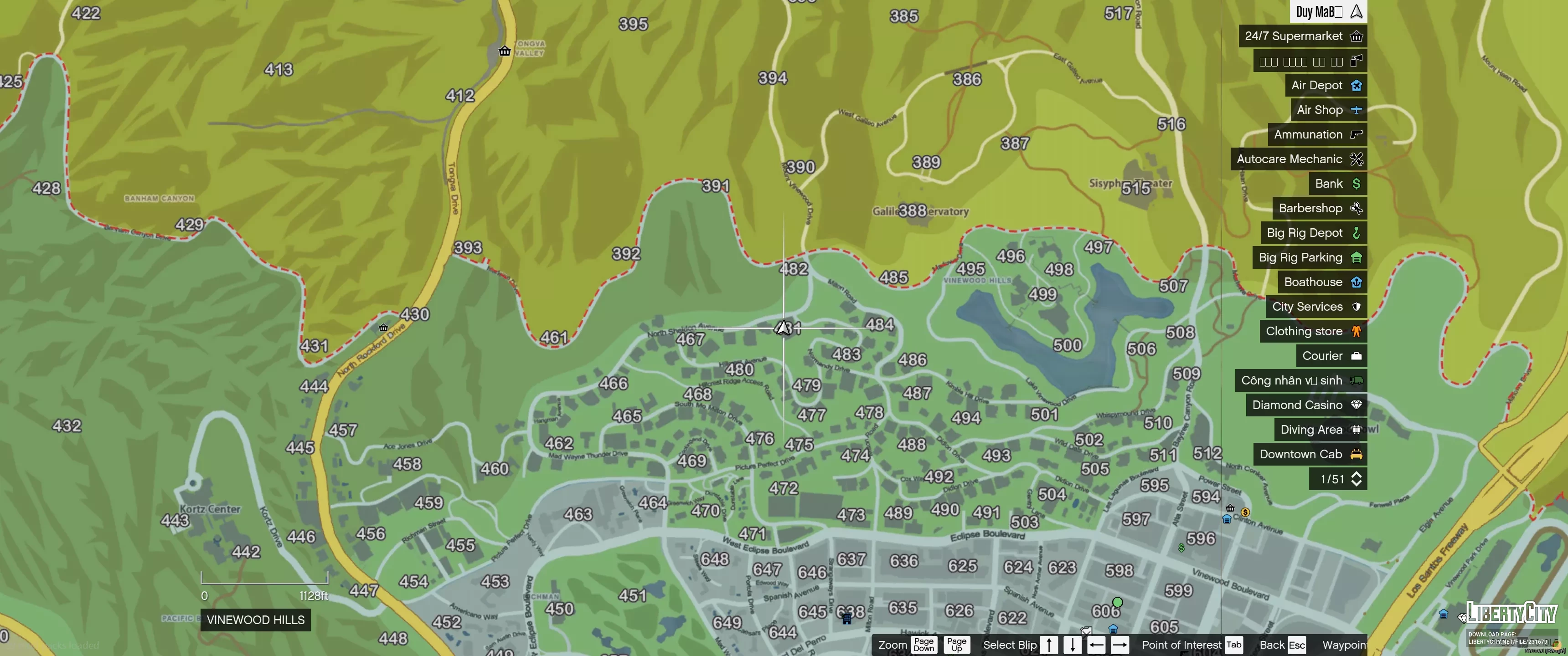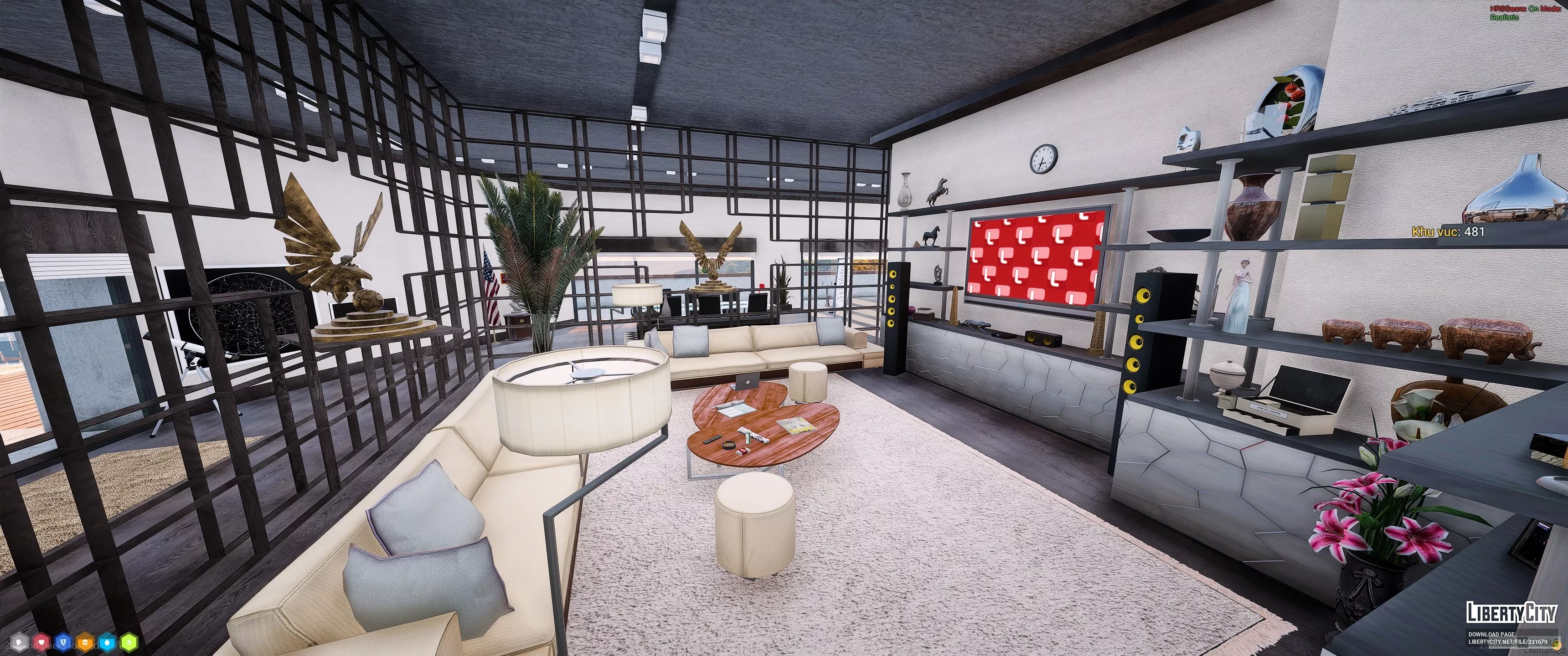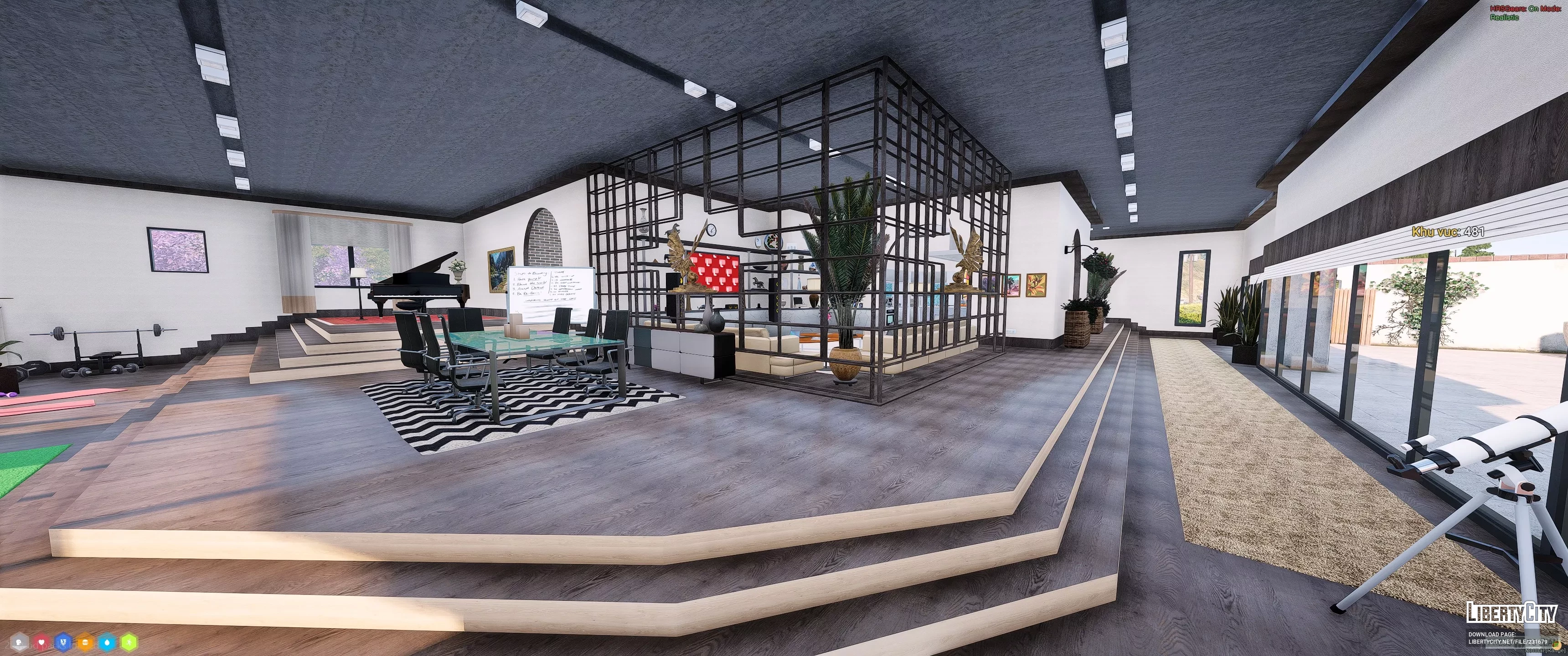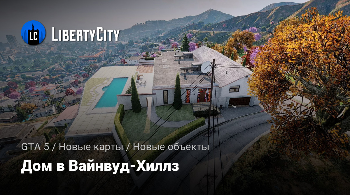 Дом в Vinewood Hills расположен на вершине холма и выделяется современным архитектурным стилем. Фасад здания выполнен в светлых тонах, с большими панорамными окнами и аккуратным озеленением перед входом. Перед домом находится ухоженный газон с декоративными кустами и двумя стройными кипарисами. К дому ведёт извилистая подъездная дорога, ограждённая белой стеной.