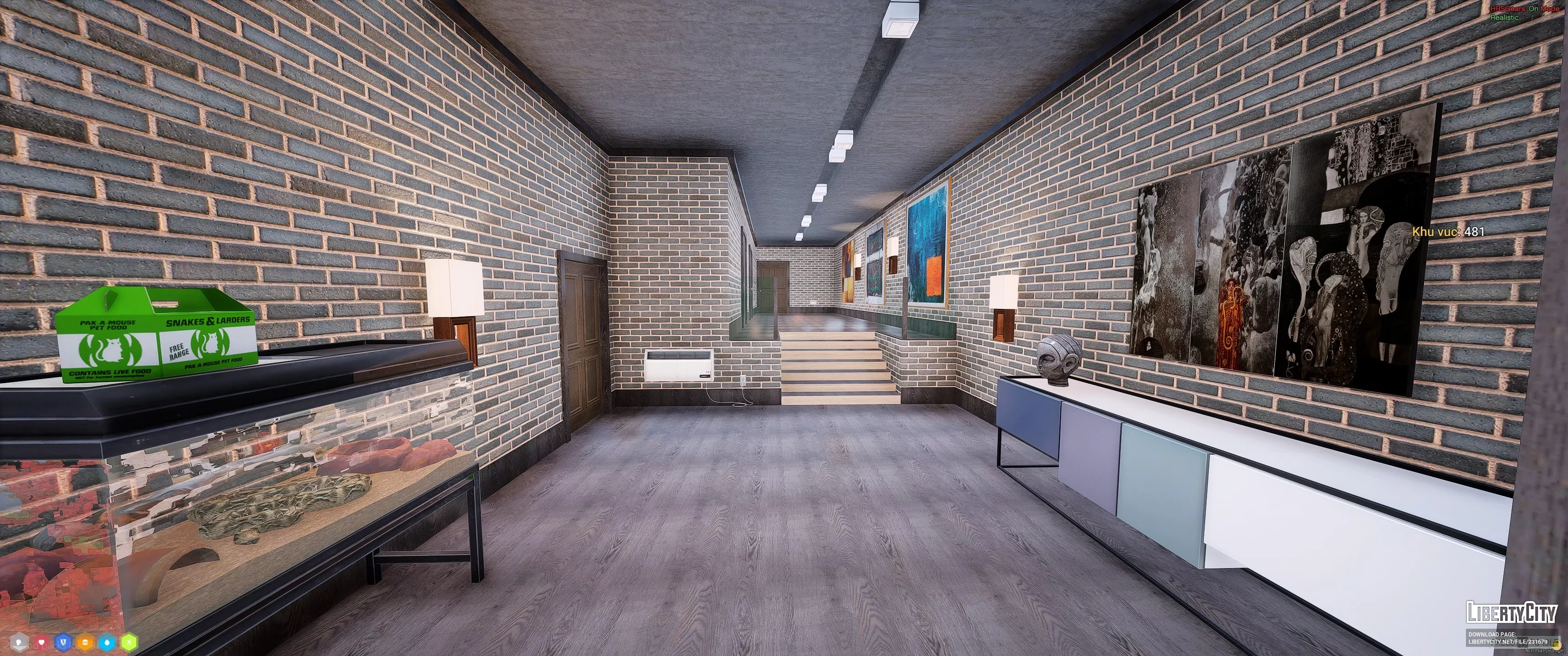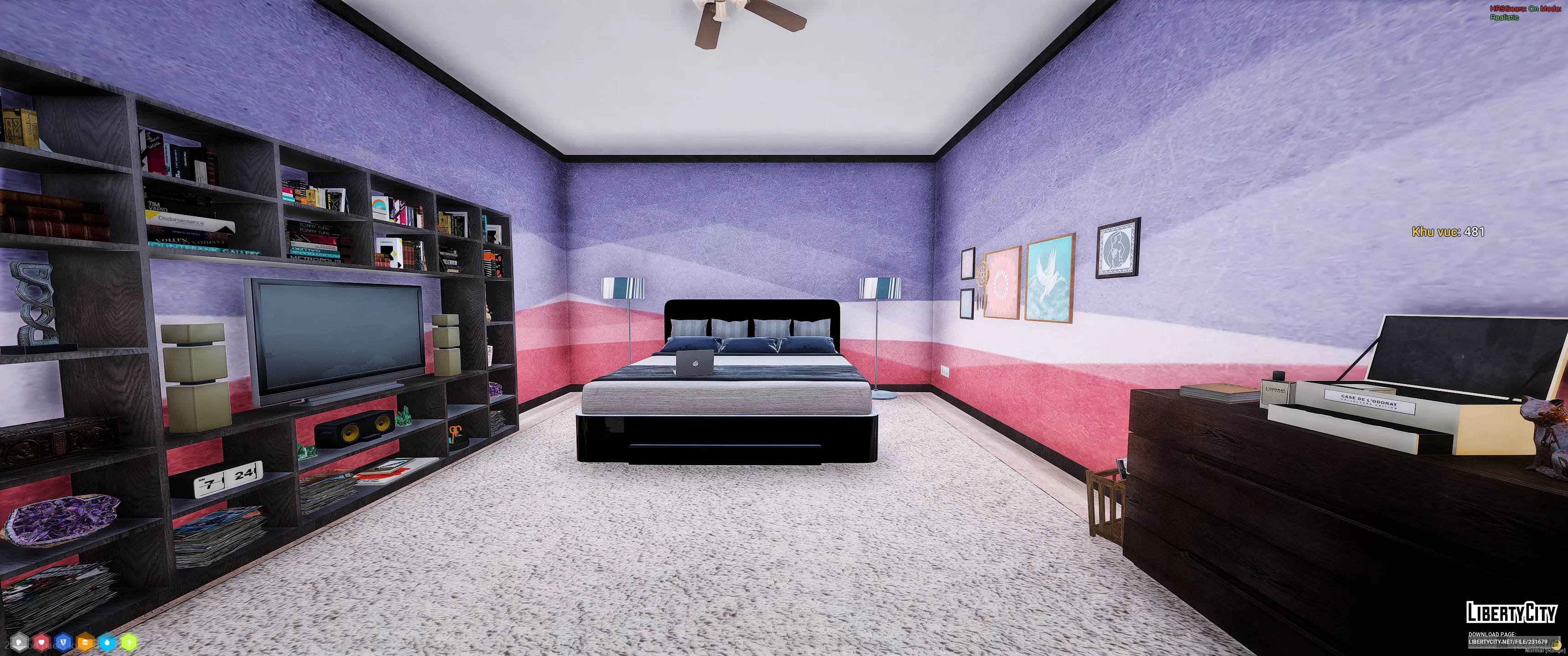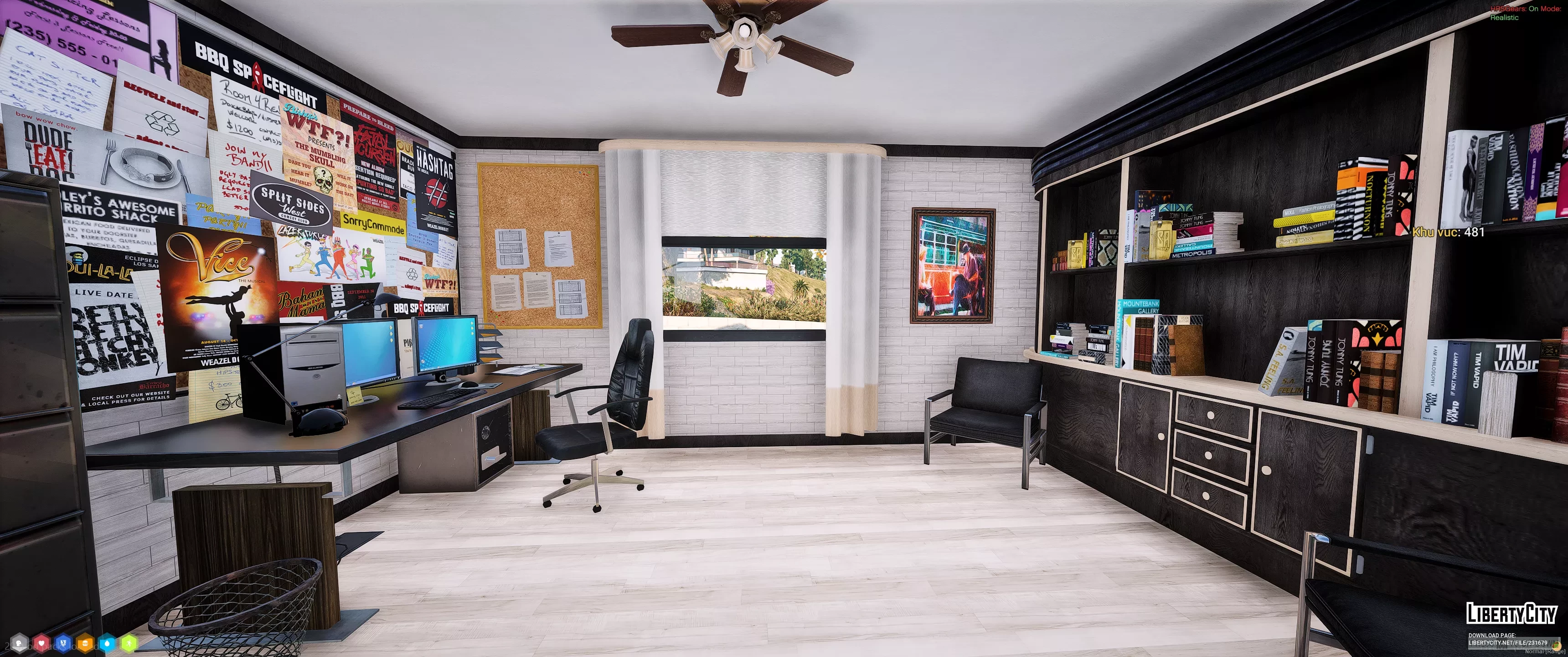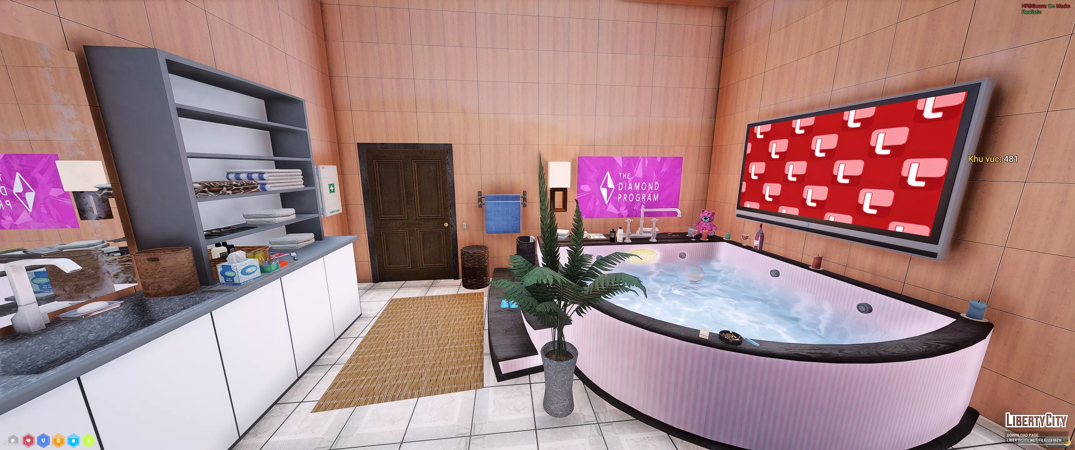 Дом в Vinewood Hills расположен на вершине холма и выделяется современным архитектурным стилем. Фасад здания выполнен в светлых тонах, с большими панорамными окнами и аккуратным озеленением перед входом. Перед домом находится ухоженный газон с декоративными кустами и двумя стройными кипарисами. К дому ведёт извилистая подъездная дорога, ограждённая белой стеной.
