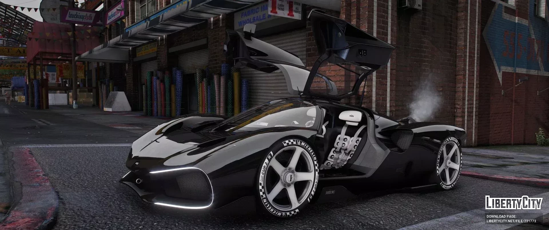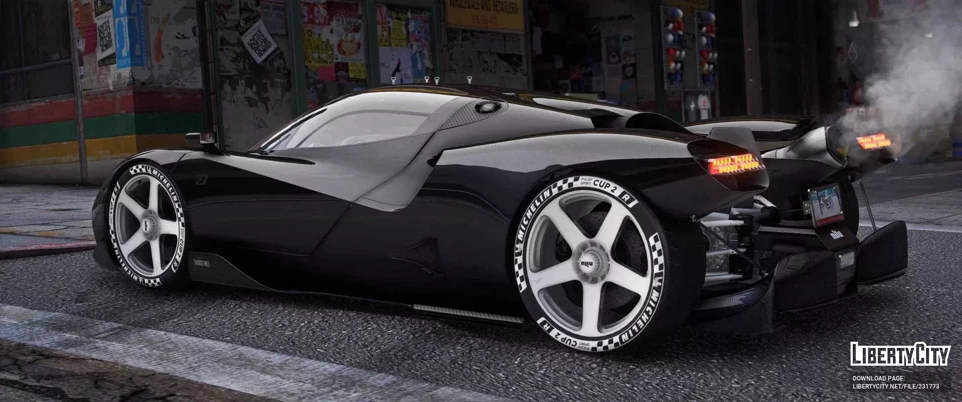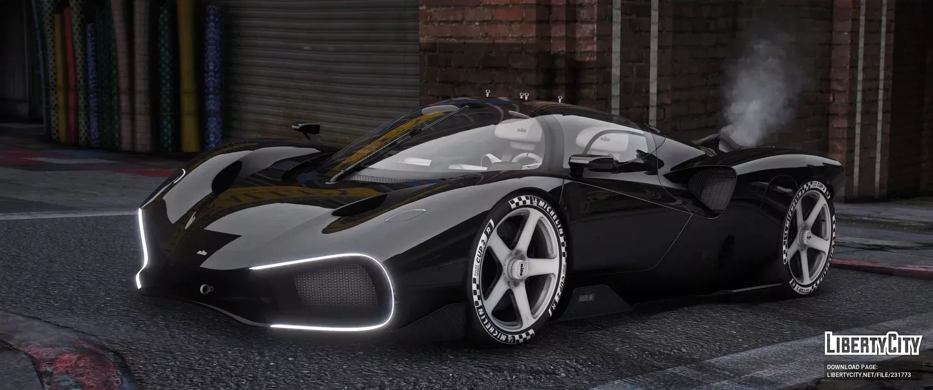 - Крупные белые пятиспицевые диски с логотипом nilu и гоночными шинами Michelin Cup 2 R с фирменной маркировкой подчёркивают статус гиперкара.
