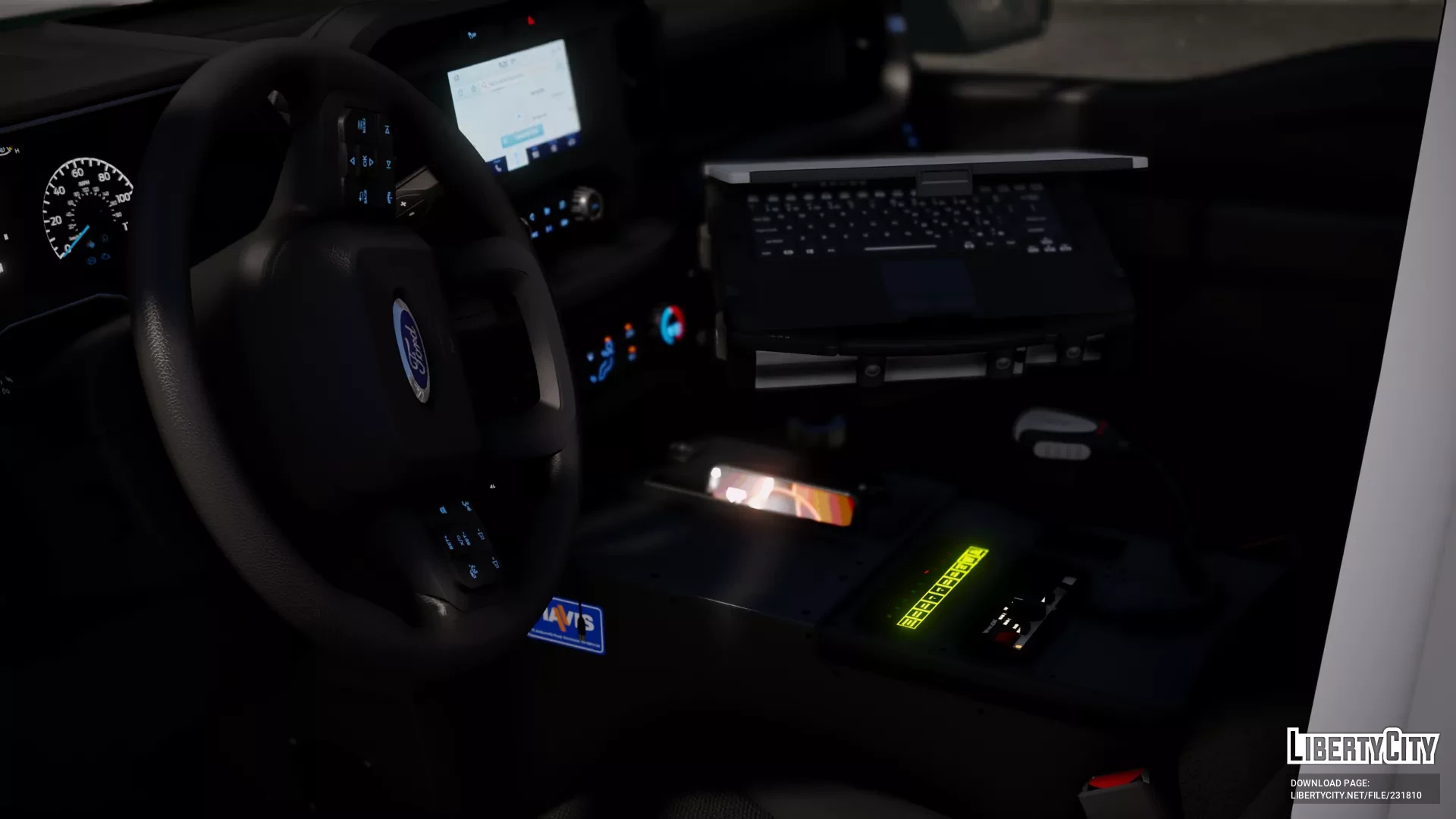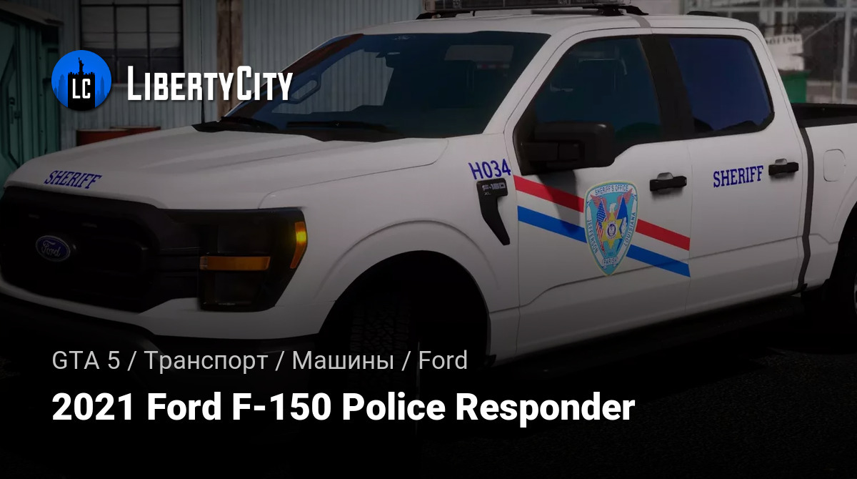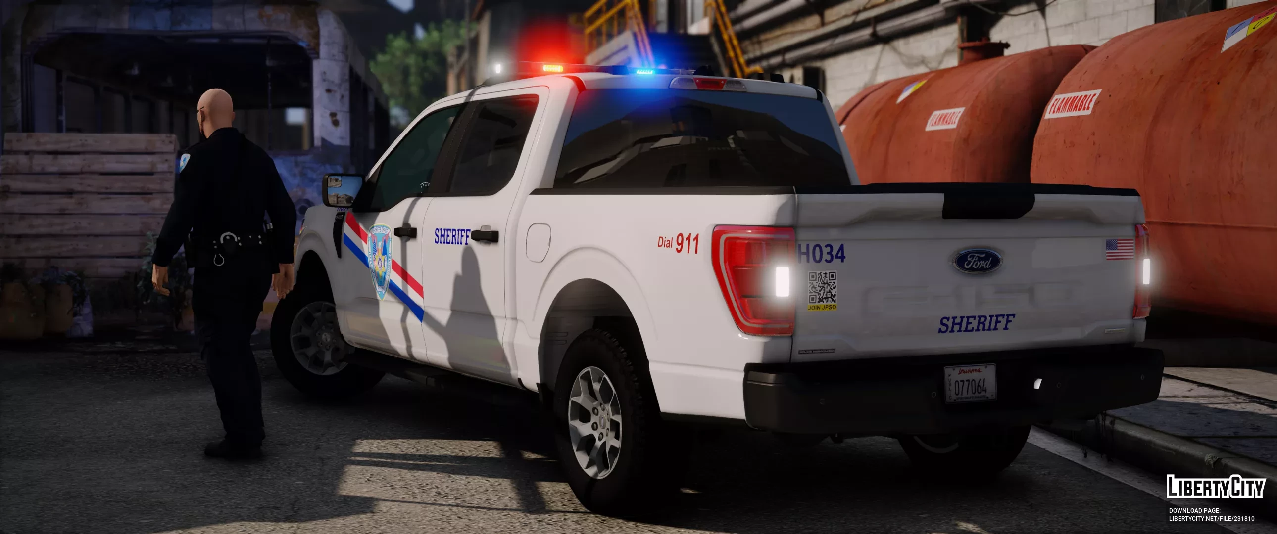 2021 Ford F-150 Police Responder — это современный полицейский пикап с агрессивным и строгим внешним видом. Кузов окрашен в белый цвет, по бокам расположены фирменные полосы синего и красного цвета, а также крупный герб шерифа. На дверях и капоте нанесены надписи "SHERIFF". На крыше установлена световая балка. Передняя часть автомобиля оснащена черной решеткой радиатора и массивным бампером, придающими ему внушительный вид. Фары прямоугольные, с интегрированными оранжевыми указателями поворота. Колеса стандартные, с простыми дисками, что подчеркивает служебное назначение машины. На кузове также имеются обозначения вызова 911 и служебный номер. Общий стиль автомобиля сочетает в себе практичность и авторитетность, идеально подходя для патрульной службы.