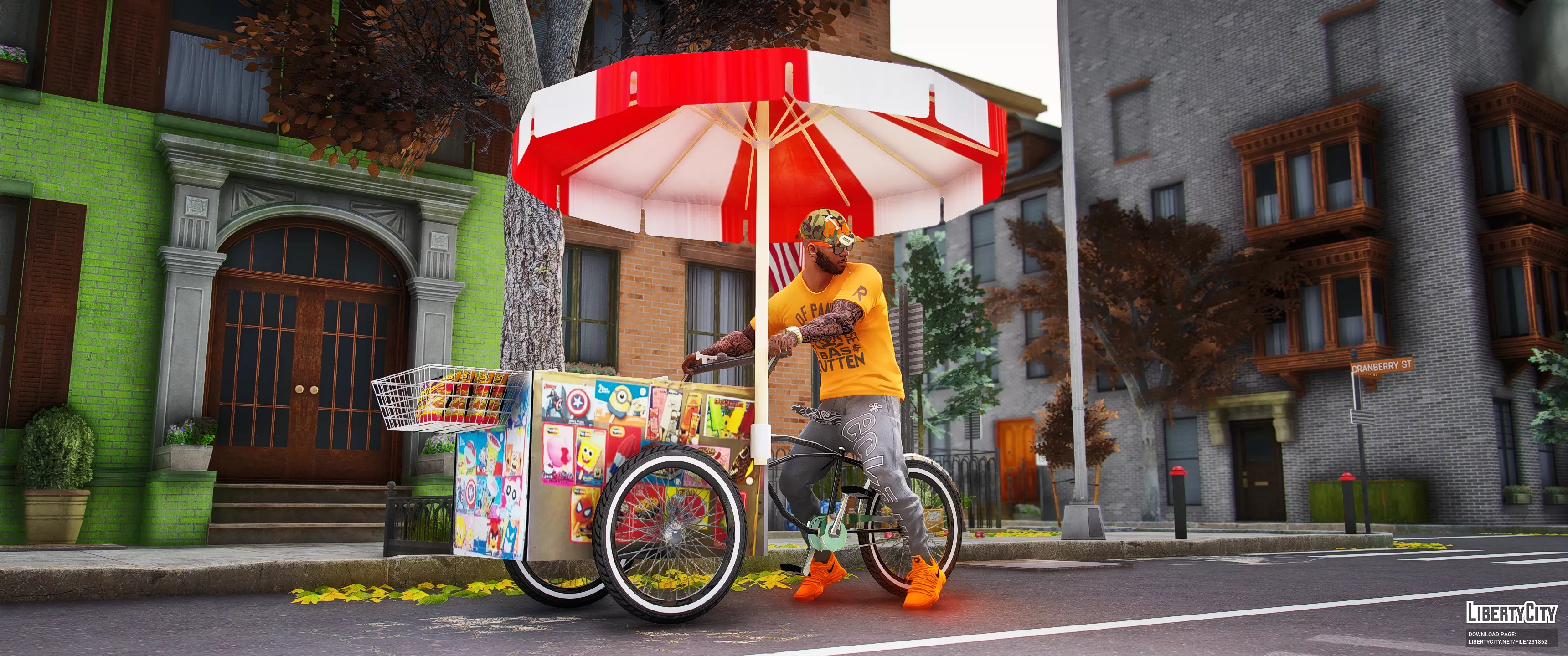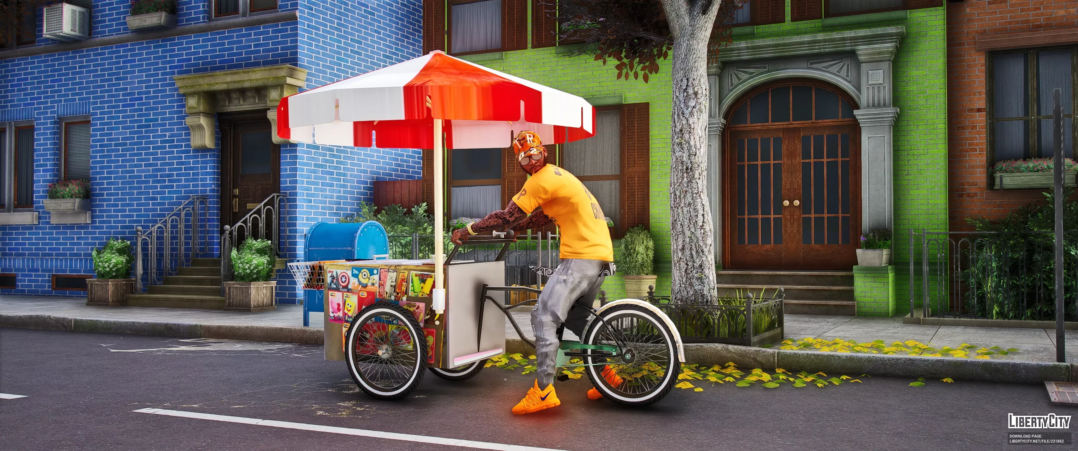 Велосипед-мороженщик состоит из трёхколёсного велосипеда с большой металлической тележкой спереди. На тележке установлены три отделения для мороженого, а также большая корзина для хранения дополнительных товаров. Корпус тележки украшен яркими наклейками с изображениями различных видов мороженого и мультяшных персонажей, что привлекает внимание детей и прохожих. Над тележкой расположен большой зонтик в красно-белую полоску, защищающий продавца и продукты от солнца. Колёса велосипеда массивные, что обеспечивает устойчивость конструкции.