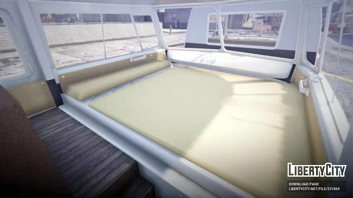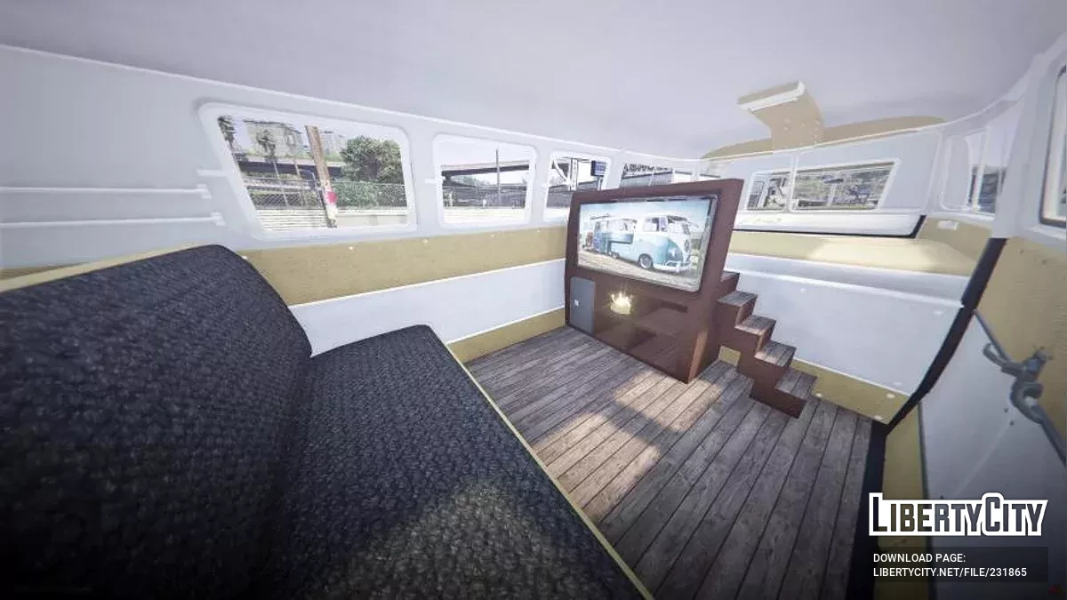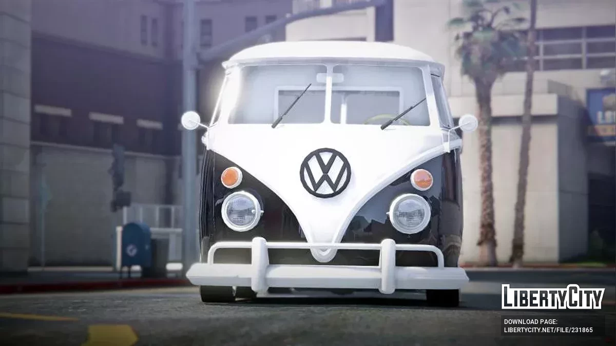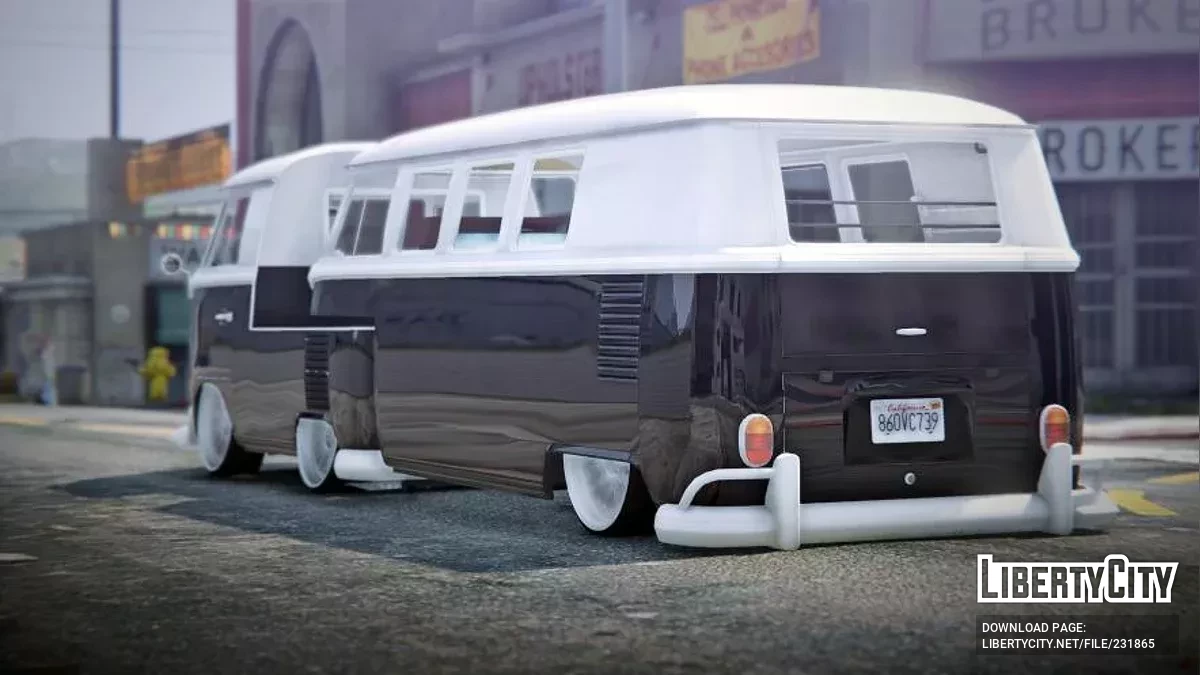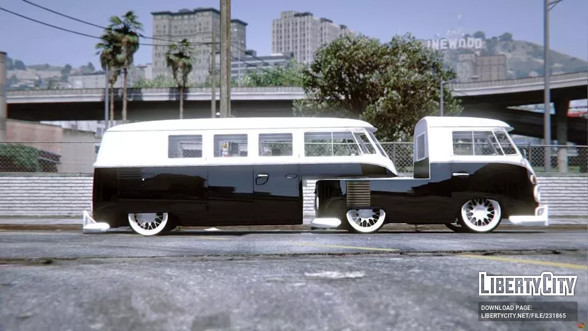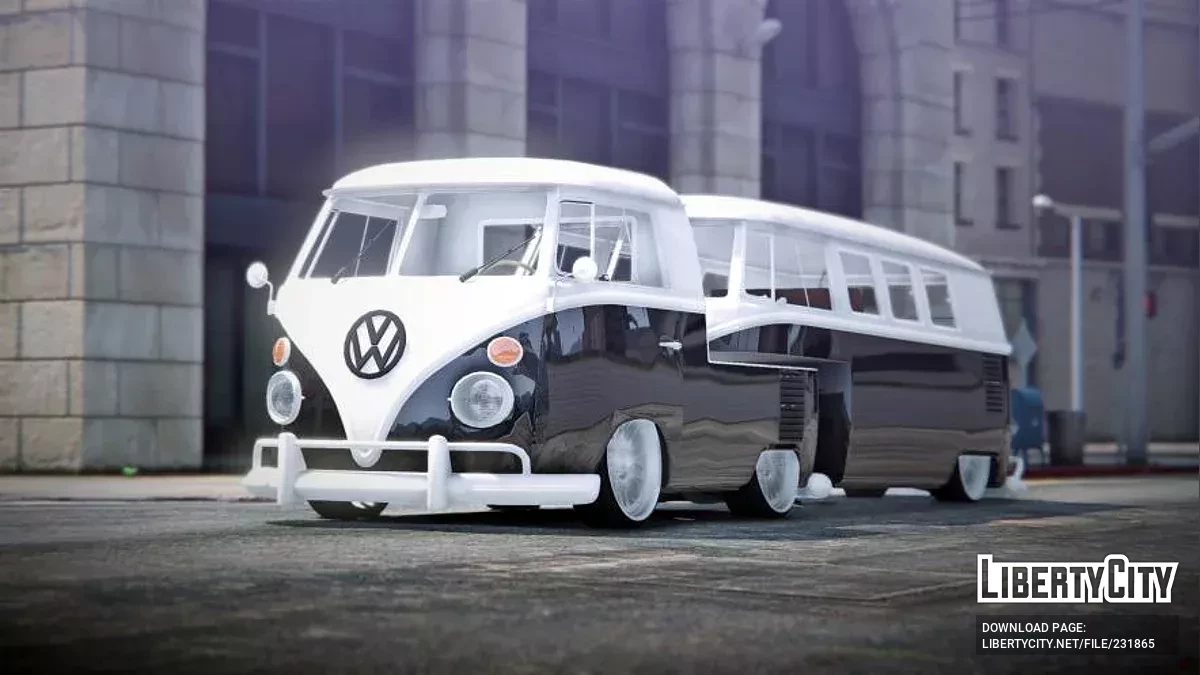Volkswagen T1 With Trailer — это классический микроавтобус с прицепом, выполненный в ретро-стиле. Основной кузов окрашен в два цвета: верхняя часть белая, а нижняя — черная. Передняя часть украшена крупной эмблемой Volkswagen, а также характерными круглыми фарами и хромированным бампером. Окна большие, с тонкими рамками, что придает автомобилю винтажный вид. Прицеп выполнен в том же стиле и цветовой гамме, повторяя форму и окна основного кузова. Колеса окрашены в белый цвет, что подчеркивает классический образ автомобиля.