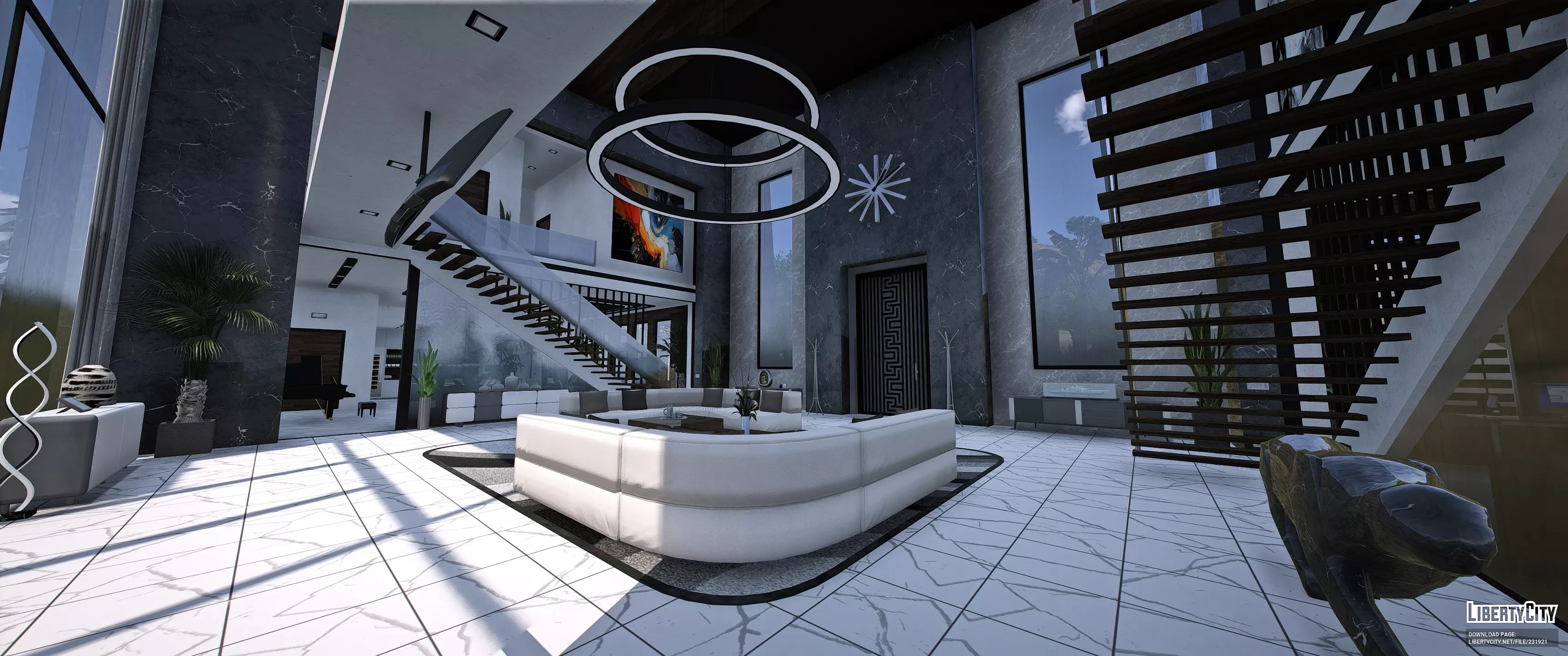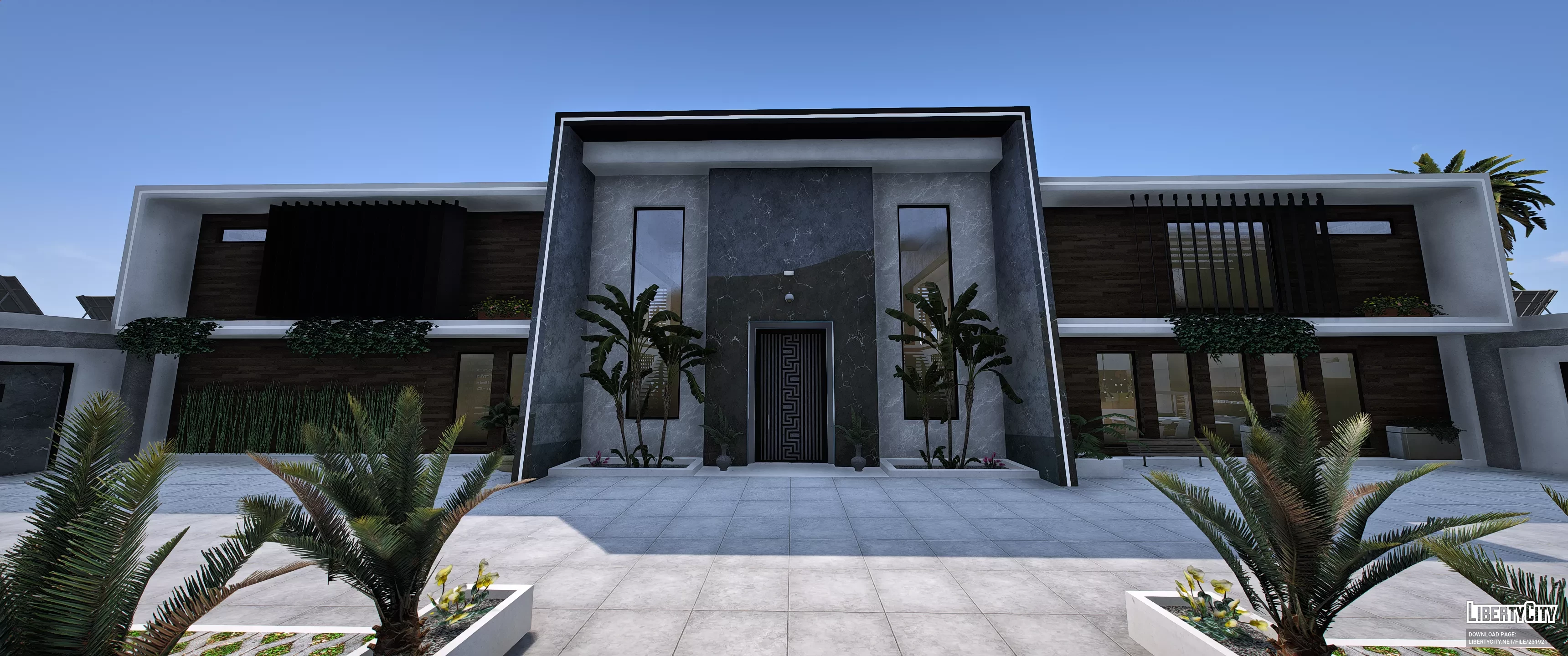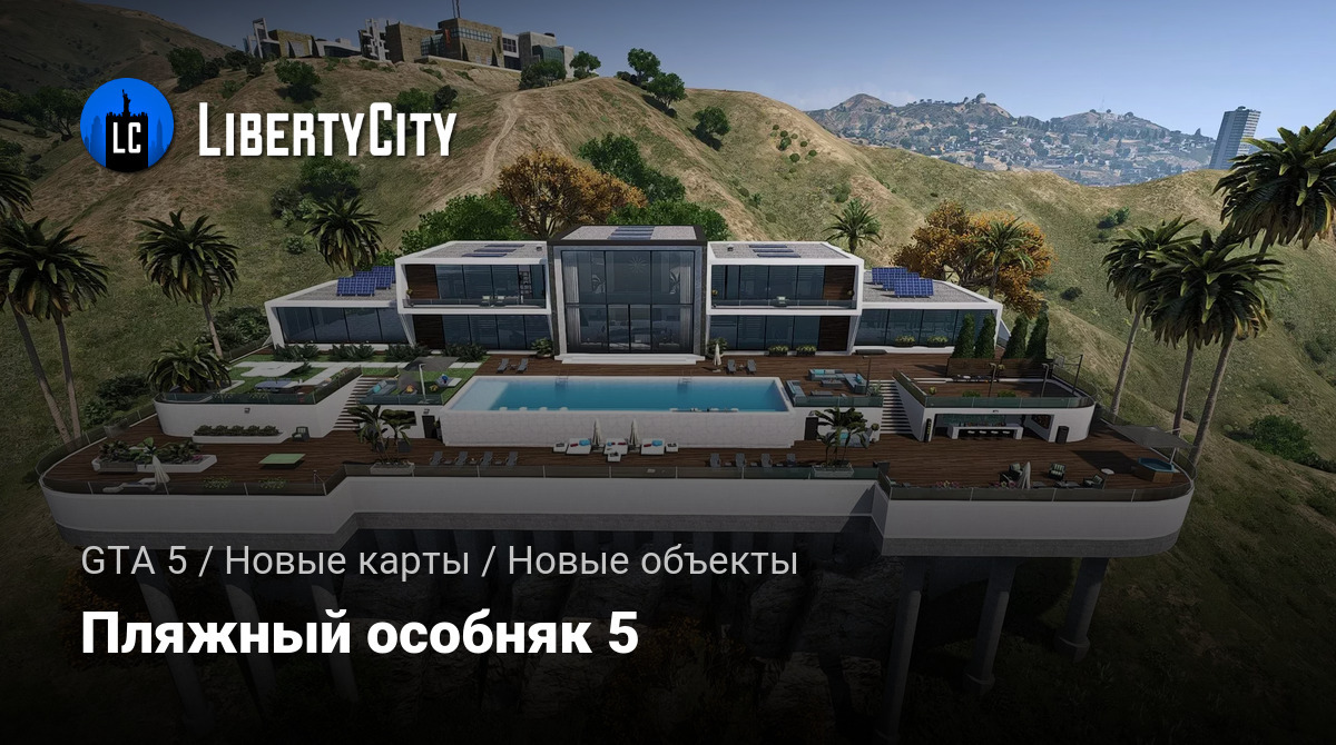 Beach Mansion 5 — это роскошный современный особняк, расположенный на возвышенности с панорамным видом на окрестности. Здание выполнено в стиле хай-тек с преобладанием стеклянных фасадов и четких геометрических линий. Особняк стоит на массивных бетонных опорах, что создает эффект парения над скалой.