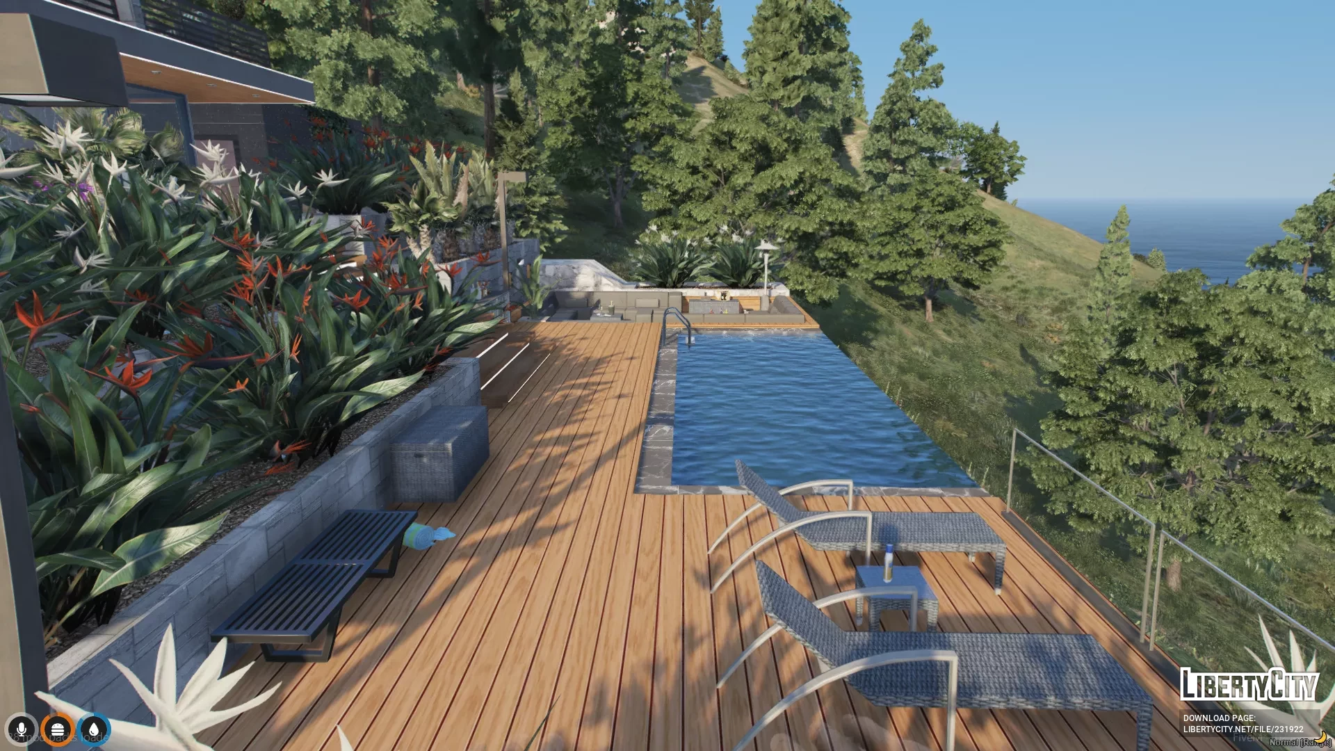 Design House расположен на живописном склоне с видом на море. Дом окружён высокой зелёной изгородью из стройных кипарисов и других деревьев, что создаёт атмосферу уединённости и приватности. Территория ограждена прочным каменным забором с элементами дерева, а центральный вход украшен металлическими воротами. Перед домом просторная подъездная дорожка и парковка для автомобилей. Архитектура здания выполнена в современном стиле: большие панорамные окна, ровные линии и лаконичные формы. Дом гармонично вписывается в природный ландшафт, а из его окон открывается панорамный вид на океан.