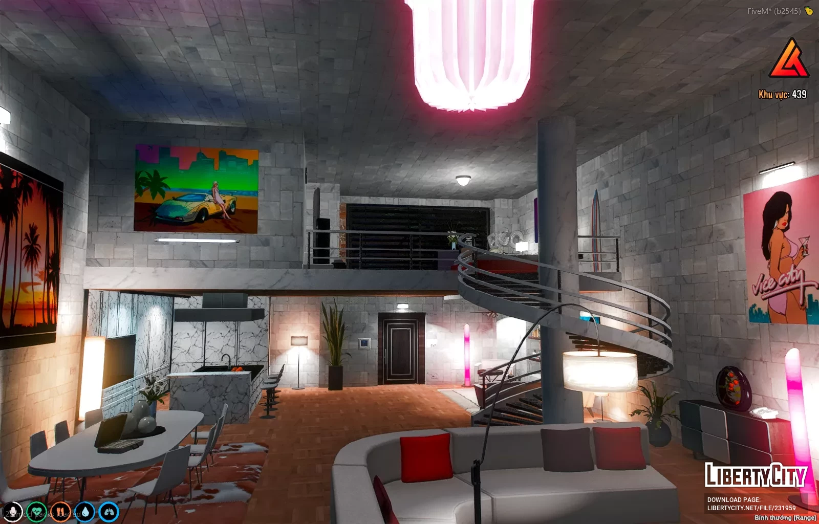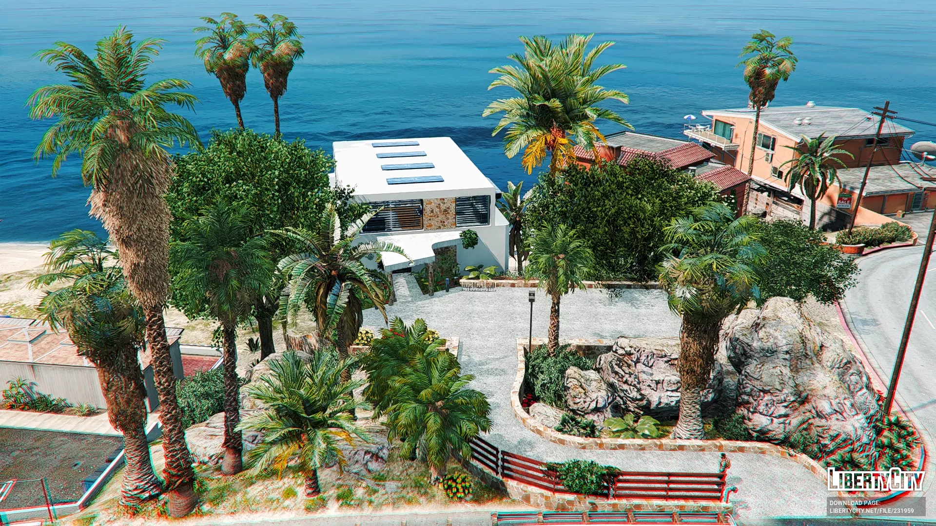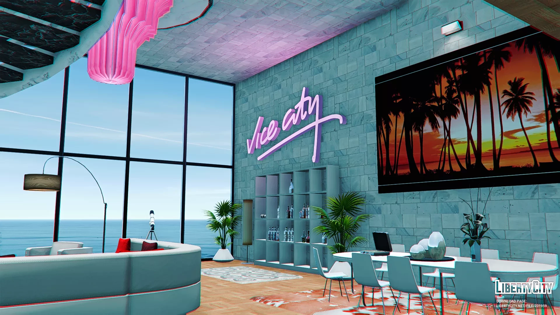 Vice City Loft — это современный двухэтажный особняк в стиле минимализм, расположенный прямо на берегу моря. Дом возвышается на высоких сваях, что защищает его от приливов и создает эффект "парящего" здания. Фасад выполнен в светлых тонах, с огромными панорамными окнами, через которые виден стильный интерьер с яркой неоновой подсветкой. Вокруг дома растут высокие пальмы, создавая атмосферу тропического уединения. В темное время суток дом выделяется благодаря мягкой розово-фиолетовой подсветке, подчеркивающей его архитектурные линии. Лофт идеально вписывается в прибрежный ландшафт, сочетая роскошь и современный дизайн.