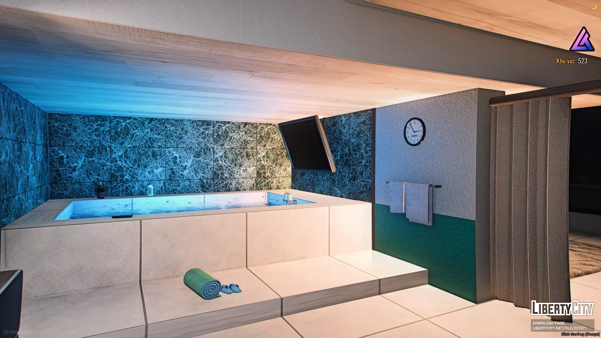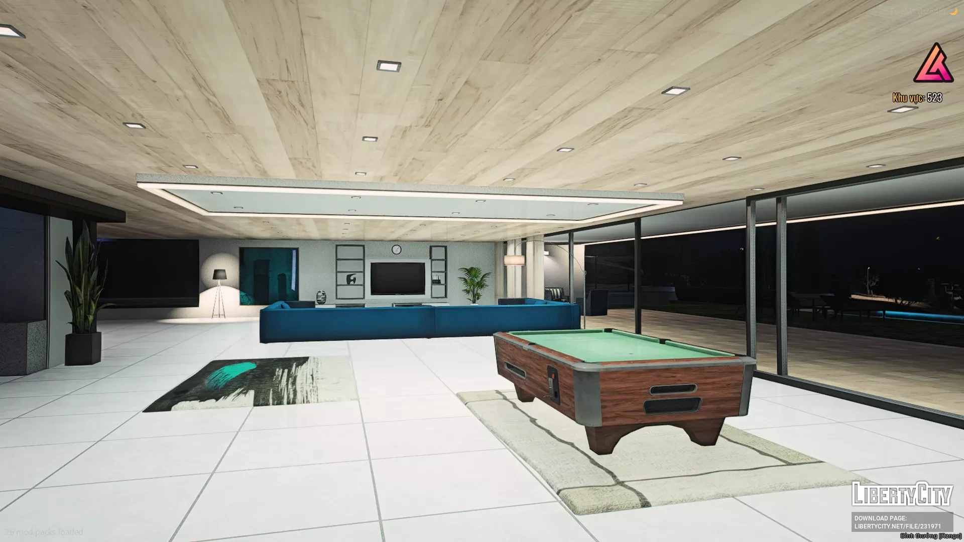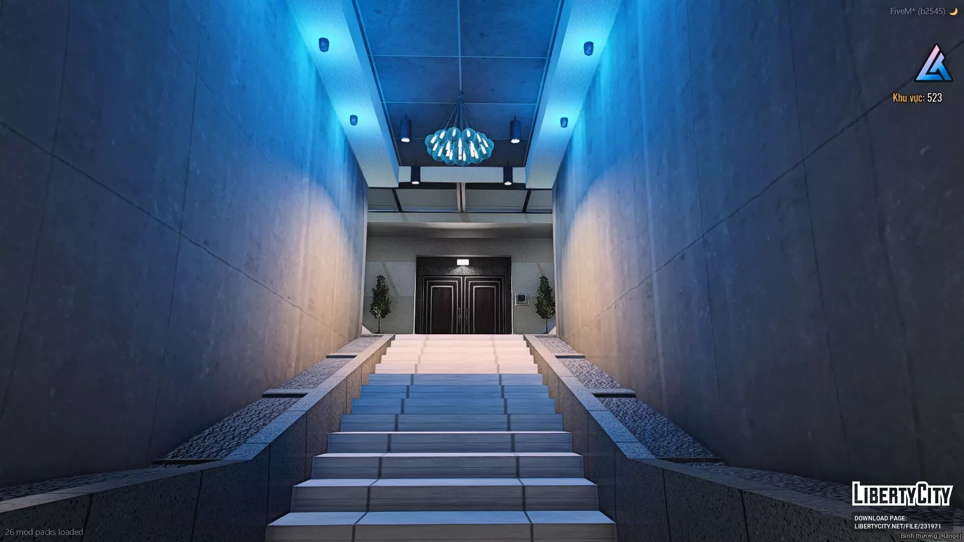 Вход на территорию осуществляется через автоматические ворота, ведущие по широкой каменной дорожке к главному дому и гаражу. Слева от дома находится вертолётная площадка, что подчёркивает статус и роскошь особняка.