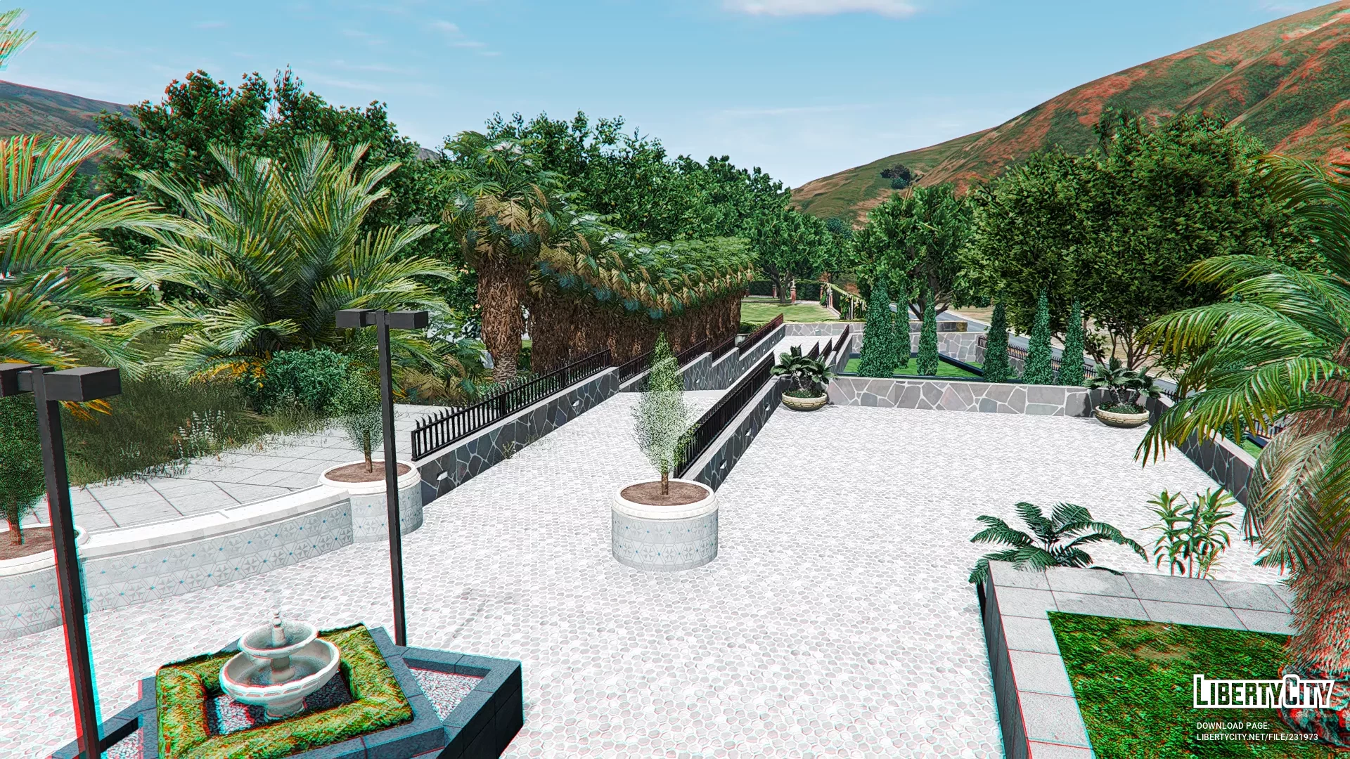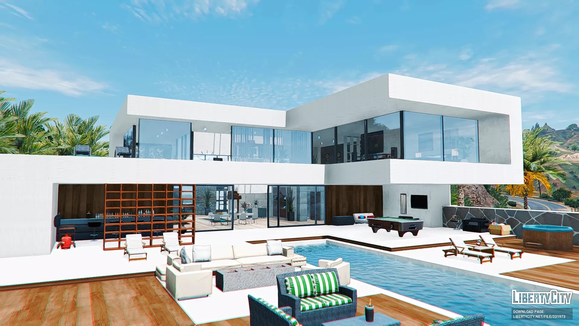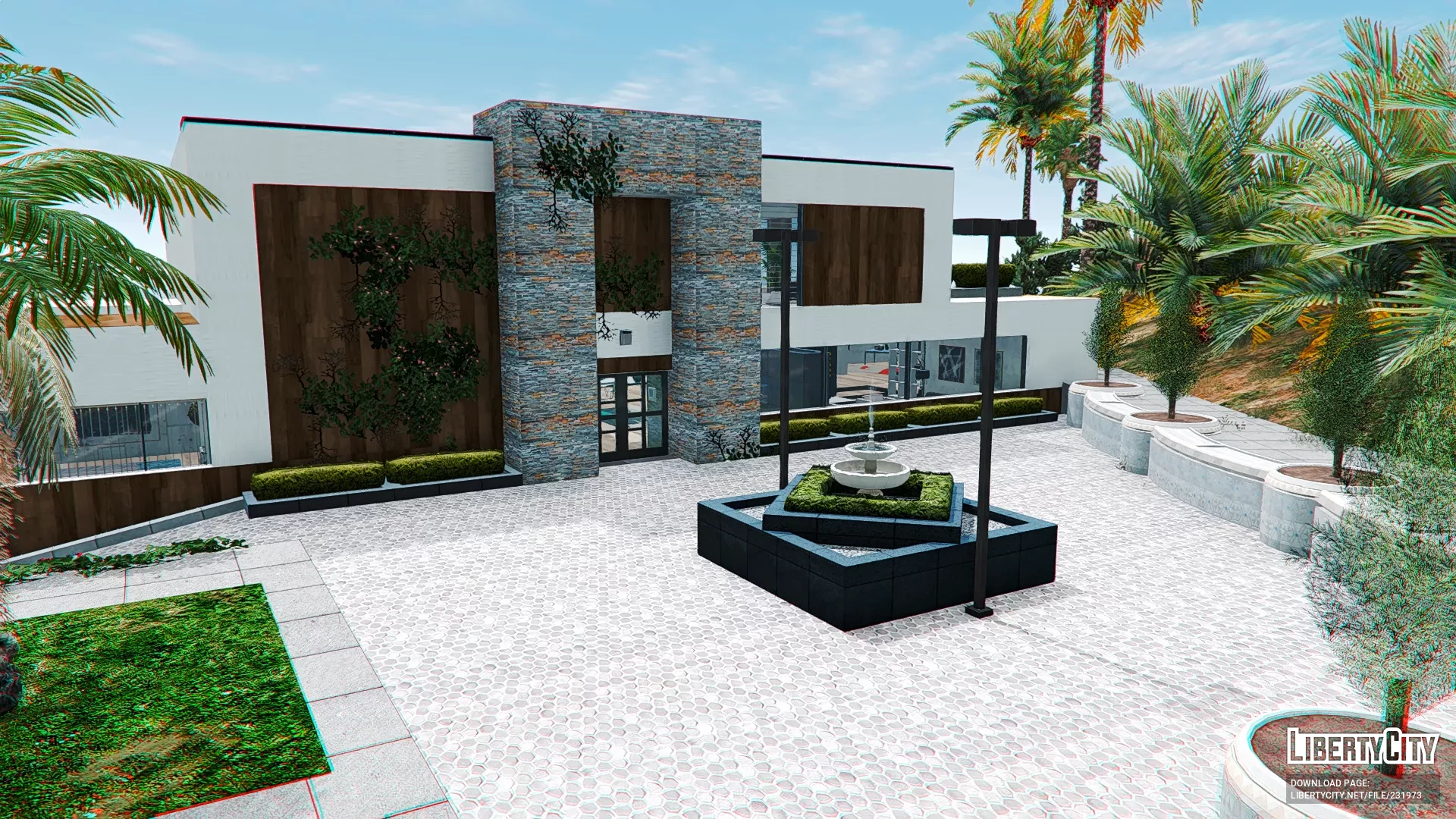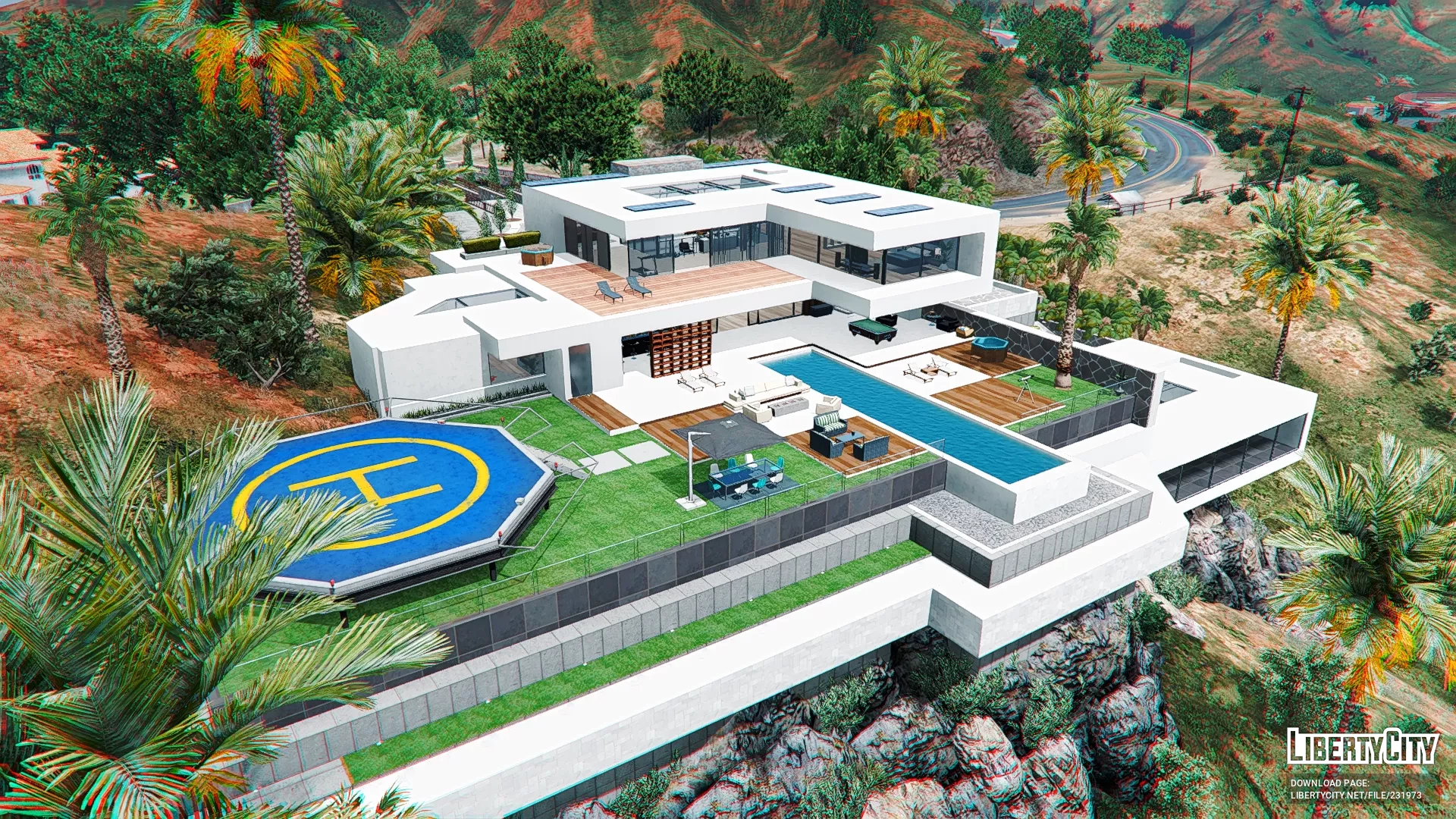 Внешний вид Mega Villa Design выполнен в современном стиле с акцентом на минимализм и простор. Вилла располагается на возвышенности, окружена густой зелёной растительностью и пальмами, что создаёт атмосферу уединённости и роскоши. Здание имеет прямоугольные формы с плоской крышей, большие панорамные окна и светлый фасад, выполненный преимущественно в белых и серых тонах. Территория вокруг дома обнесена каменным забором, а ландшафт тщательно продуман: аккуратные газоны, декоративные деревья и кустарники, а также просторные террасы и парковочные зоны. Вилла гармонично вписывается в живописный горный ландшафт, открывая захватывающий вид на окрестности и побережье.