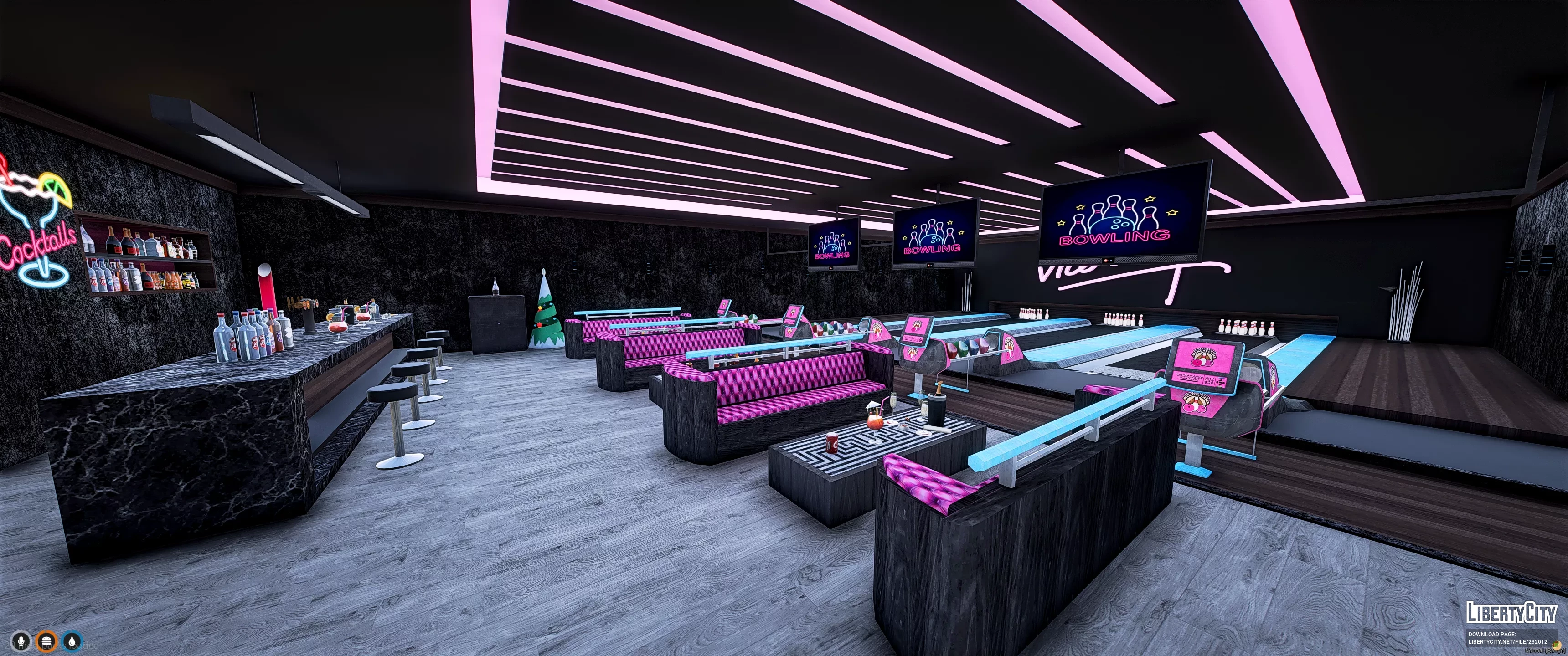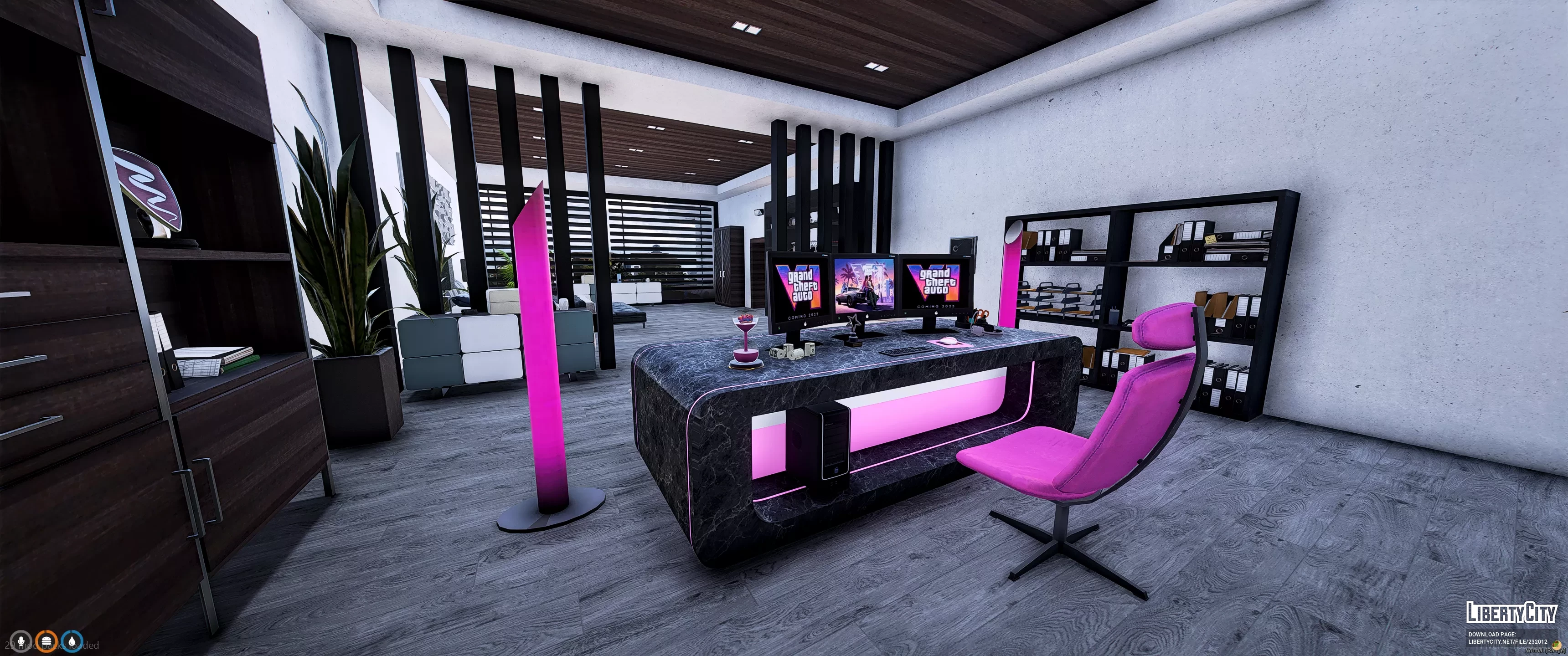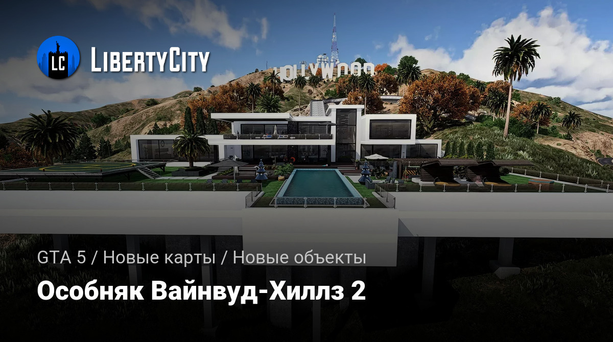 Особняк Vinewood Hills Mansion 2 расположен на живописном склоне холма и выделяется современным архитектурным стилем. Фасад здания выполнен в светлых тонах с элементами натурального камня и панорамными окнами, открывающими впечатляющий вид на город. Просторная терраса украшена стеклянными ограждениями, а у входа расположена ухоженная зелёная лужайка с декоративными кустарниками. На территории особняка имеется большой бассейн с зоной для отдыха, а также гараж на несколько автомобилей. Внешний облик дома подчёркивает роскошь и престиж этого уникального места.