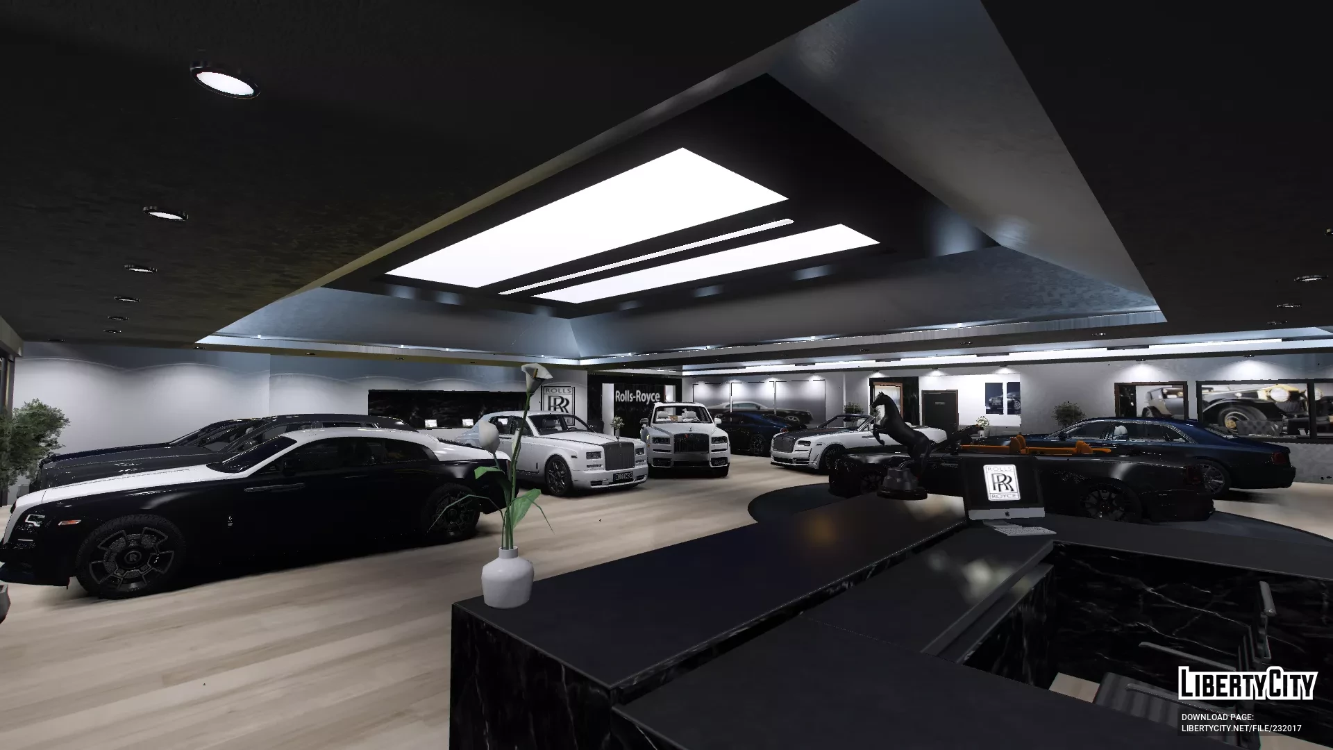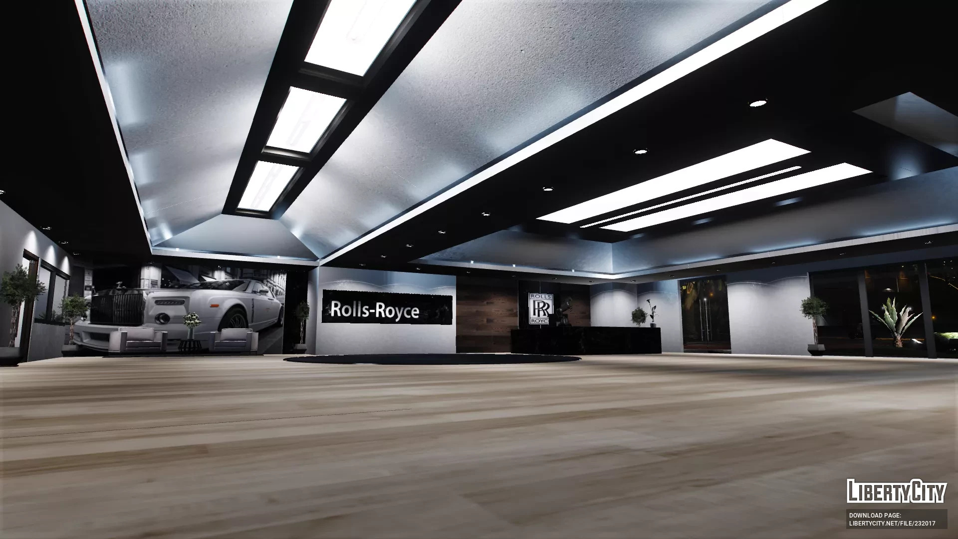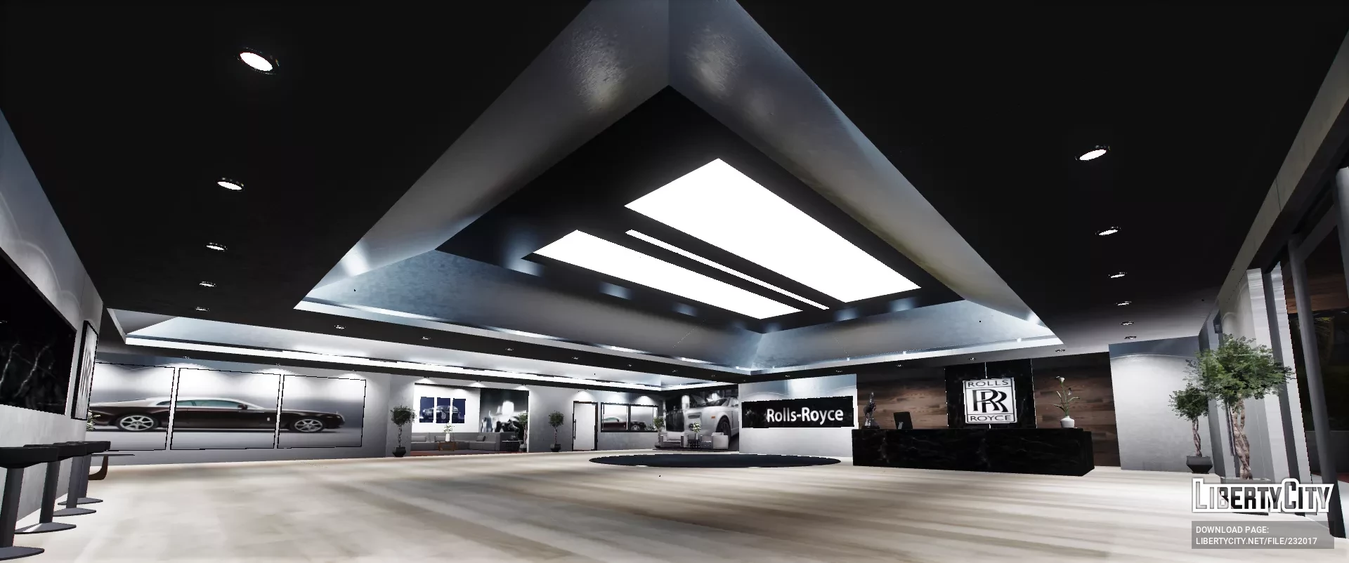 Салон Rolls Royce выглядит очень современно и роскошно. Просторное помещение с высокими потолками и большим количеством света благодаря панорамным светильникам. На полу уложен светлый паркет, который подчёркивает элегантность интерьера. В центре зала стоят несколько автомобилей Rolls Royce разных моделей и цветов — от классического белого до насыщенного чёрного и темно-синего. Вдоль стен размещены декоративные растения и картины, добавляющие уюта. На переднем плане — стойка ресепшн с компьютером и фирменной символикой Rolls Royce. В салоне царит атмосфера премиального класса, чистота и порядок, всё продумано до мелочей для максимального комфорта посетителей.