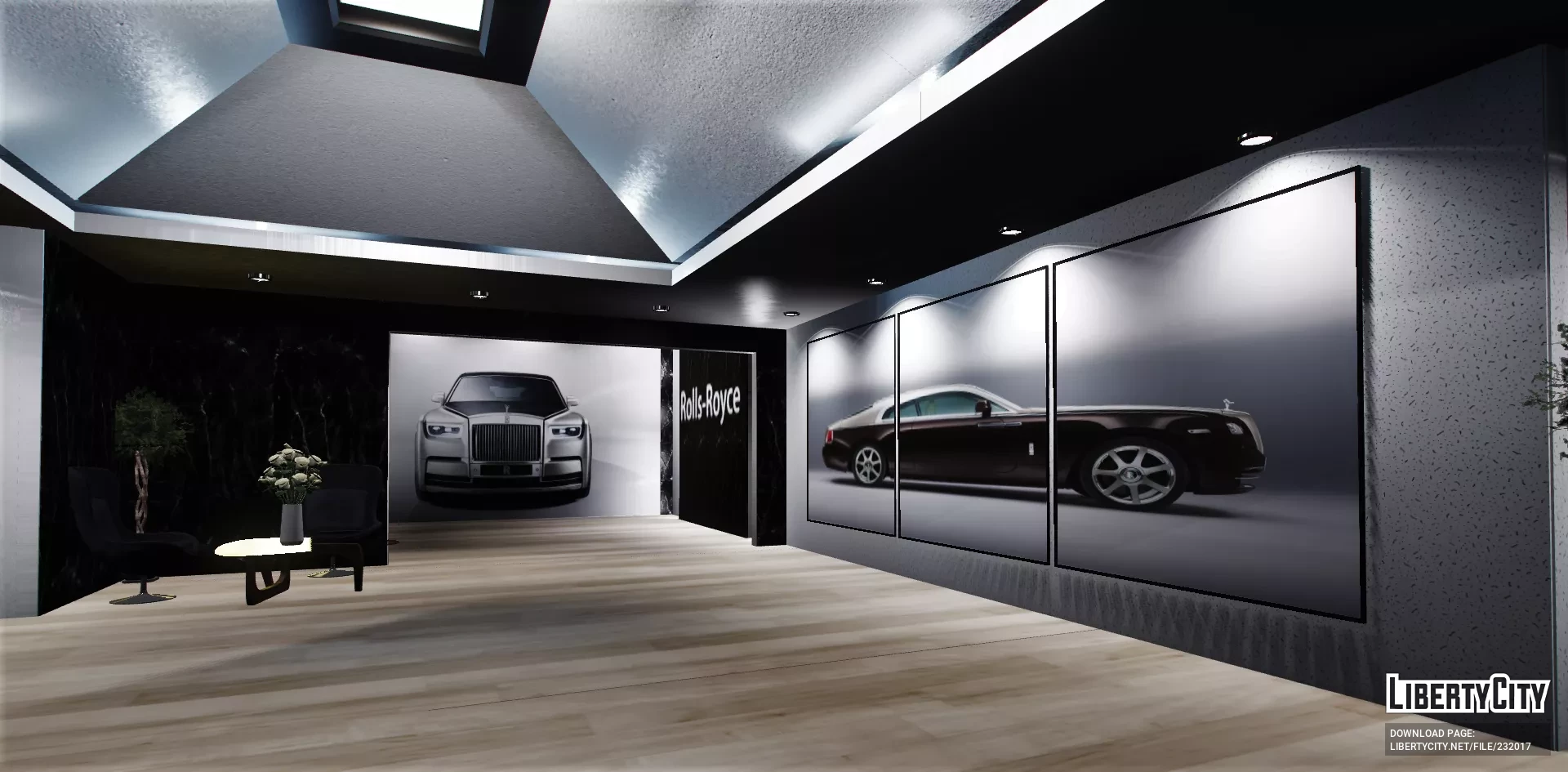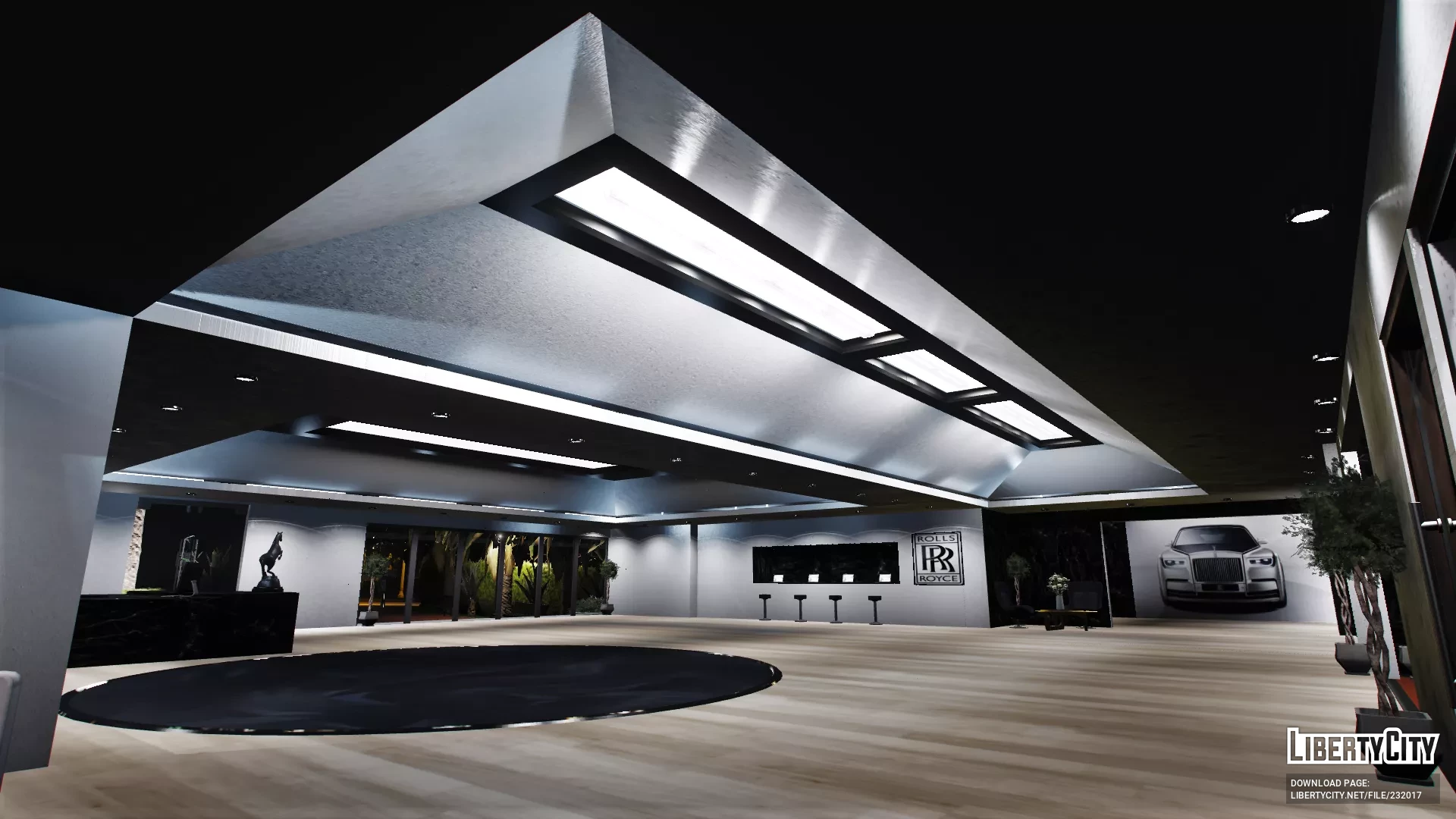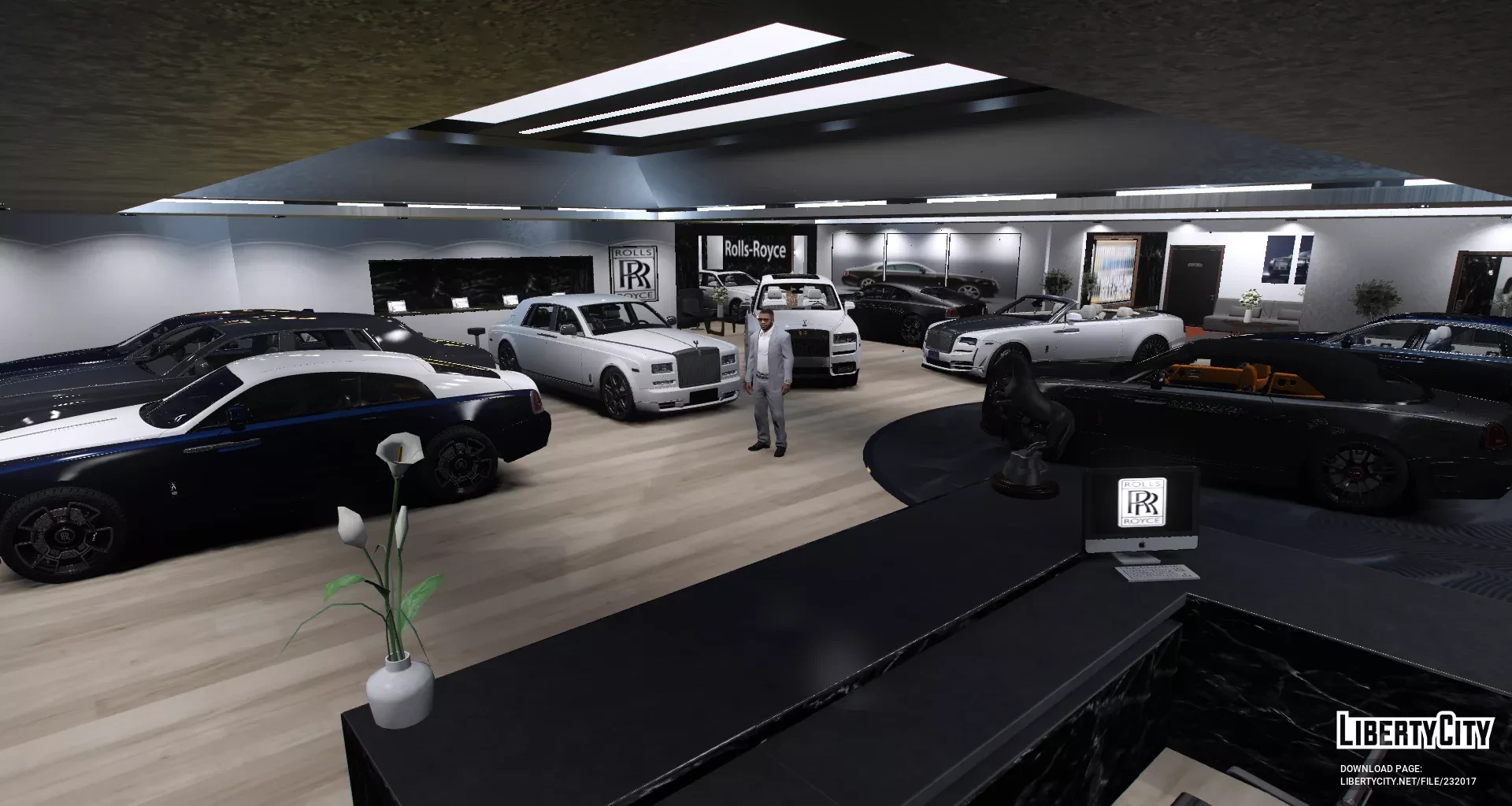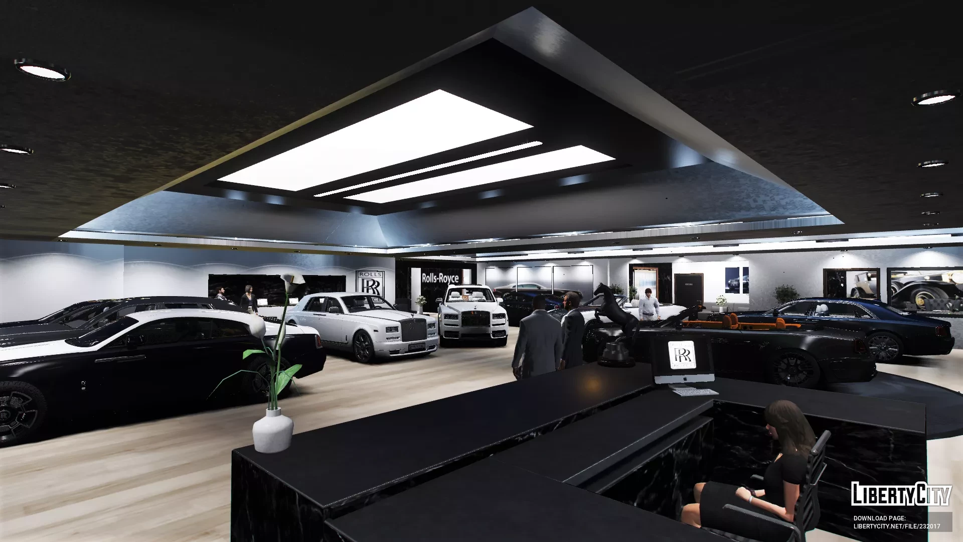 Салон Rolls Royce выглядит очень современно и роскошно. Просторное помещение с высокими потолками и большим количеством света благодаря панорамным светильникам. На полу уложен светлый паркет, который подчёркивает элегантность интерьера. В центре зала стоят несколько автомобилей Rolls Royce разных моделей и цветов — от классического белого до насыщенного чёрного и темно-синего. Вдоль стен размещены декоративные растения и картины, добавляющие уюта. На переднем плане — стойка ресепшн с компьютером и фирменной символикой Rolls Royce. В салоне царит атмосфера премиального класса, чистота и порядок, всё продумано до мелочей для максимального комфорта посетителей.