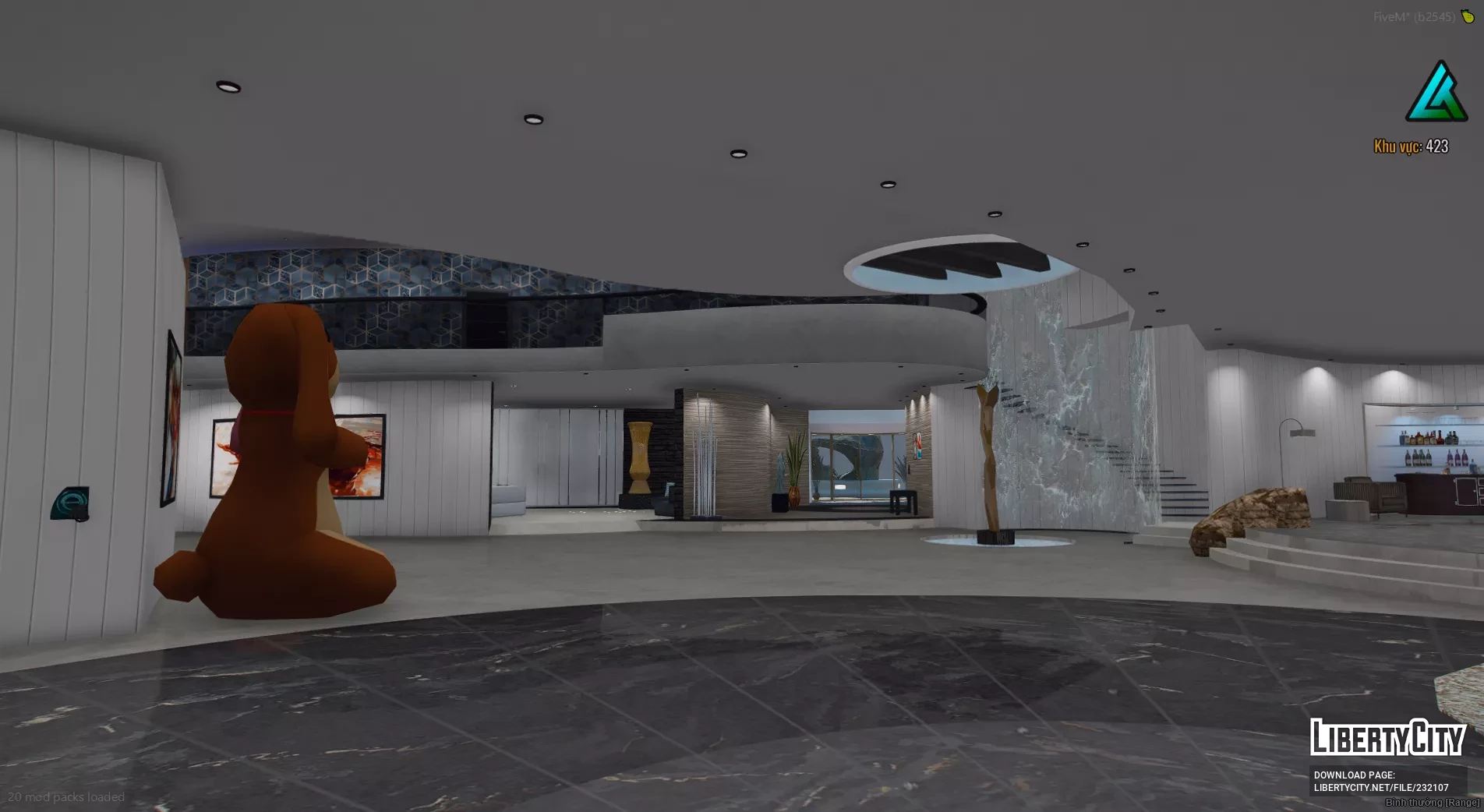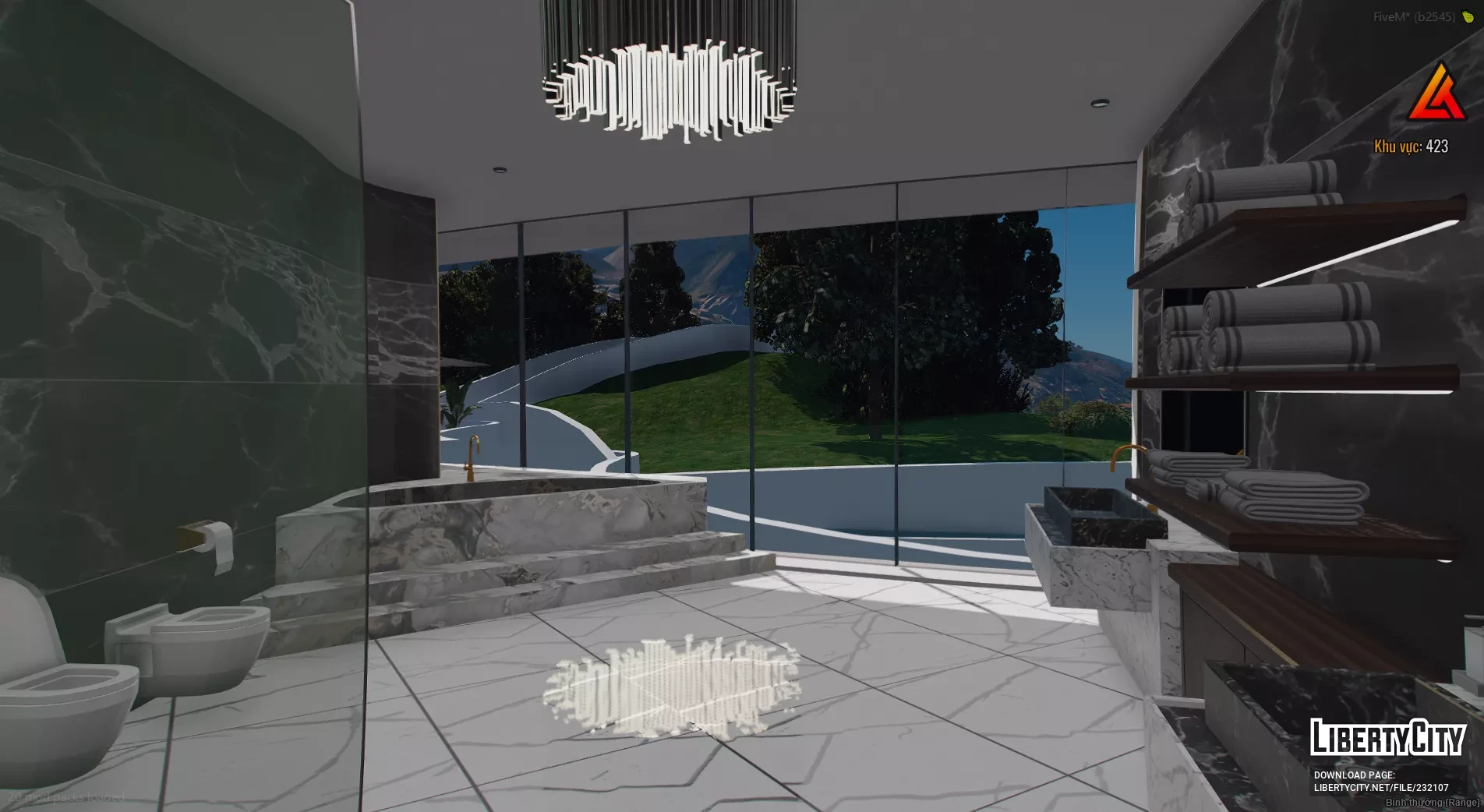 Перед домом располагается просторная круглая площадка с фонтаном, ведущая к главному входу. Территория вокруг особняка ухожена: зелёные газоны, пальмы и декоративные кустарники создают атмосферу роскоши и уединения. На участке также находится современный теннисный корт, расположенный на платформе над склоном, что подчёркивает уникальность архитектурного решения.