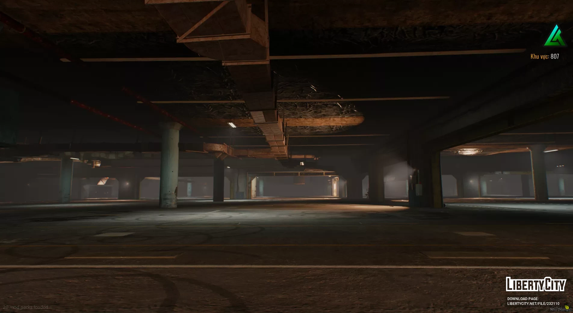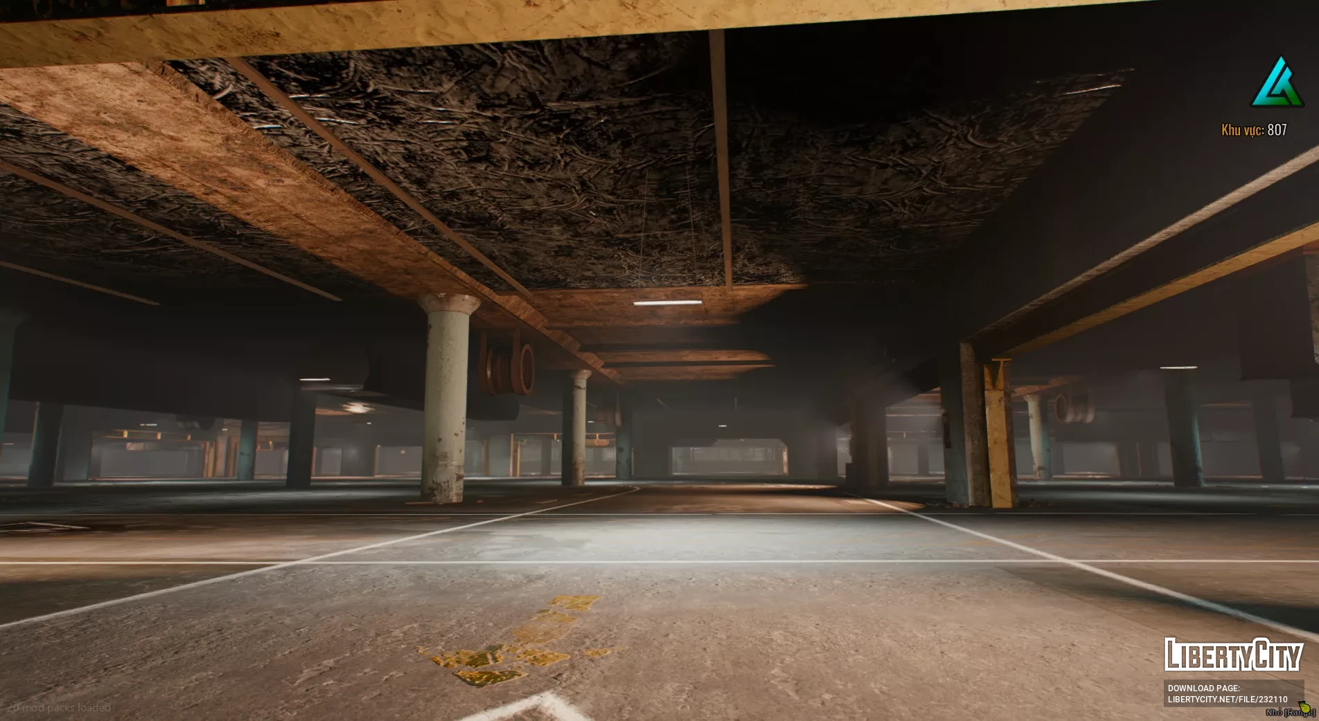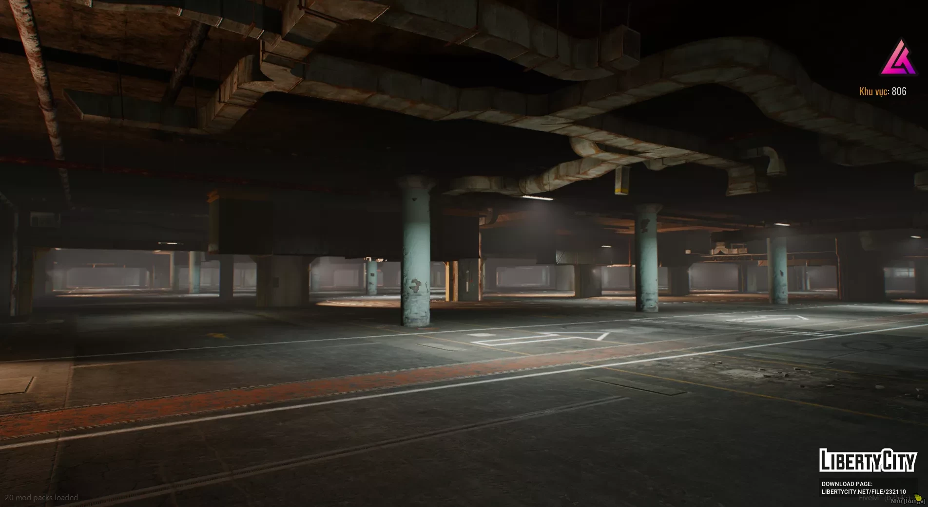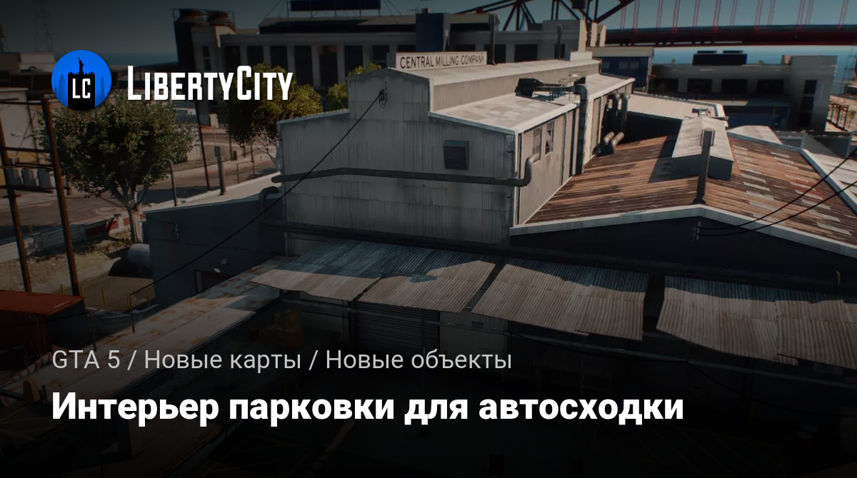 Car Meet Parking Lot Interior расположен на территории промышленной зоны. Здание выполнено в индустриальном стиле: серые металлические стены, крыша из волнистого железа с видимыми следами ржавчины и старения. На фасаде есть вывеска "CENTRAL MILLING COMPANY". Перед зданием — просторная парковочная зона с разметкой для автомобилей, жёлтыми линиями и несколькими бочками. Крытая площадка выполнена из металлического навеса, поддерживаемого столбами. Вокруг здания расположены контейнеры, ящики и мусорные баки, создающие атмосферу рабочей индустриальной площадки. Рядом растут несколько деревьев, а вдали виден крупный мост и другие промышленные постройки.