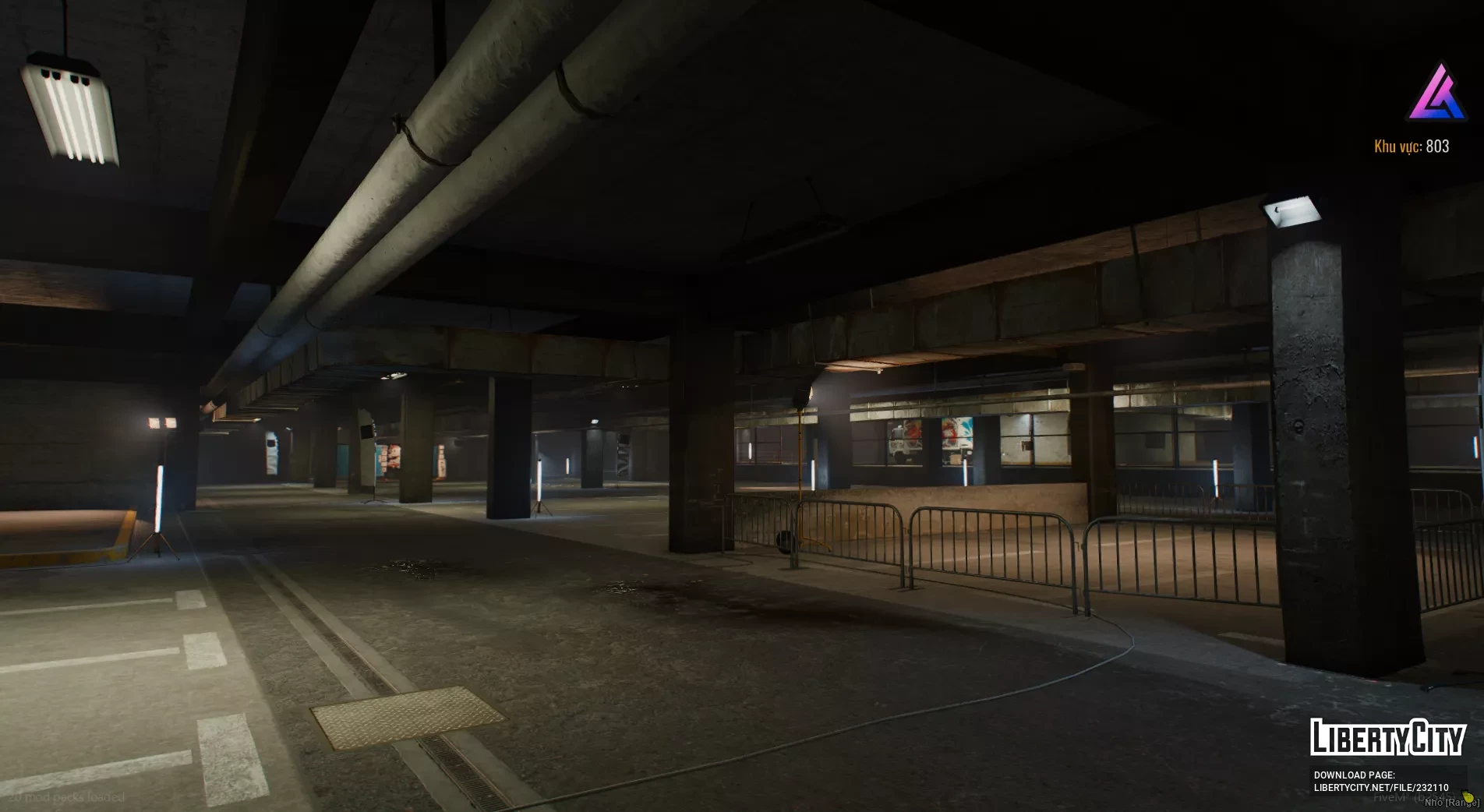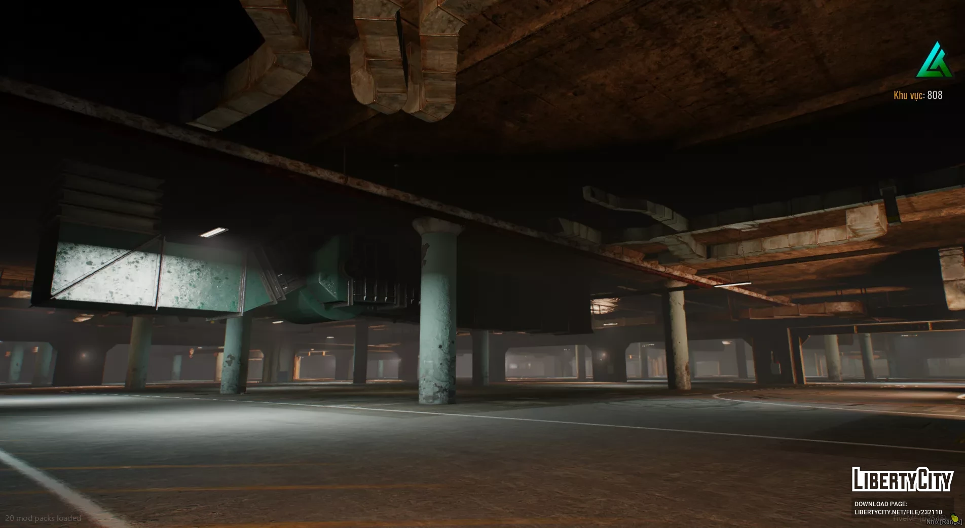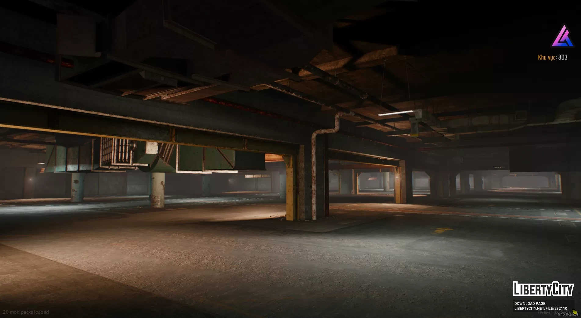 Car Meet Parking Lot Interior расположен на территории промышленной зоны. Здание выполнено в индустриальном стиле: серые металлические стены, крыша из волнистого железа с видимыми следами ржавчины и старения. На фасаде есть вывеска "CENTRAL MILLING COMPANY". Перед зданием — просторная парковочная зона с разметкой для автомобилей, жёлтыми линиями и несколькими бочками. Крытая площадка выполнена из металлического навеса, поддерживаемого столбами. Вокруг здания расположены контейнеры, ящики и мусорные баки, создающие атмосферу рабочей индустриальной площадки. Рядом растут несколько деревьев, а вдали виден крупный мост и другие промышленные постройки.