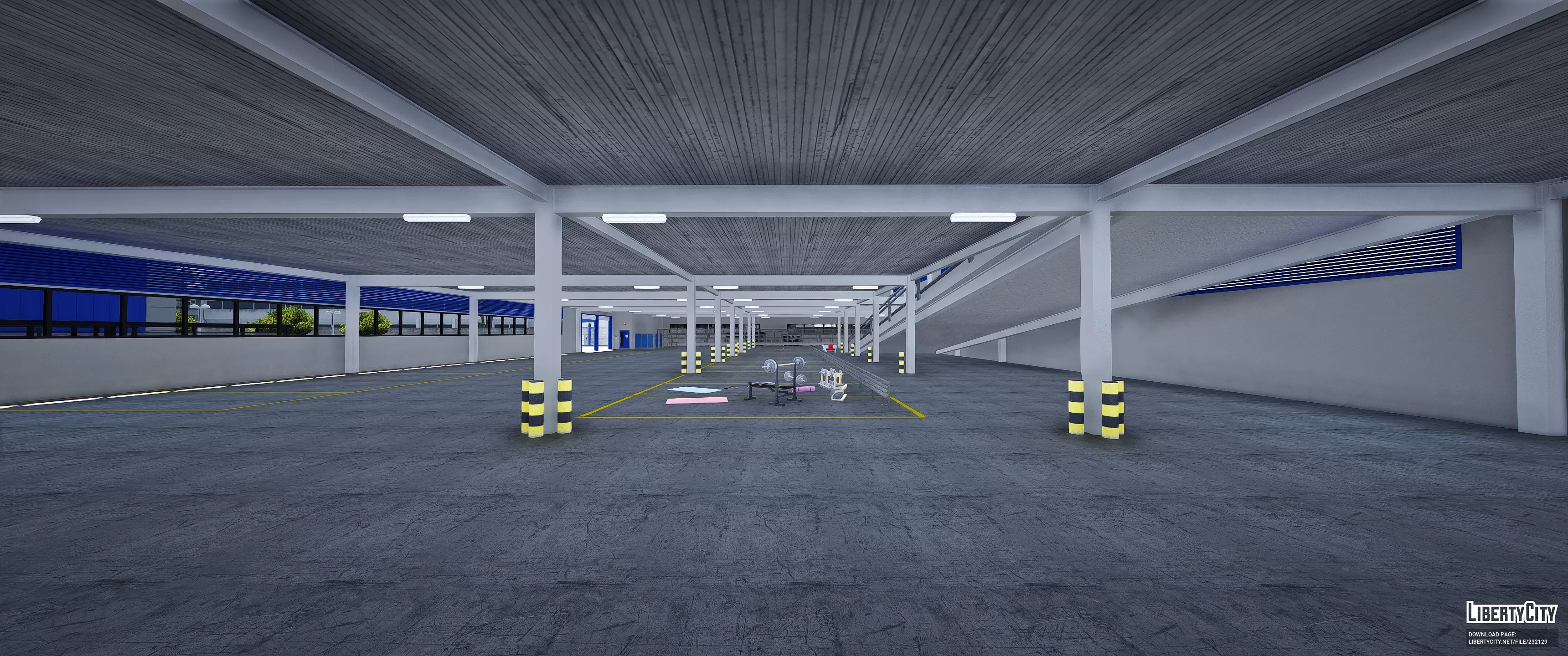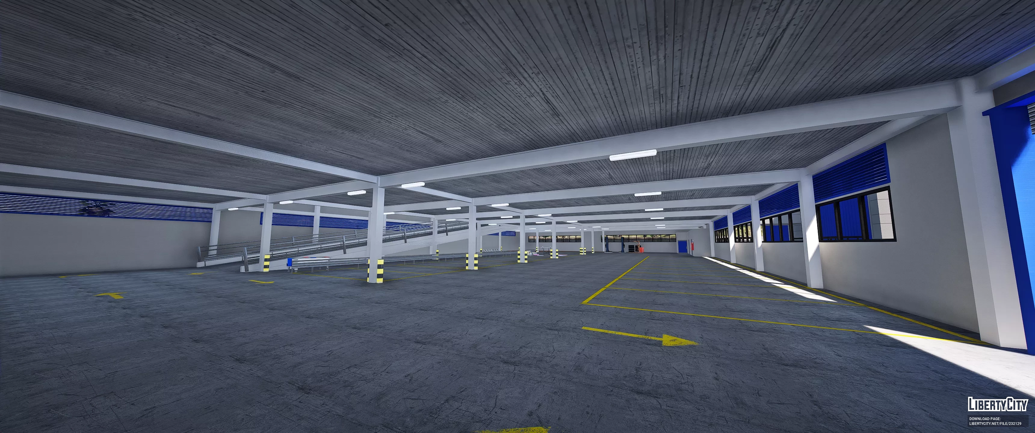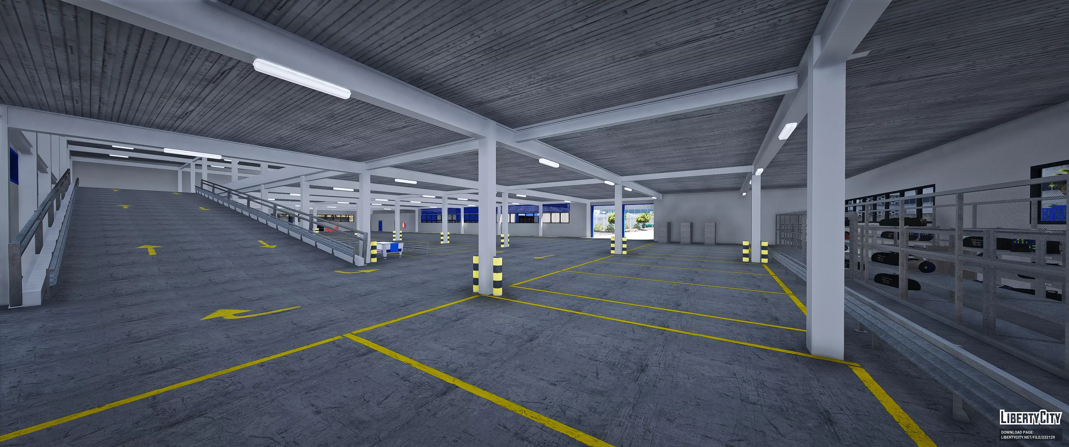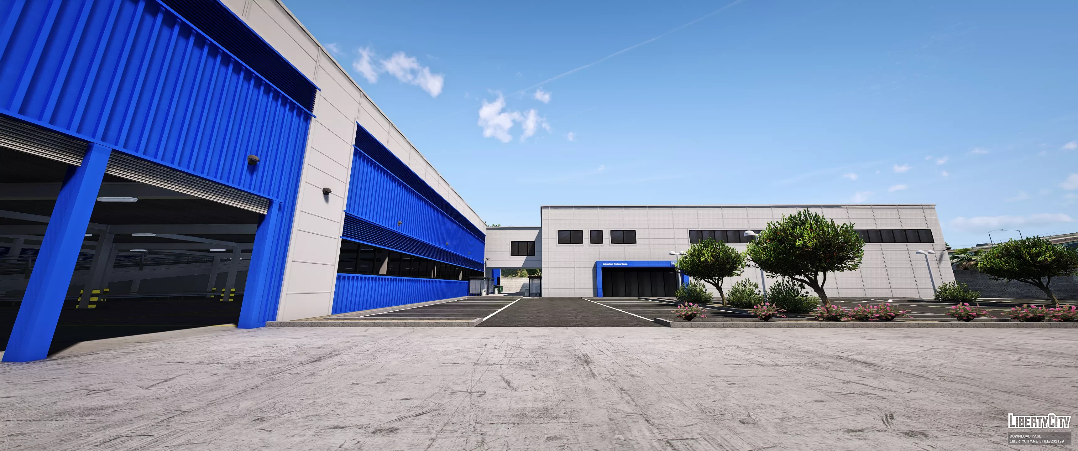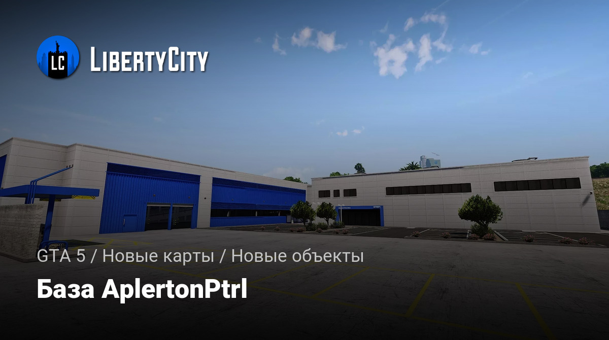База AplertonPtrl представляет собой современное промышленное здание с просторной асфальтированной территорией и разметкой для парковки. Основное здание выполнено в светло-серых тонах с большими синими воротами и дверями, что придаёт ему яркий и запоминающийся вид. Слева находится навес с оборудованием, выделенный жёлтым цветом. На территории базы высажены небольшие деревья и кустарники, что добавляет зелёных акцентов. Справа от главного здания располагается административный корпус с длинными горизонтальными окнами. Вся территория огорожена бетонным забором, создавая ощущение защищённости и порядка.