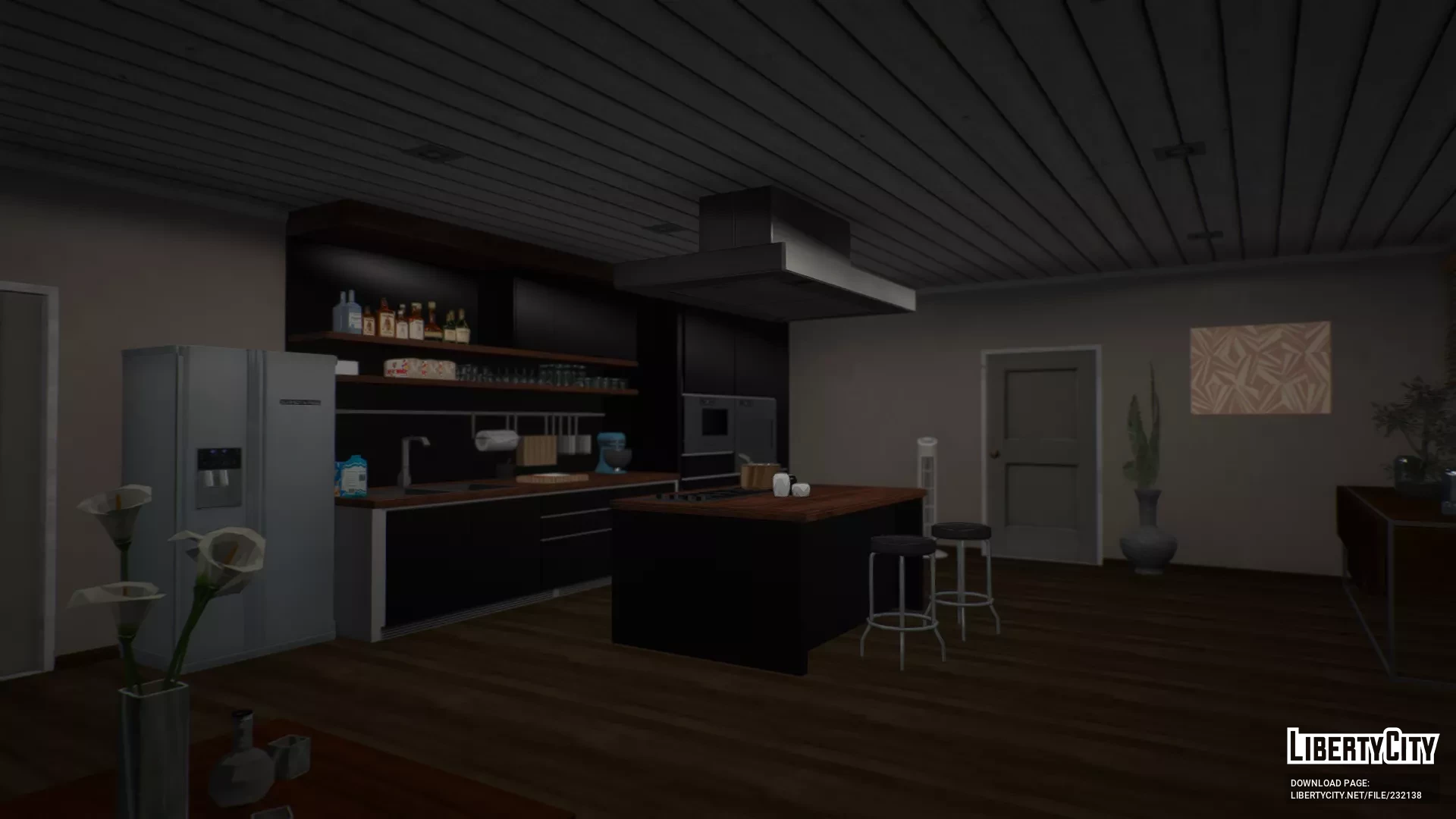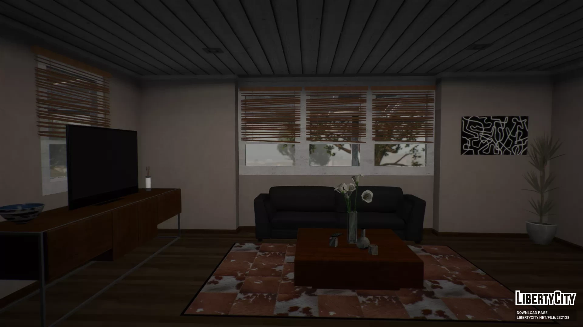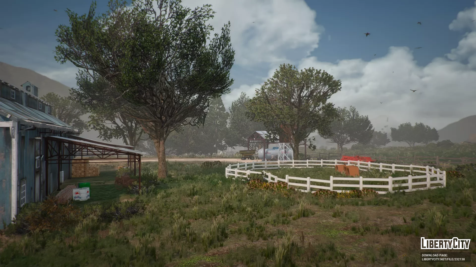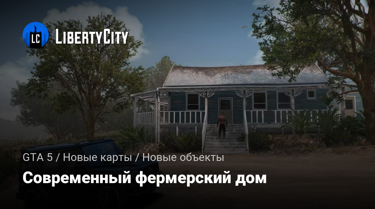Дом выполнен в стиле современного фермерского дома (Modern Farmhouse). Здание одноэтажное, с широкой верандой, опоясывающей фасад. Фасад окрашен в выцветший синий цвет, что придаёт дому винтажный и уютный вид. Крыша скатная, с заметными следами износа и старения. Входная группа оформлена лестницей с белыми перилами, которые гармонируют с декоративными элементами на веранде. Окна прямоугольные, с белыми рамами, что подчёркивает классический стиль. Вокруг дома растут зелёные кустарники и деревья, создавая атмосферу уединённости и спокойствия. Общий вид дома сочетает простоту, функциональность и уют сельской жизни с нотками современного дизайна.