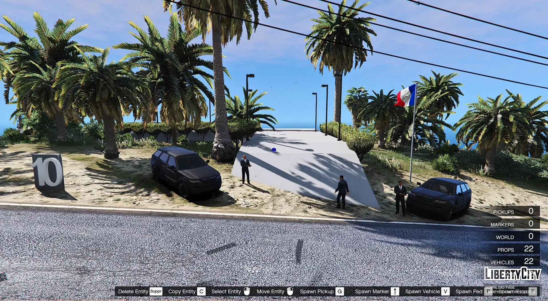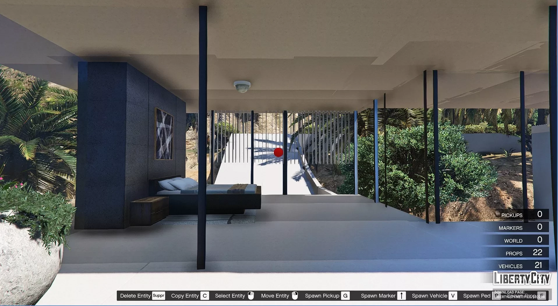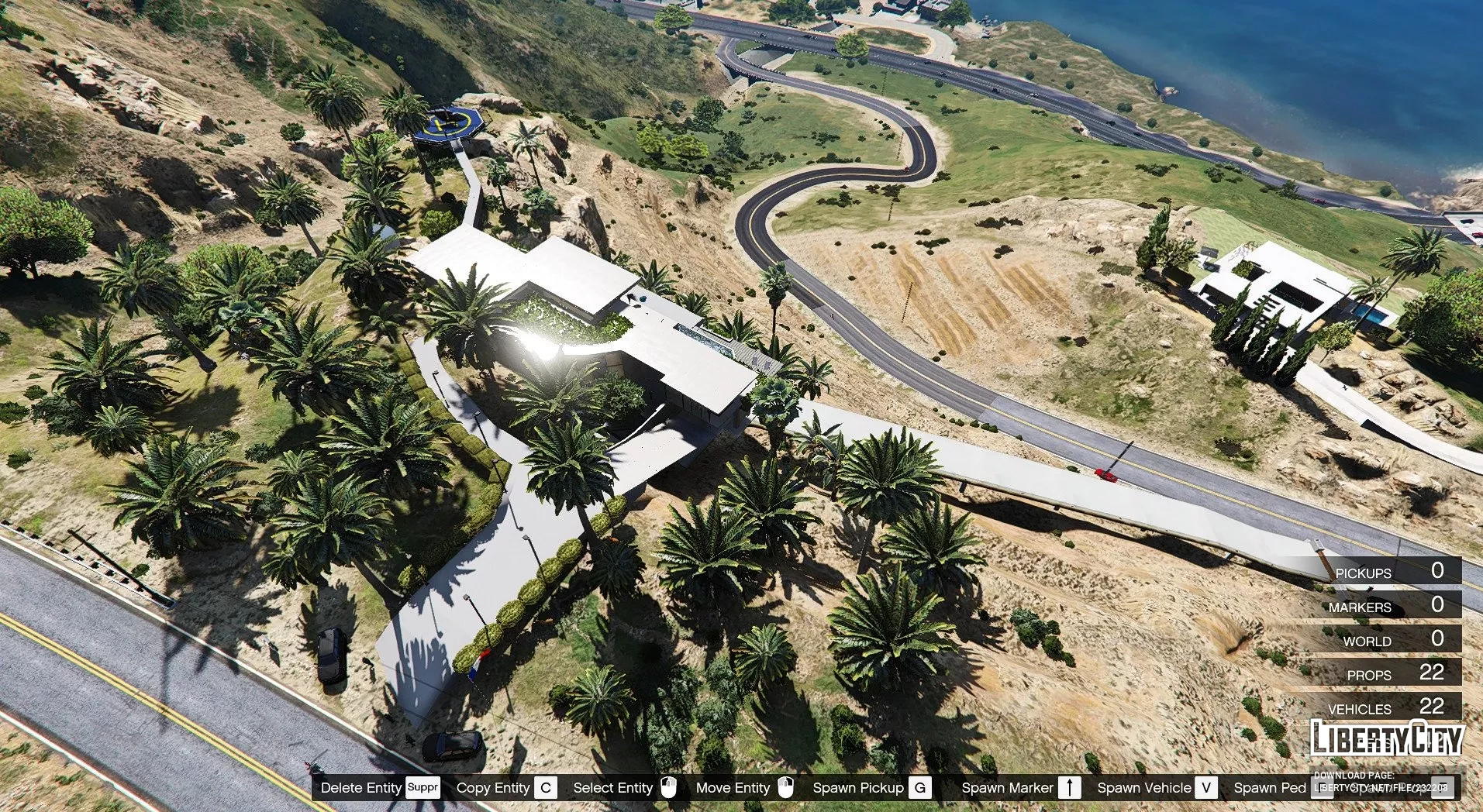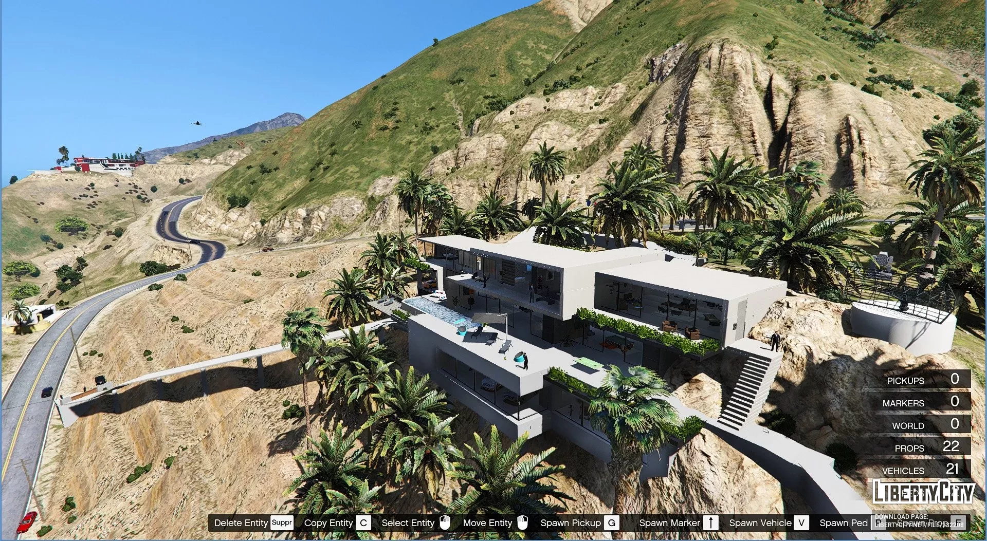 На одном из уровней предусмотрен гараж, а также вертолётная площадка, что подчёркивает статус и эксклюзивность объекта. Входная группа оформлена лаконично: к дому ведёт широкая подъездная дорога, украшенная зелёными насаждениями и современными фонарями. Рядом установлен минималистичный номер дома.