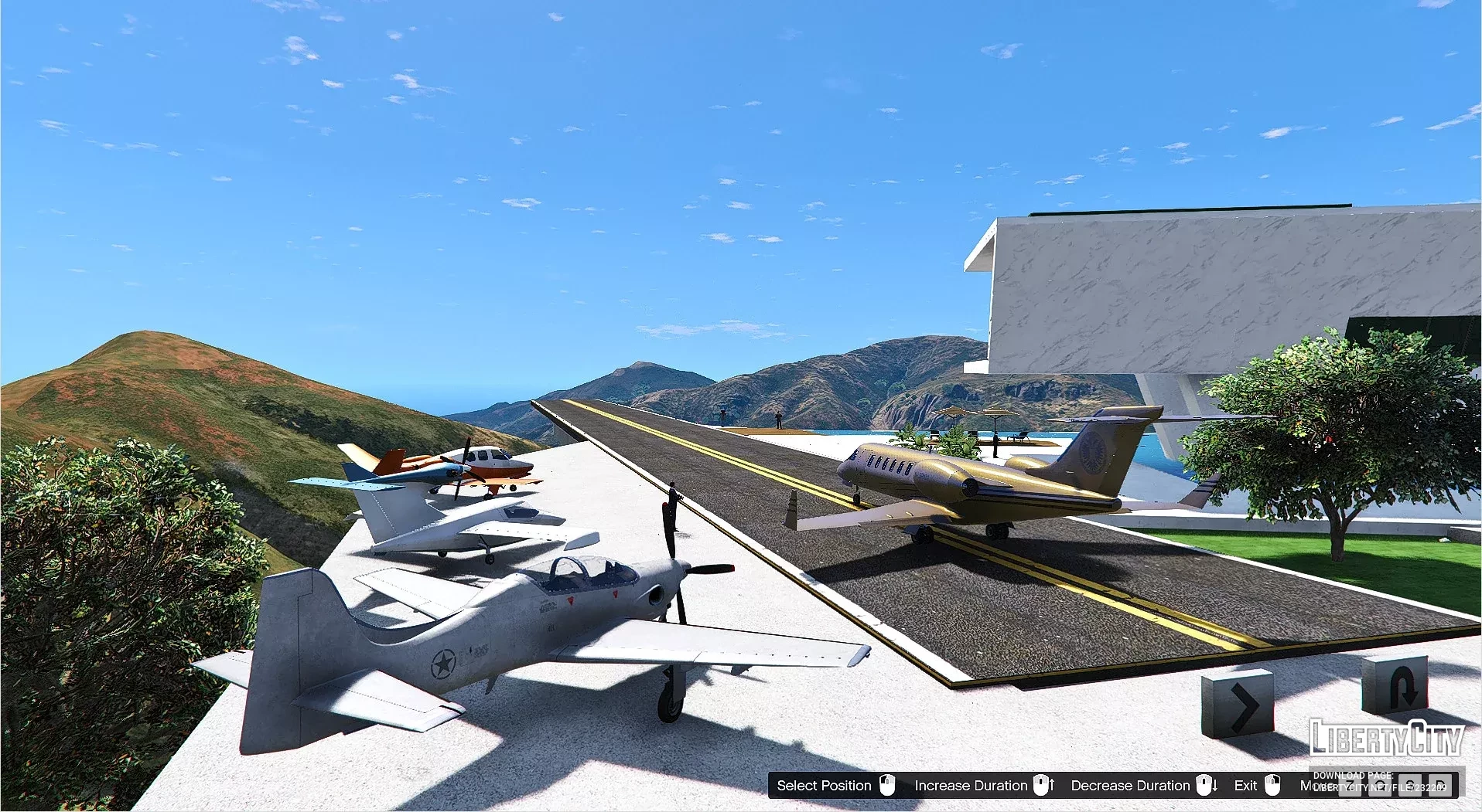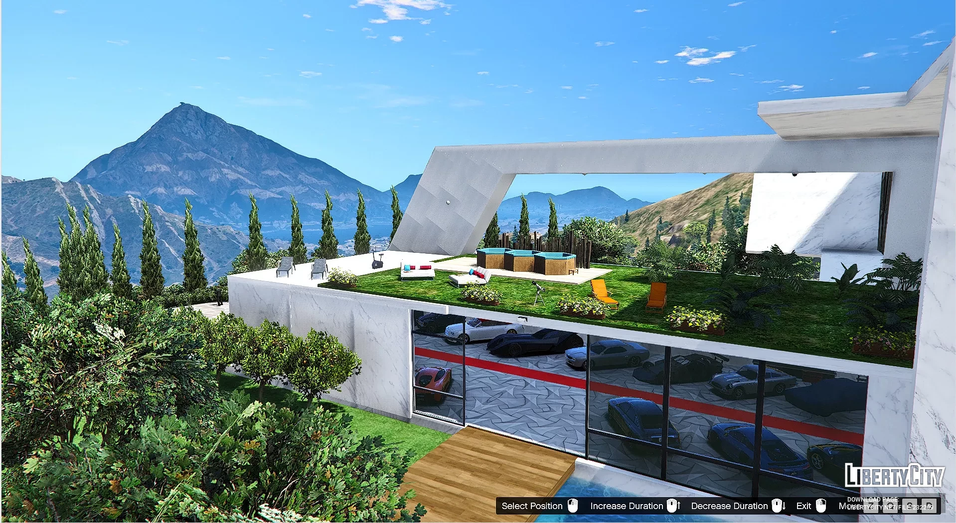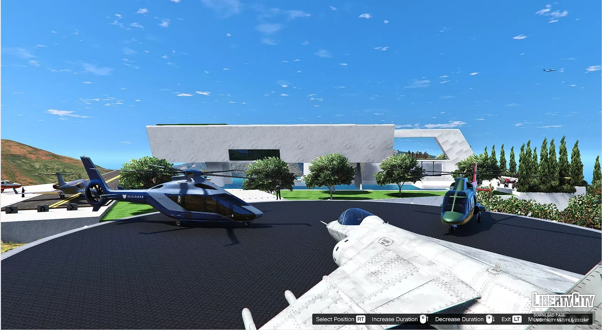 На территории имеется отдельная большая круглая вертолётная площадка, а также частная взлётно-посадочная полоса с несколькими самолётами, что подчёркивает статус владельца и его любовь к роскоши и свободе передвижения. В нижней части особняка находится огромный гараж с коллекцией эксклюзивных автомобилей, который отделён от внешнего пространства панорамными окнами.
