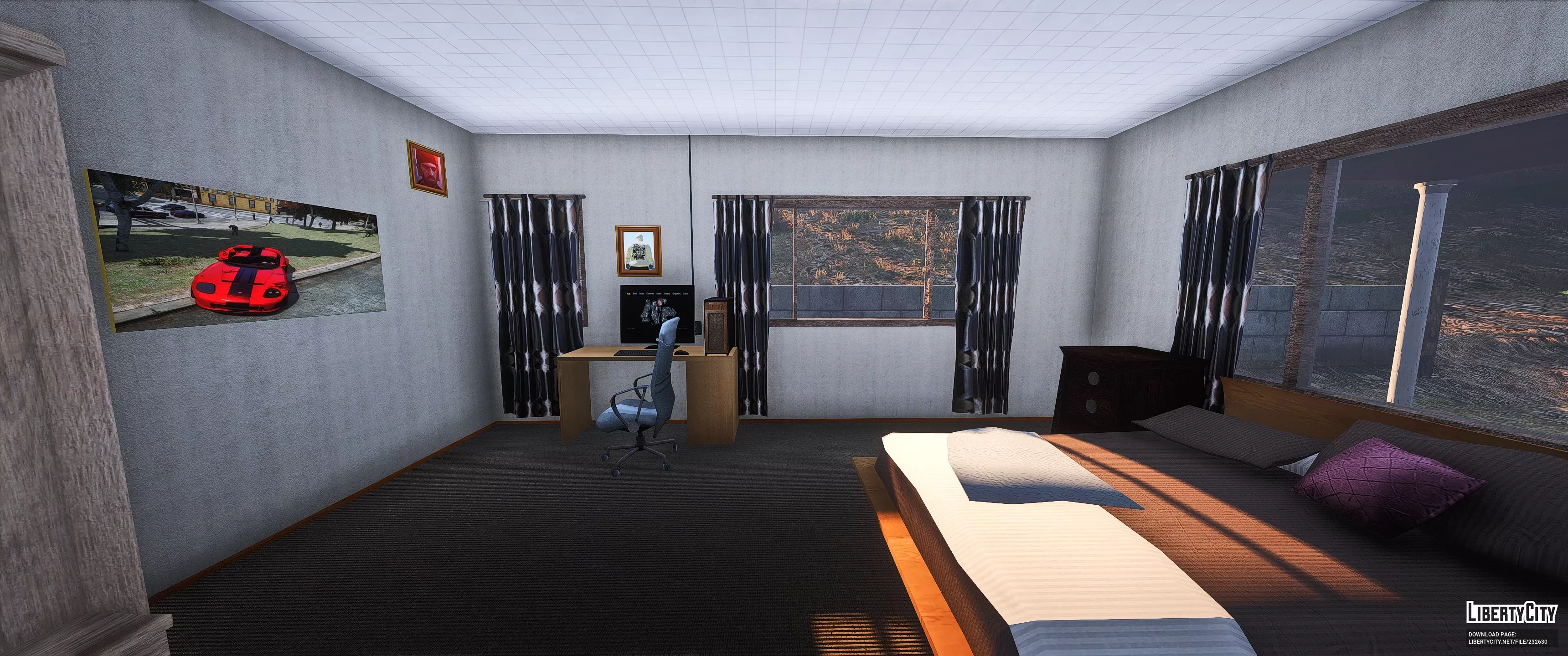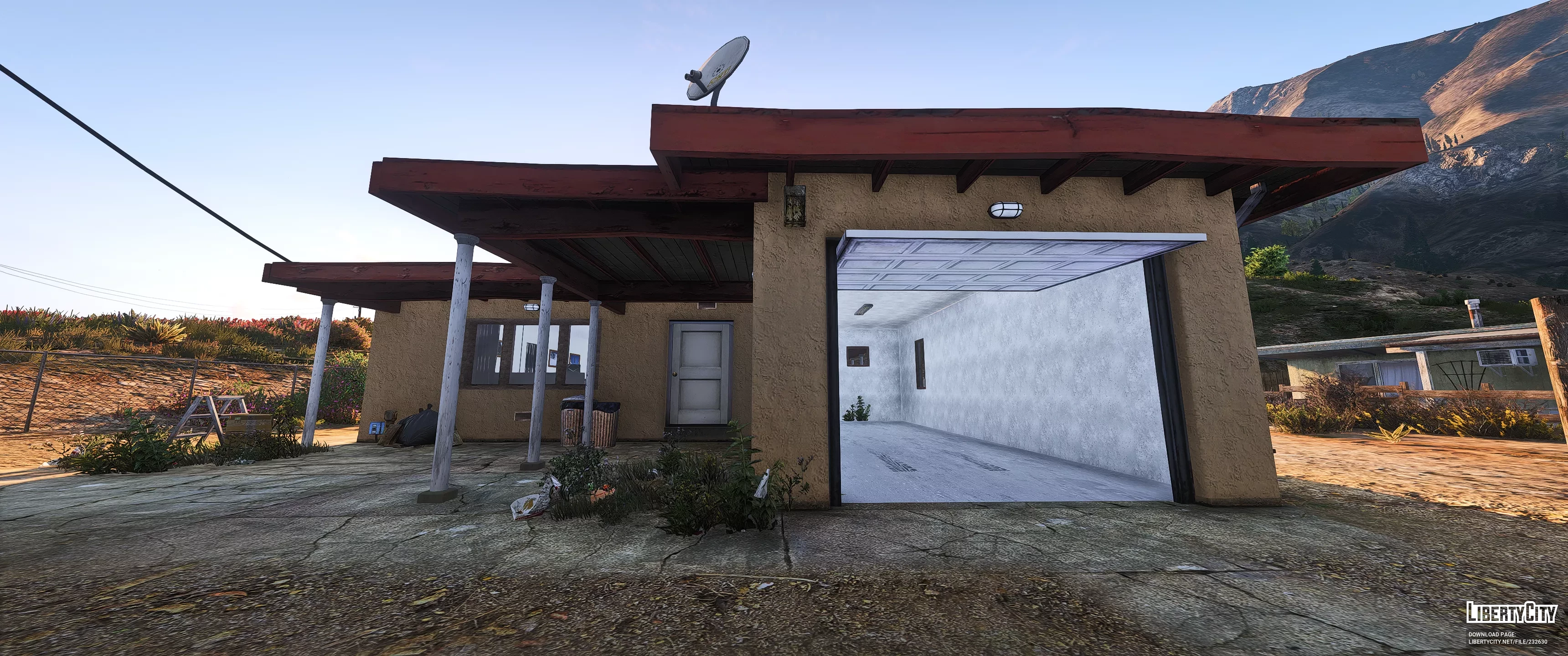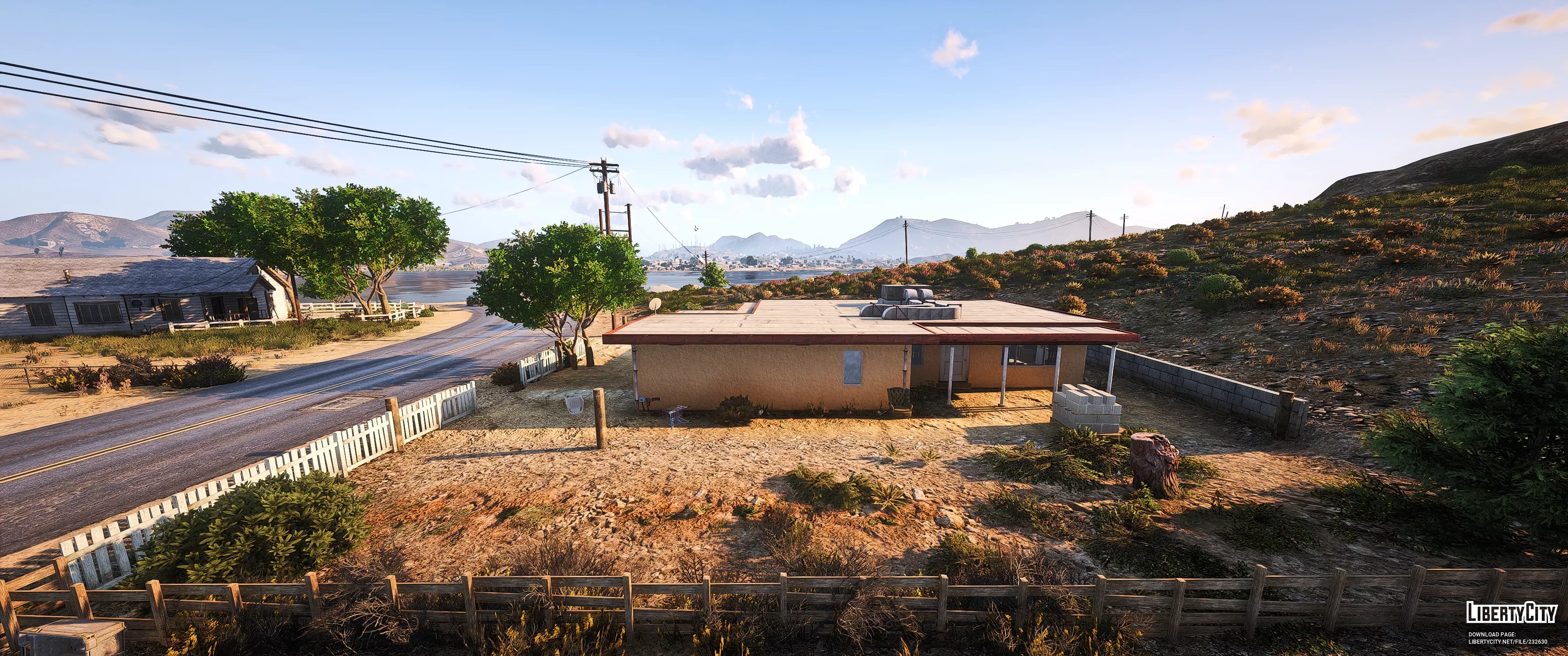 Небольшой загородный дом расположен у подножия живописных гор. Здание одноэтажное, с плоской крышей и выступающими красными козырьками. Стены дома окрашены в светло-коричневый цвет. Перед домом находится участок с песчаной почвой, окружённый невысоким белым деревянным забором, местами сломанным. Во дворе растёт зелёное дерево, которое даёт тень на часть территории. Рядом с домом стоят кусты и низкорослые растения, а вдали виднеются цветущие поля. Атмосфера спокойная и сельская, вокруг много природы и открытого пространства.