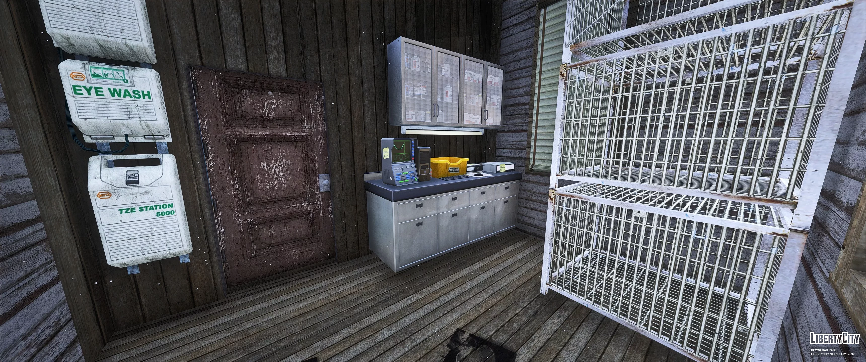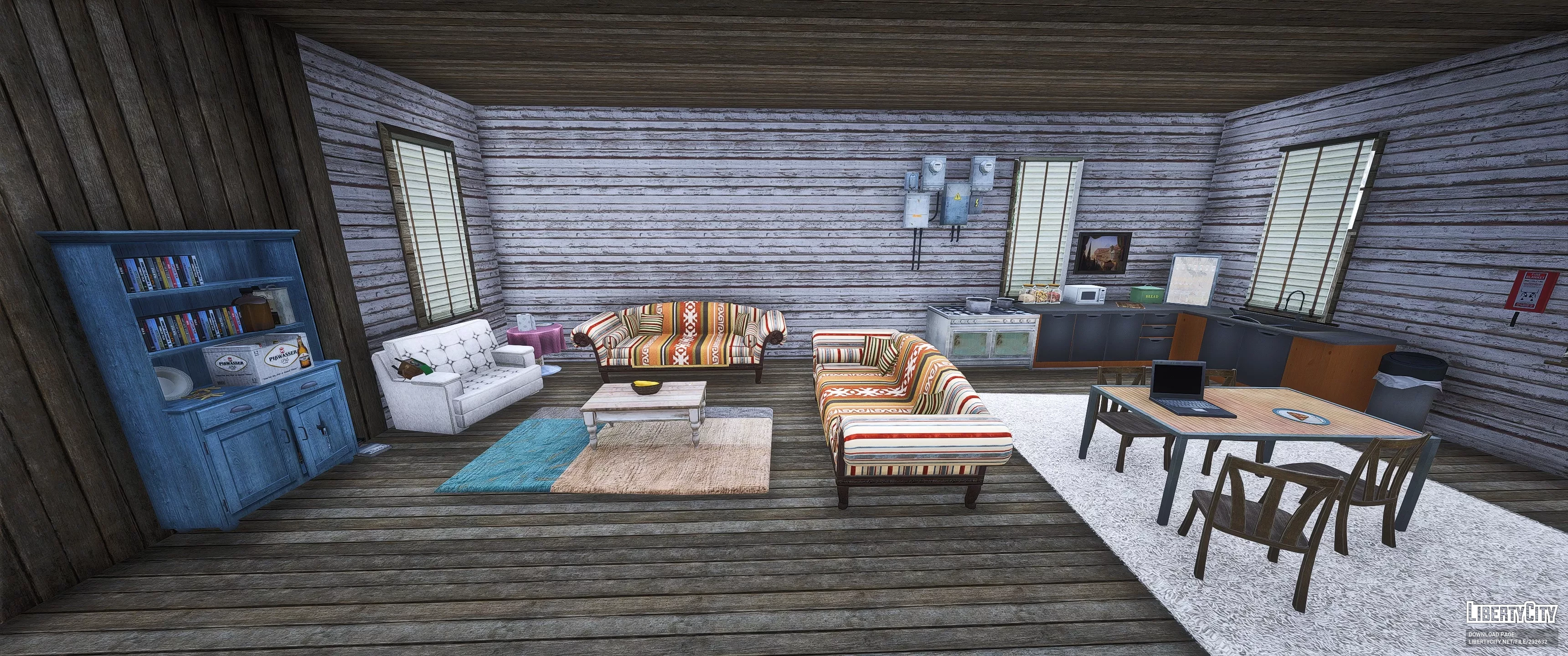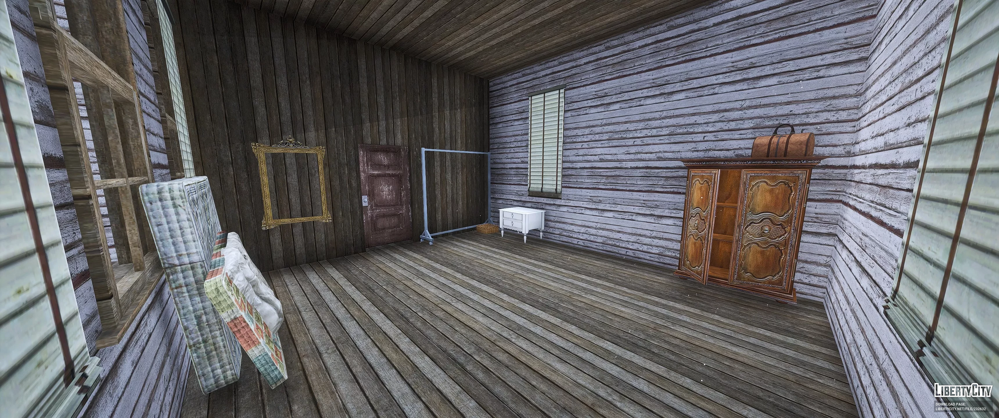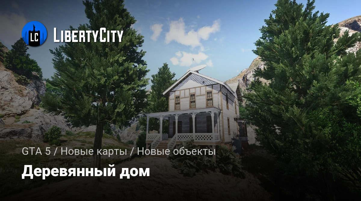 Деревянный дом расположен на склоне среди живописных гор и окружён высокими хвойными деревьями и густой зелёной растительностью. Здание выполнено в классическом стиле: светлые деревянные стены, двухскатная крыша и просторная веранда с резными перилами и лестницей, ведущей ко входу. Окна дома украшены ставнями, а сам дом выглядит уютно и гармонично вписывается в природный ландшафт. Вокруг дома раскинулась зелёная поляна с кустарниками и цветами, создавая атмосферу уединения и спокойствия.