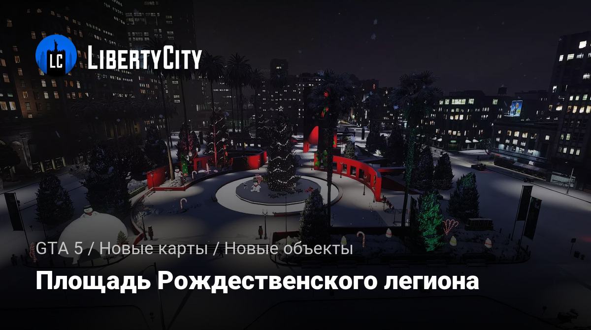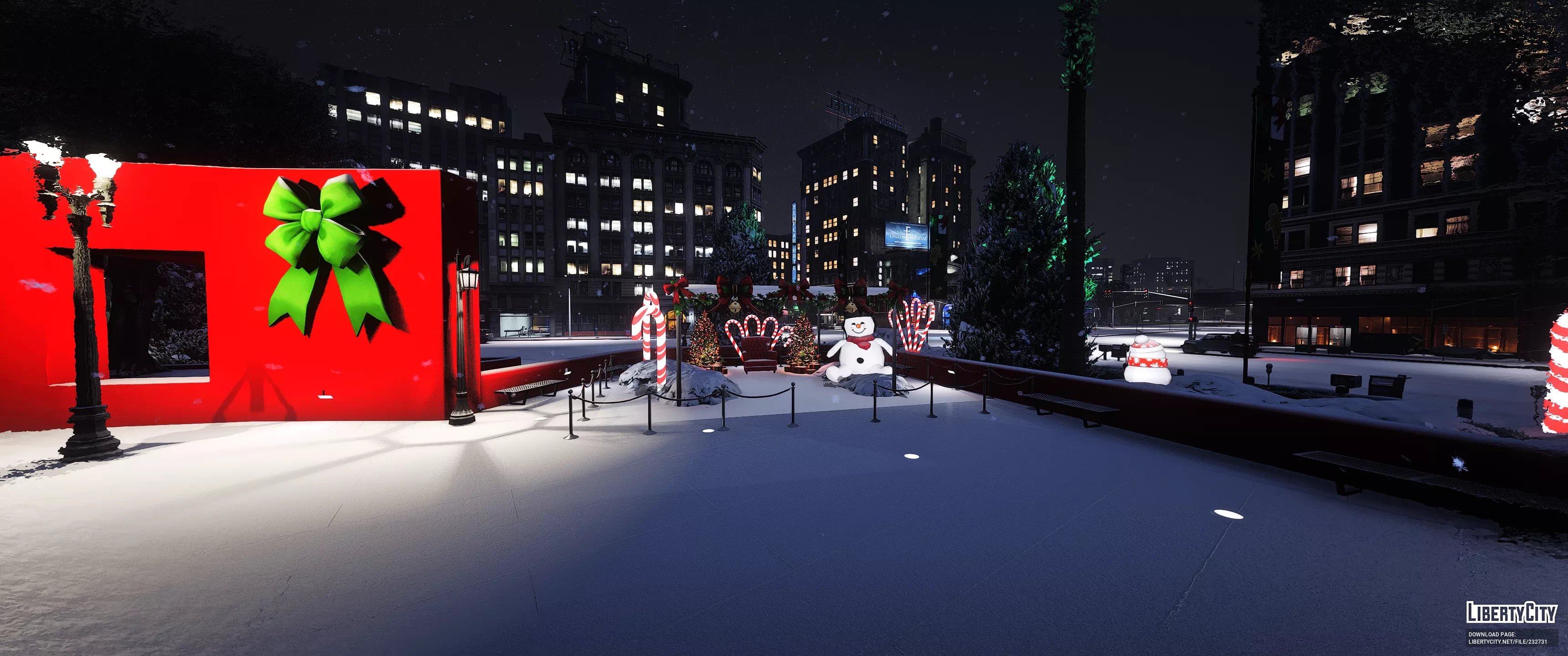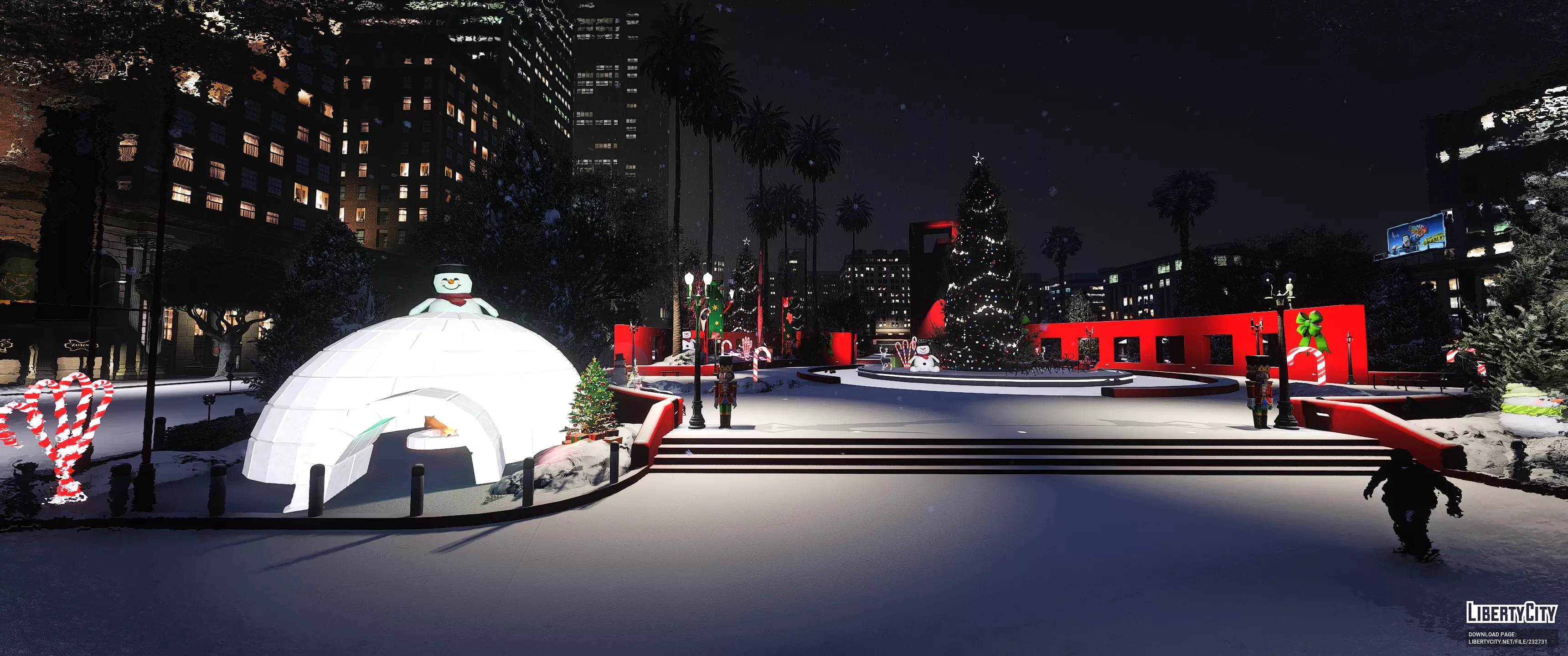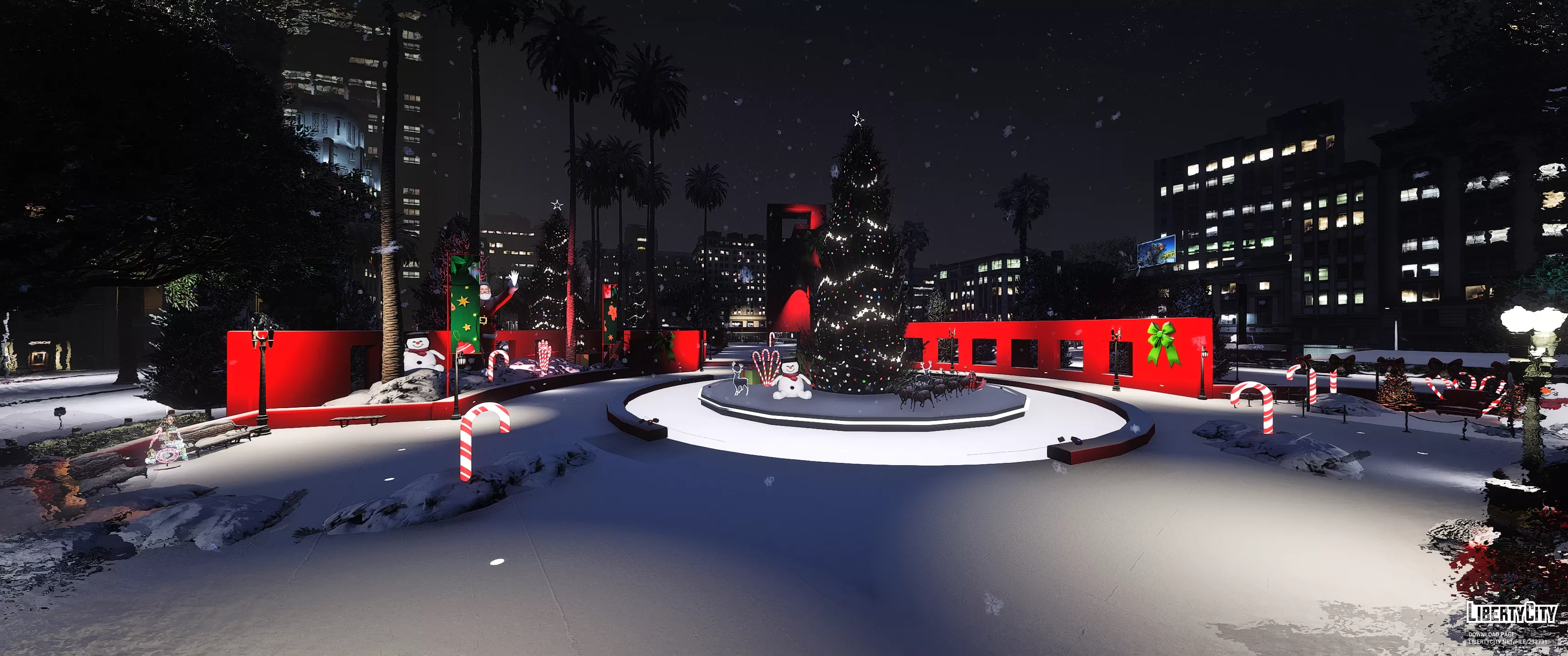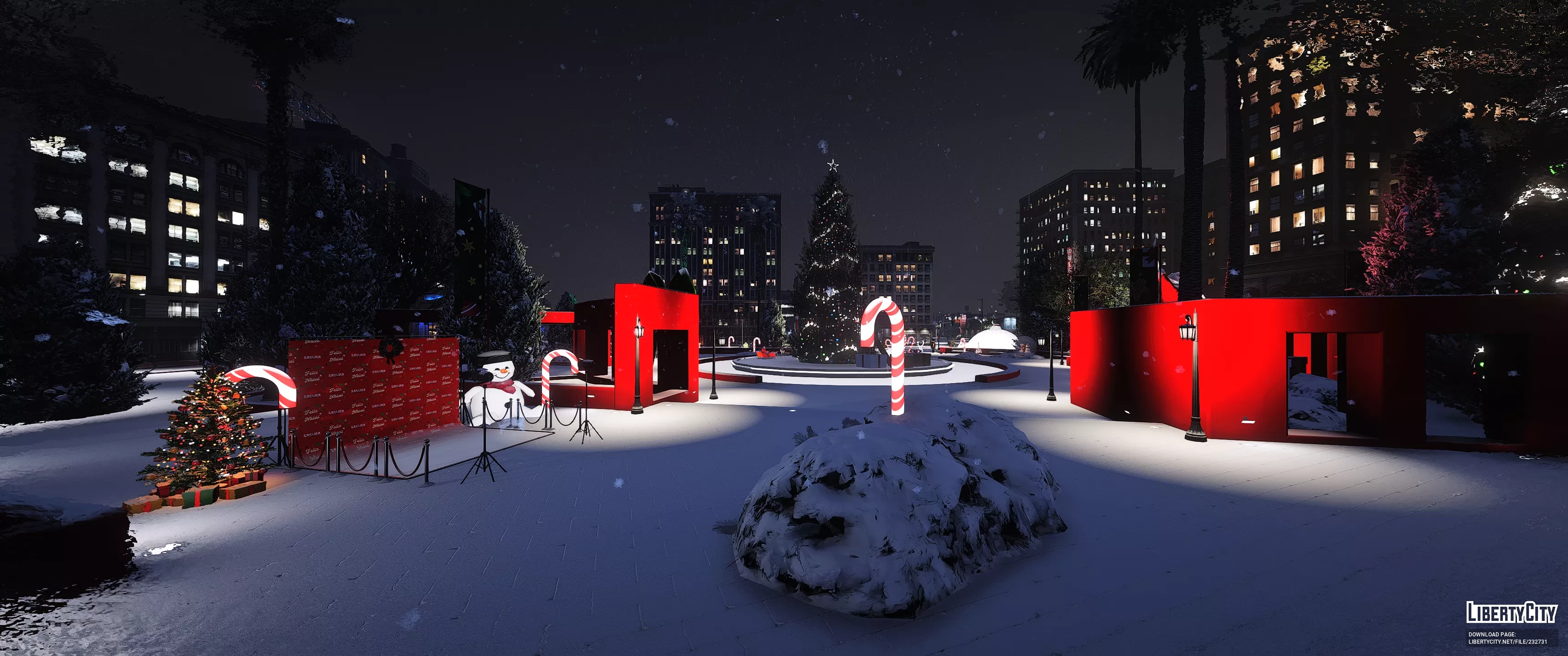 Площадь Legion Square полностью покрыта снежным покровом, что придаёт ей настоящую зимнюю атмосферу. В центре площади возвышается большая рождественская ёлка, украшенная гирляндами и яркими огнями. Вокруг ёлки расположены декоративные арки красного цвета, а по всей территории расставлены праздничные украшения: светящиеся трости, подарочные коробки, фигуры снеговиков и оленей.