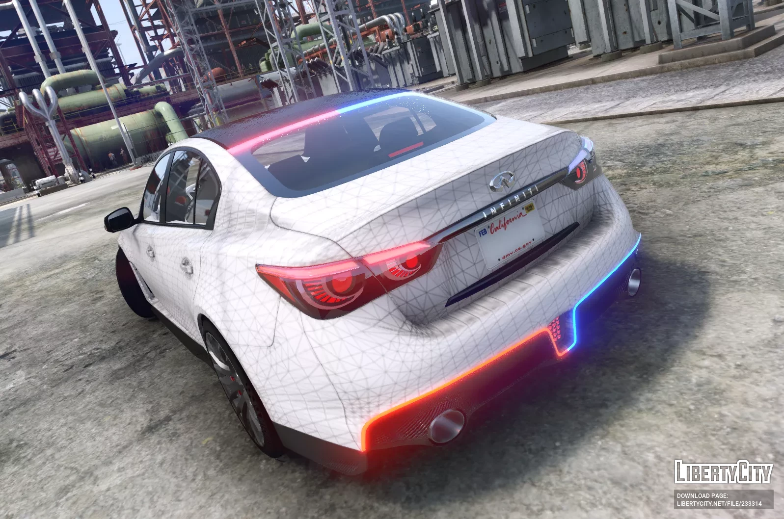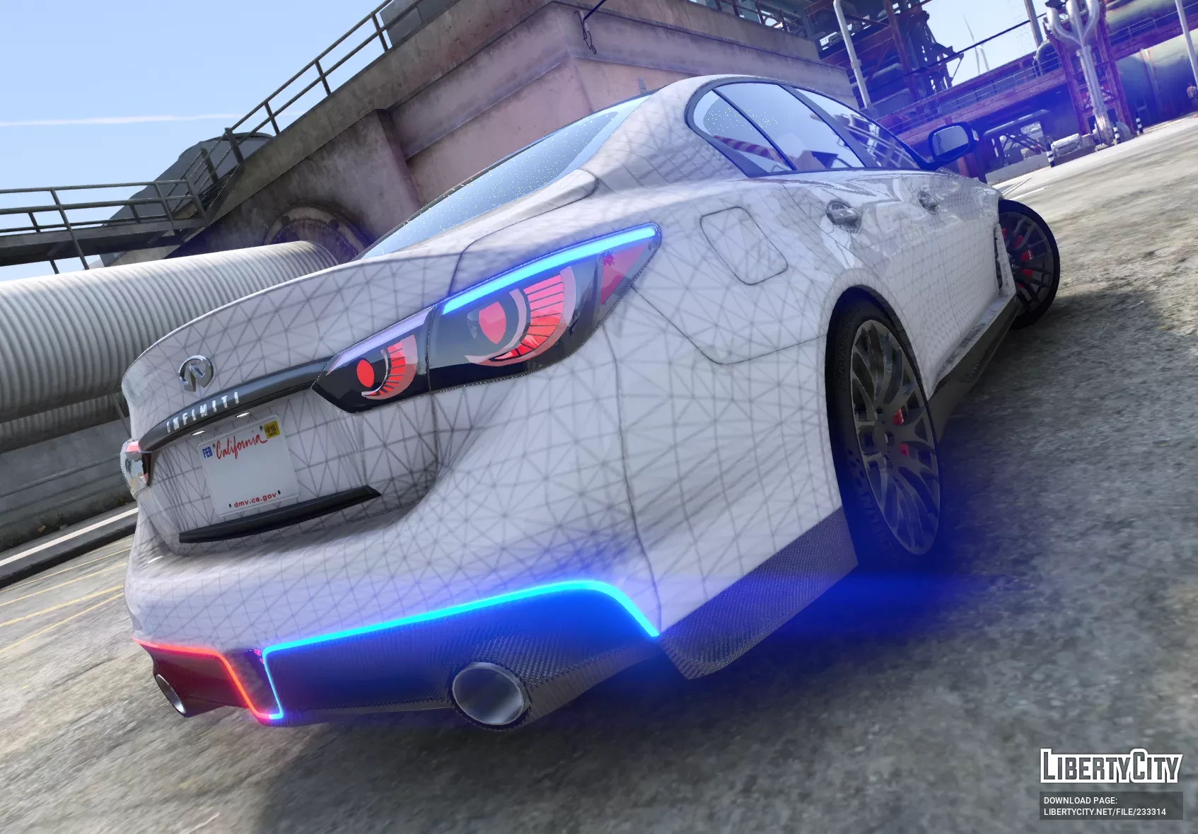 Infiniti Q50 Glasslight отличается современным и стильным внешним видом. Кузов автомобиля окрашен в белый цвет с уникальной текстурой, напоминающей сетку или кристаллический узор. Передняя часть украшена агрессивной оптикой с яркой синей и красной подсветкой, что придаёт автомобилю футуристический вид и подчёркивает его индивидуальность. Решётка радиатора выполнена в фирменном стиле Infiniti, с крупной эмблемой бренда по центру. Бампер имеет выразительные аэродинамические элементы и светодиодную полосу, которая подсвечивается синим и красным цветом.