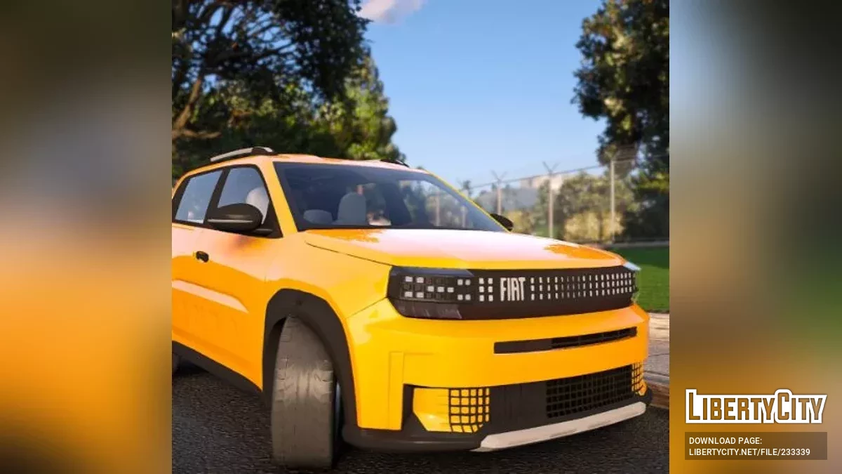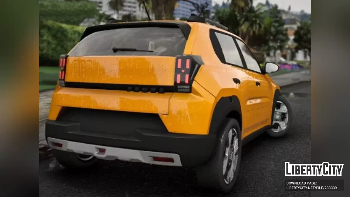 2025 Fiat Panda Grande имеет современный и яркий внешний вид. Кузов выполнен в насыщенном жёлтом цвете, что сразу привлекает внимание. Передняя часть автомобиля отличается массивной решёткой радиатора с крупными пиксельными элементами и логотипом FIAT по центру. Фары интегрированы в решётку и имеют прямоугольную форму, придавая автомобилю футуристичный облик.