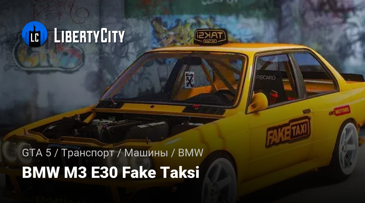 BMW M3 E30 Fake Taksi — это ярко-жёлтый спортивный автомобиль с агрессивным внешним видом. На кузове выделяются крупные наклейки с логотипом "FAKE TAXI" на дверях и капоте. На крыше установлен классический таксичный фонарь с надписью "TAKSI". Передняя часть машины лишена стандартного бампера и капота, что подчёркивает гоночный стиль и позволяет видеть мощный двигатель. Фары оснащены белыми светодиодными ангельскими глазками. Диски белого цвета, спортивные, с низкопрофильной резиной. На боковых окнах и сиденьях видны надписи "RECARO", указывающие на установку спортивных кресел. Автомобиль украшен дополнительными наклейками "ARC MOTORS".