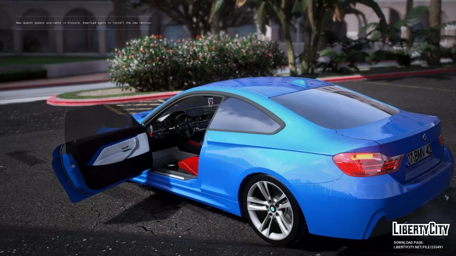 2014 BMW 4 Серии Coupe обладает элегантным и спортивным внешним видом. Купе выделяется агрессивной передней частью с фирменными двойными "ноздрями" решётки радиатора и выразительными светодиодными фарами с характерными ангельскими глазками. Кузов окрашен в яркий синий цвет, что подчёркивает динамичный характер автомобиля. Линия крыши плавно ниспадает к корме, создавая стремительный силуэт. На переднем бампере расположены большие воздухозаборники и противотуманные фары. Автомобиль оснащён стильными легкосплавными дисками и спортивными зеркалами заднего вида.