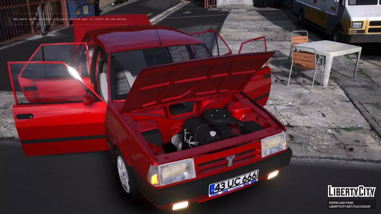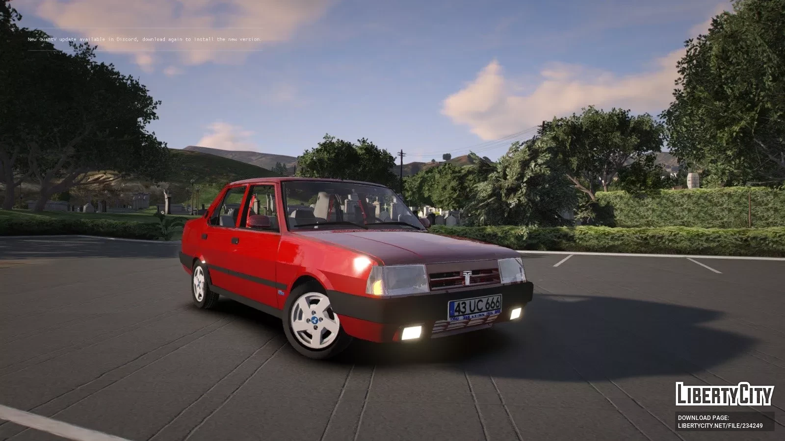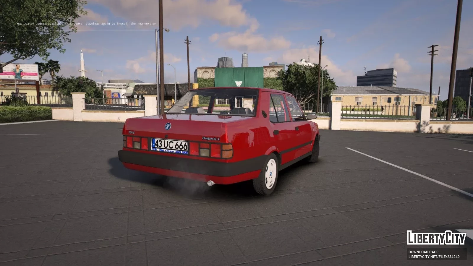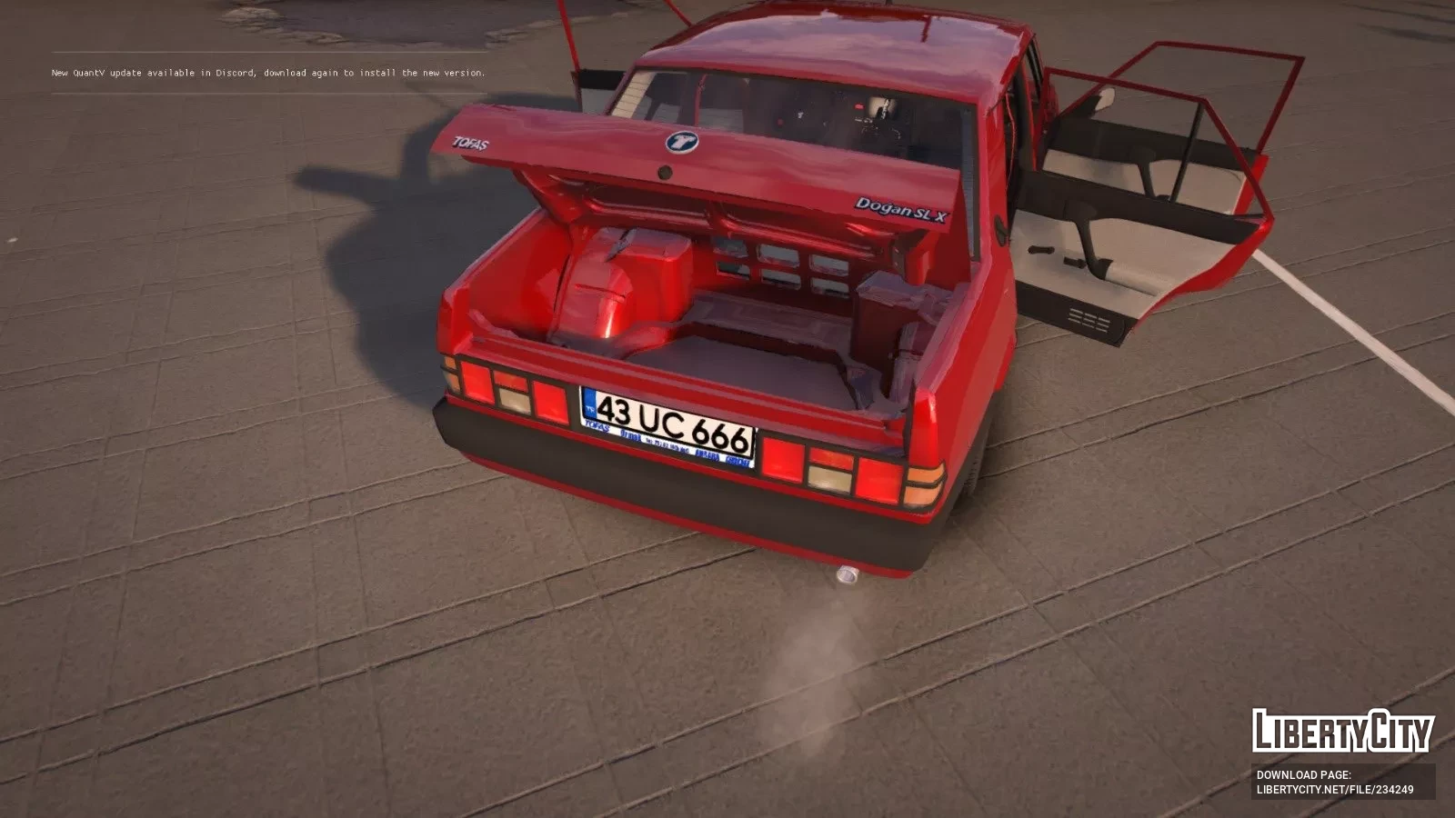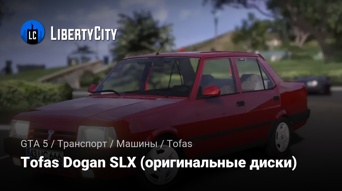 Tofas Dogan SLX — это классический седан 90-х годов с характерным угловатым дизайном. Кузов автомобиля окрашен в ярко-красный цвет, что придаёт ему заметный и привлекательный вид. Передняя часть выделяется прямоугольными фарами и широкой чёрной решёткой радиатора с фирменным логотипом Tofas по центру. Бампера выполнены из чёрного пластика и имеют строгие формы, а под ними расположены противотуманные фары.