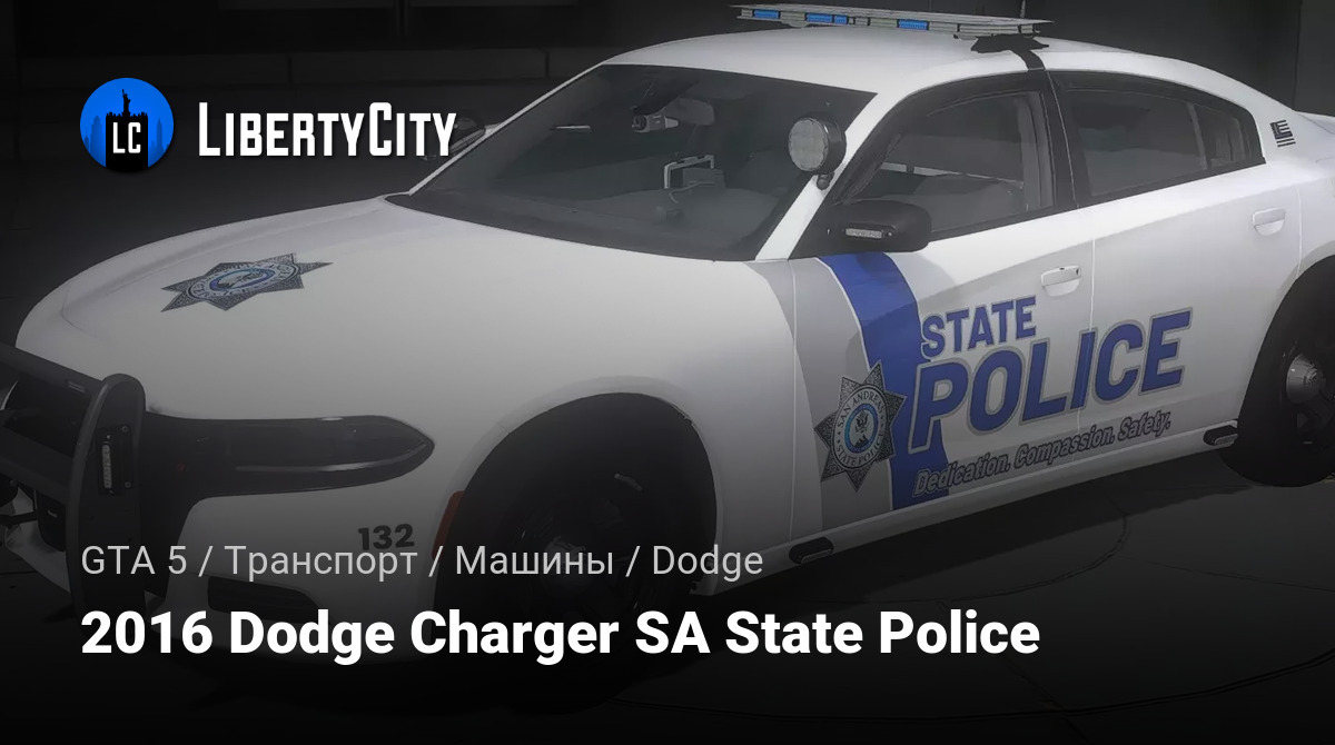 - На дверях размещены крупные надписи "STATE POLICE" с эмблемой департамента и слоганом "Dedication. Compassion. Safety.", что подчёркивает официальный статус автомобиля.