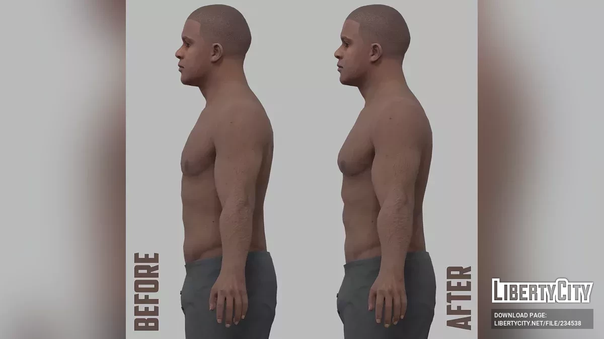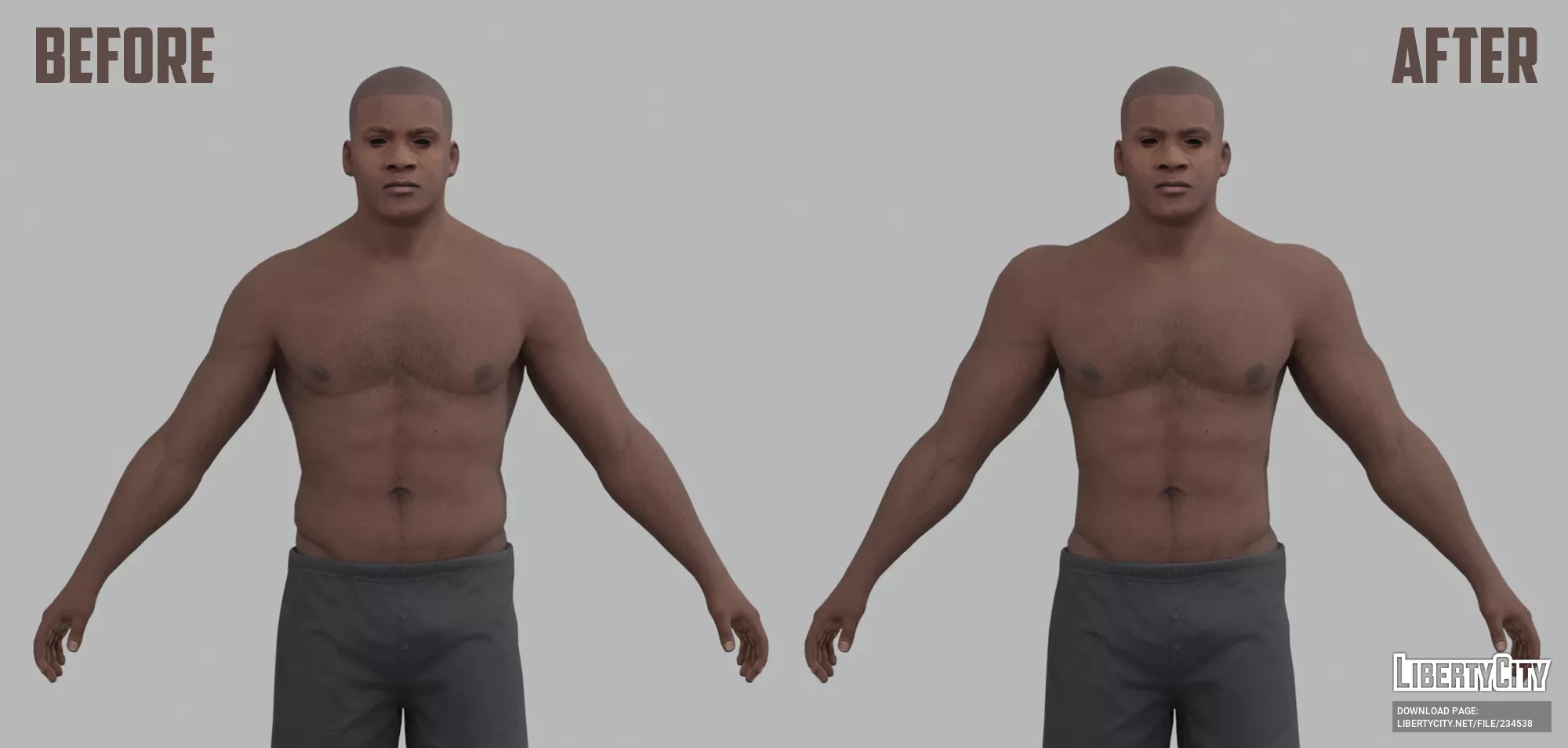 Мод Bulked Up Franklin для GTA 5 добавляет новому персонажу более мускулистую модель тела. В комплекте также идёт текстура безволосой груди, что делает образ ещё более уникальным. Такой мод понравится тем, кто хочет изменить внешний вид Франклина и сделать его более спортивным.