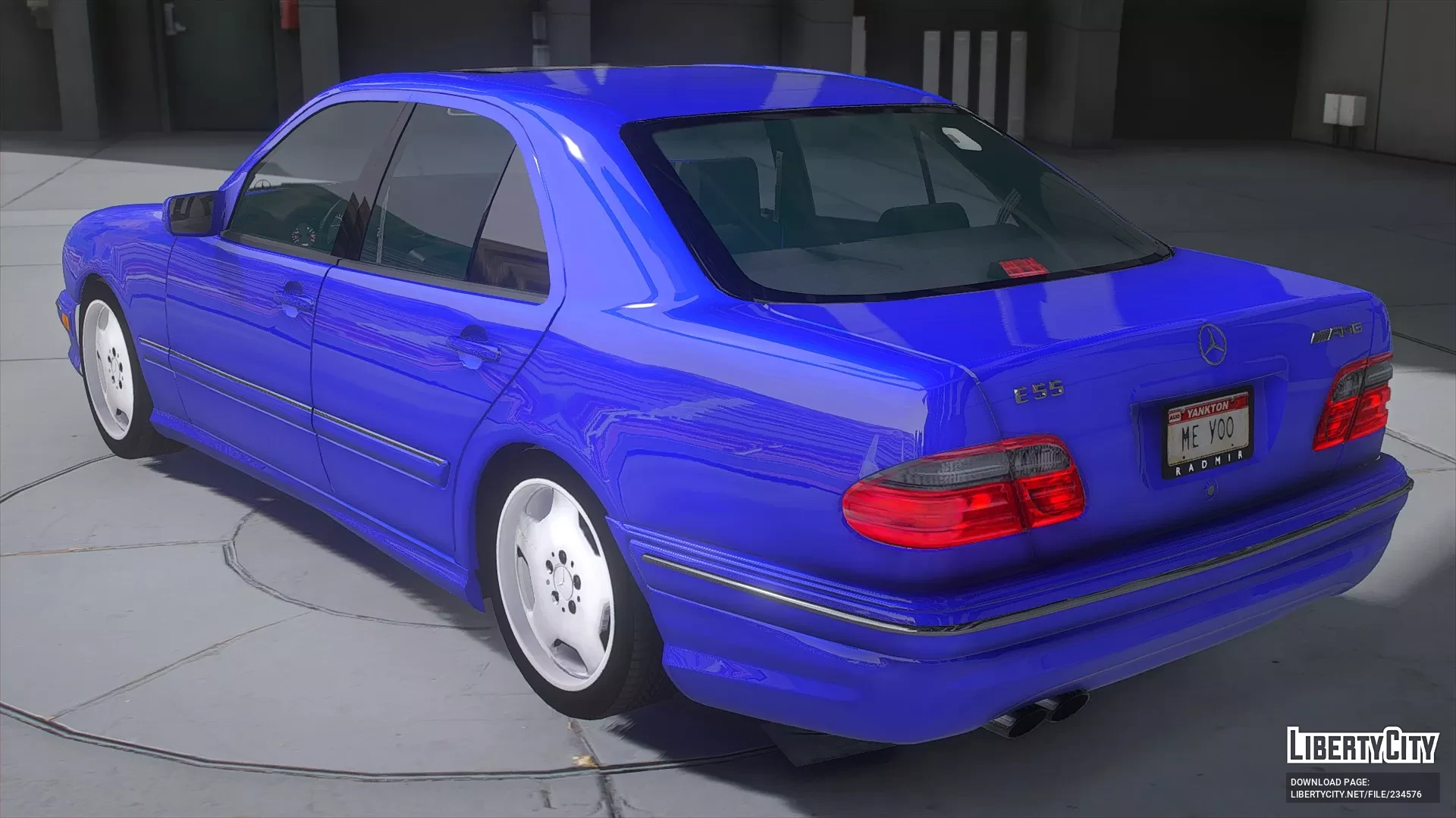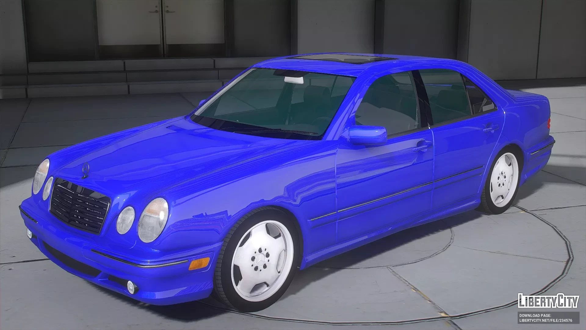 Mercedes-Benz E55 AMG (W210) для GTA 5. Передняя часть автомобиля характеризуется большими круглыми фарами с интегрированными противотуманными фарами. Решетка радиатора имеет спортивный вид, с хромированной окантовкой и серебристыми вертикальными по...