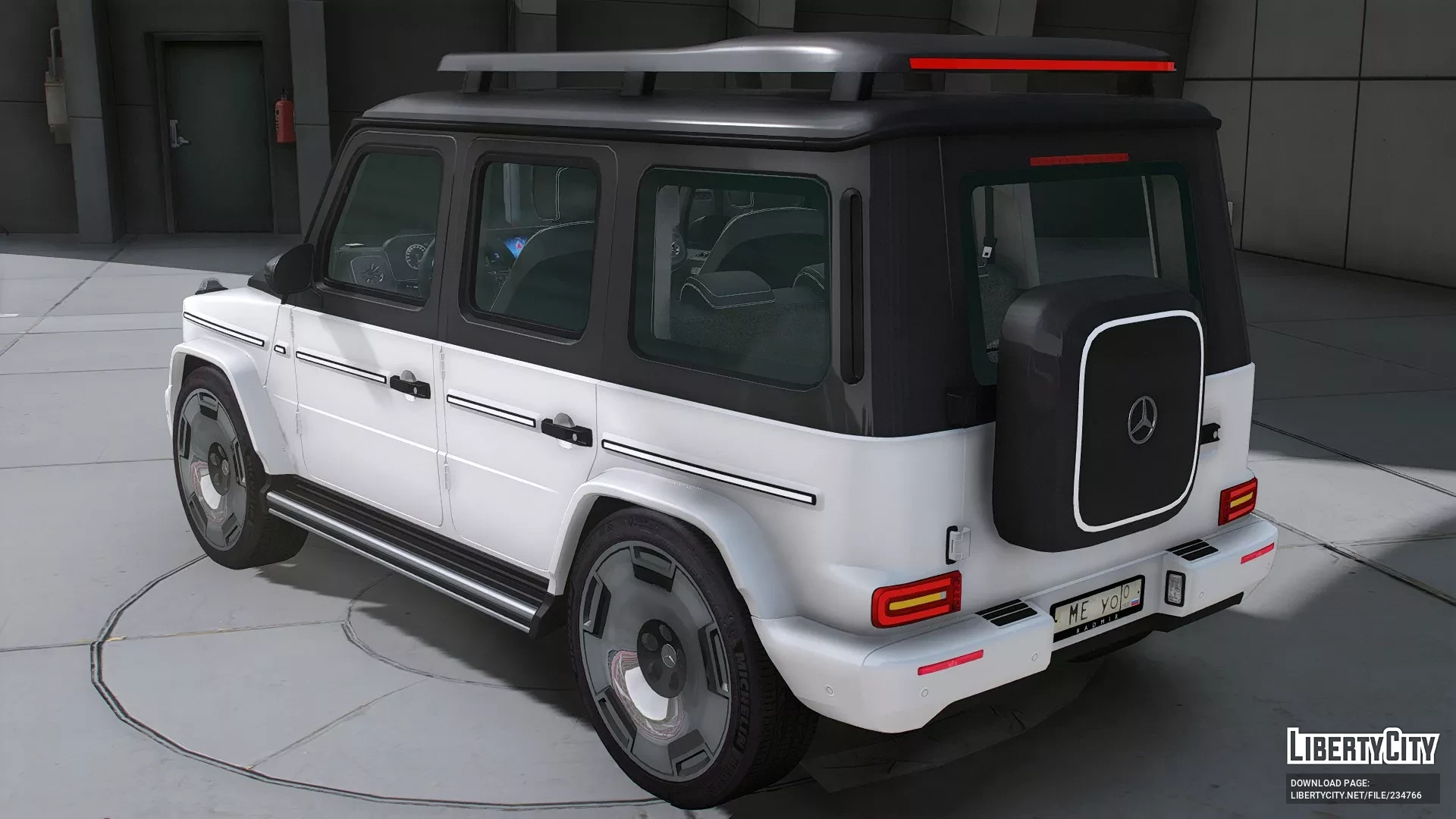 - Запасное колесо с чёрным чехлом и белой окантовкой, на котором расположен логотип Mercedes-Benz.