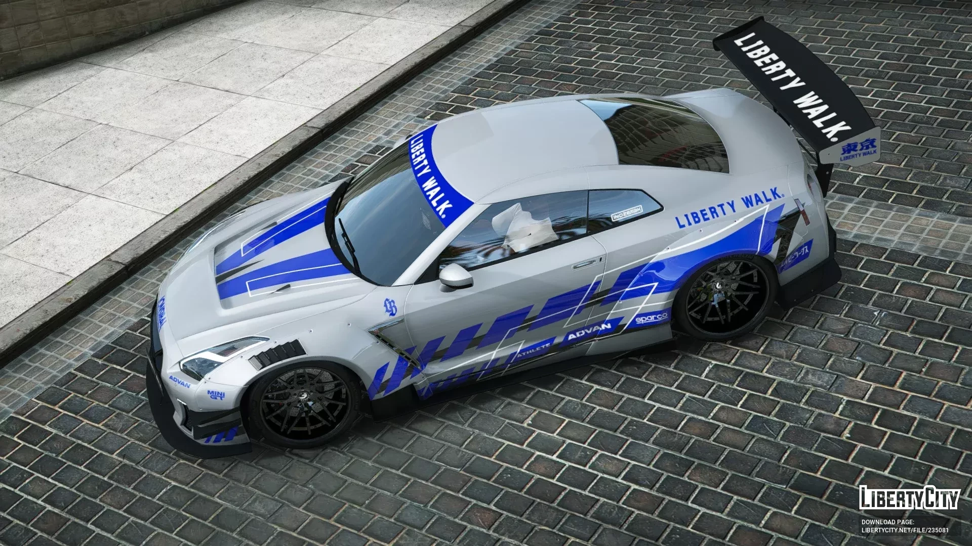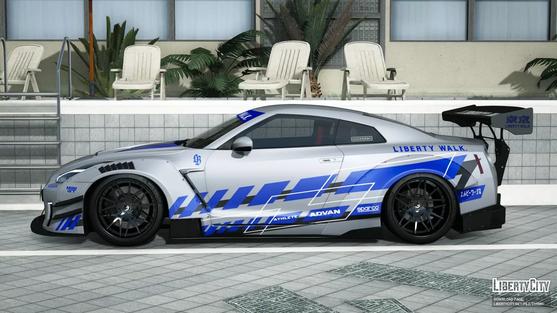- Капот с агрессивными аэродинамическими выштамповками и фирменными наклейками Liberty Walk подчёркивает гоночный стиль.