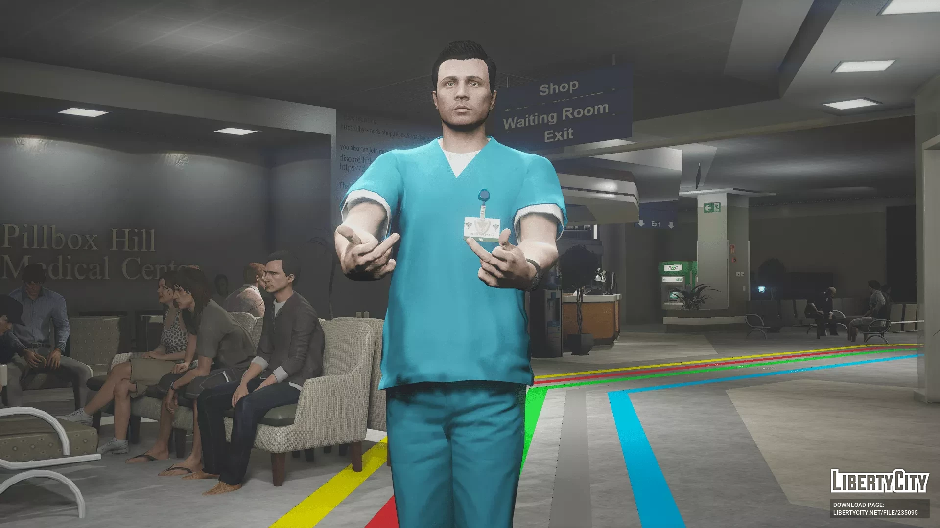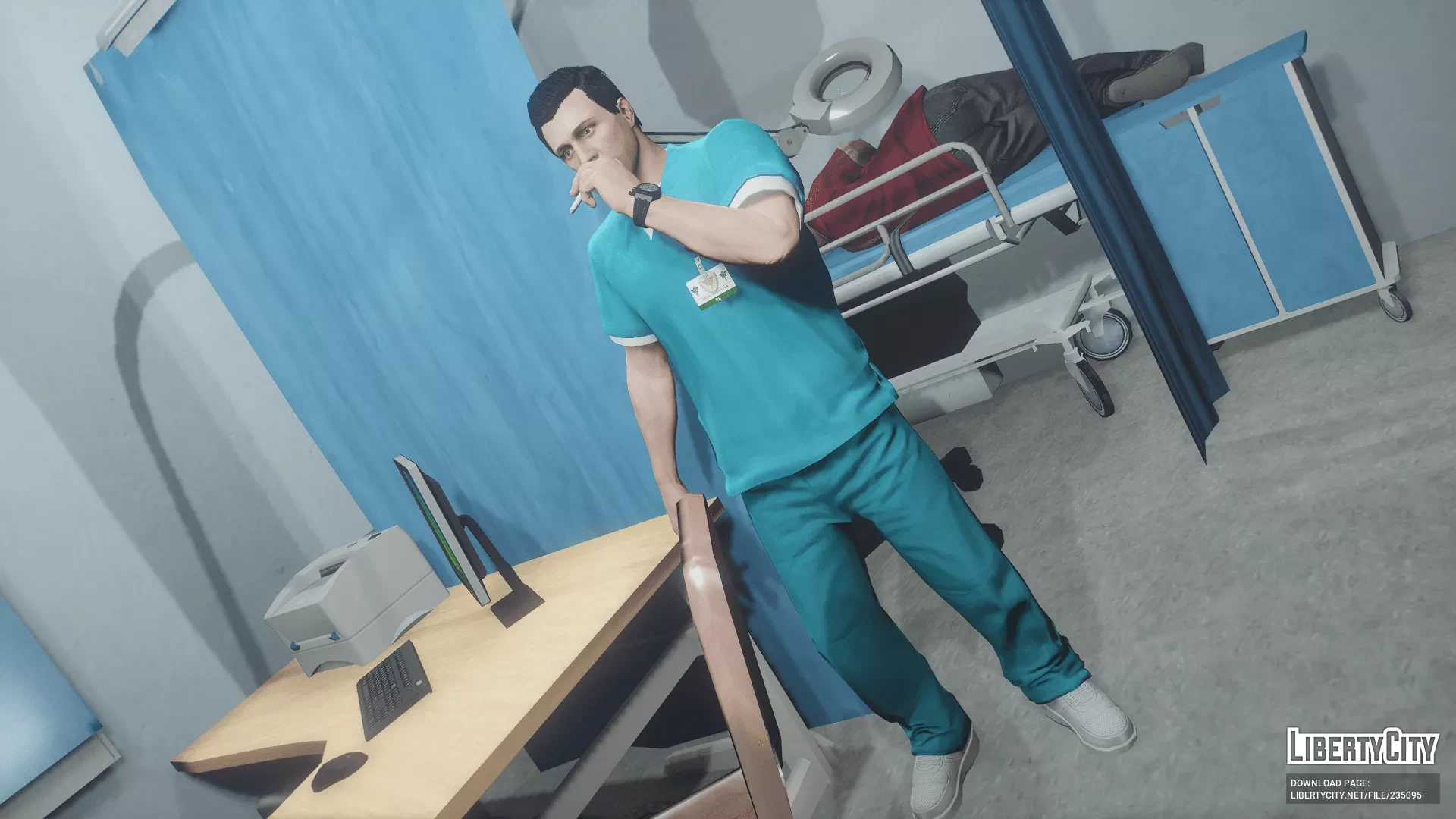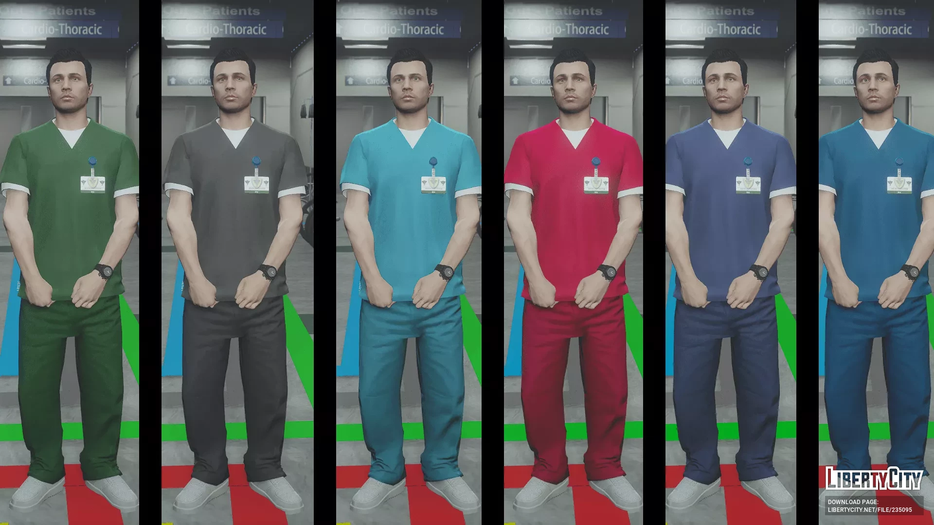 Мод Hospital Scrubs for MP Male добавляет в GTA 5 медицинские костюмы для мужских персонажей. Эти скрабы подойдут для роли медбрата, врача или даже подпольного хирурга — используйте их как угодно. В комплекте есть аксессуар-бейджик, который можно перекрасить под любое имя, а также 6 цветовых вариантов.
