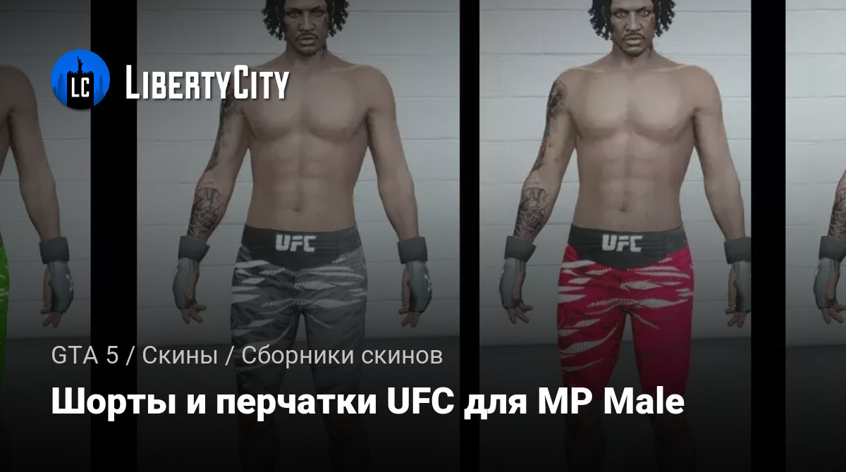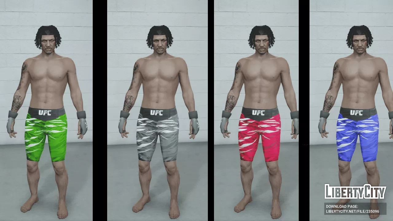 Мод UFC Shorts and Gloves for MP Male добавляет в GTA 5 комплект шорт и перчаток в стиле UFC для мужских персонажей. Этот набор идеально подойдёт для уличных боёв или ролевых сценок, связанных с боями без правил. В комплекте четыре цветовых варианта, чтобы каждый мог выбрать свой стиль.